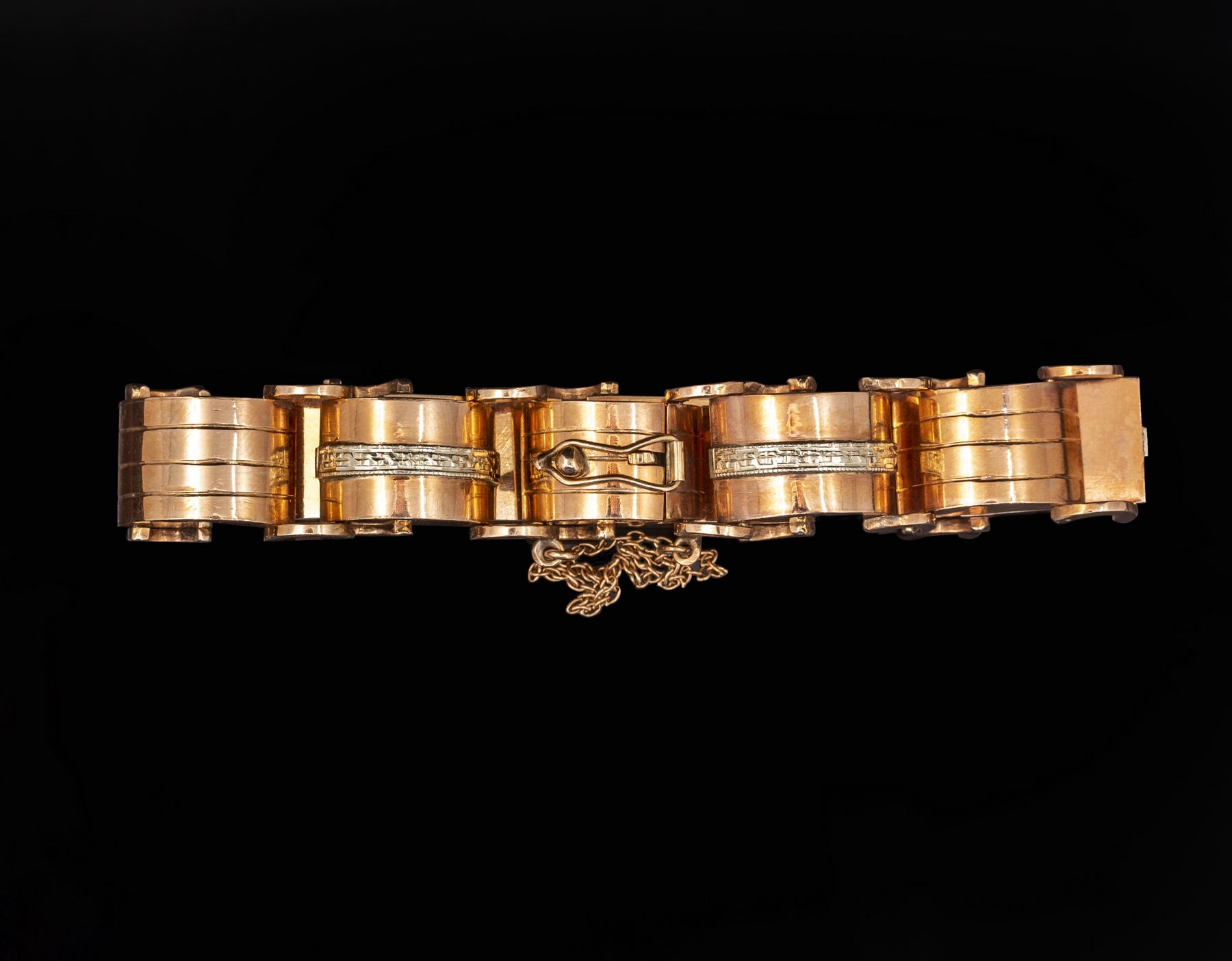 14k gold bracelet. Length: 17.5 cm, width: 13 mm, weight: 26.8 grams. Hallmarked. The safety chain is detached.