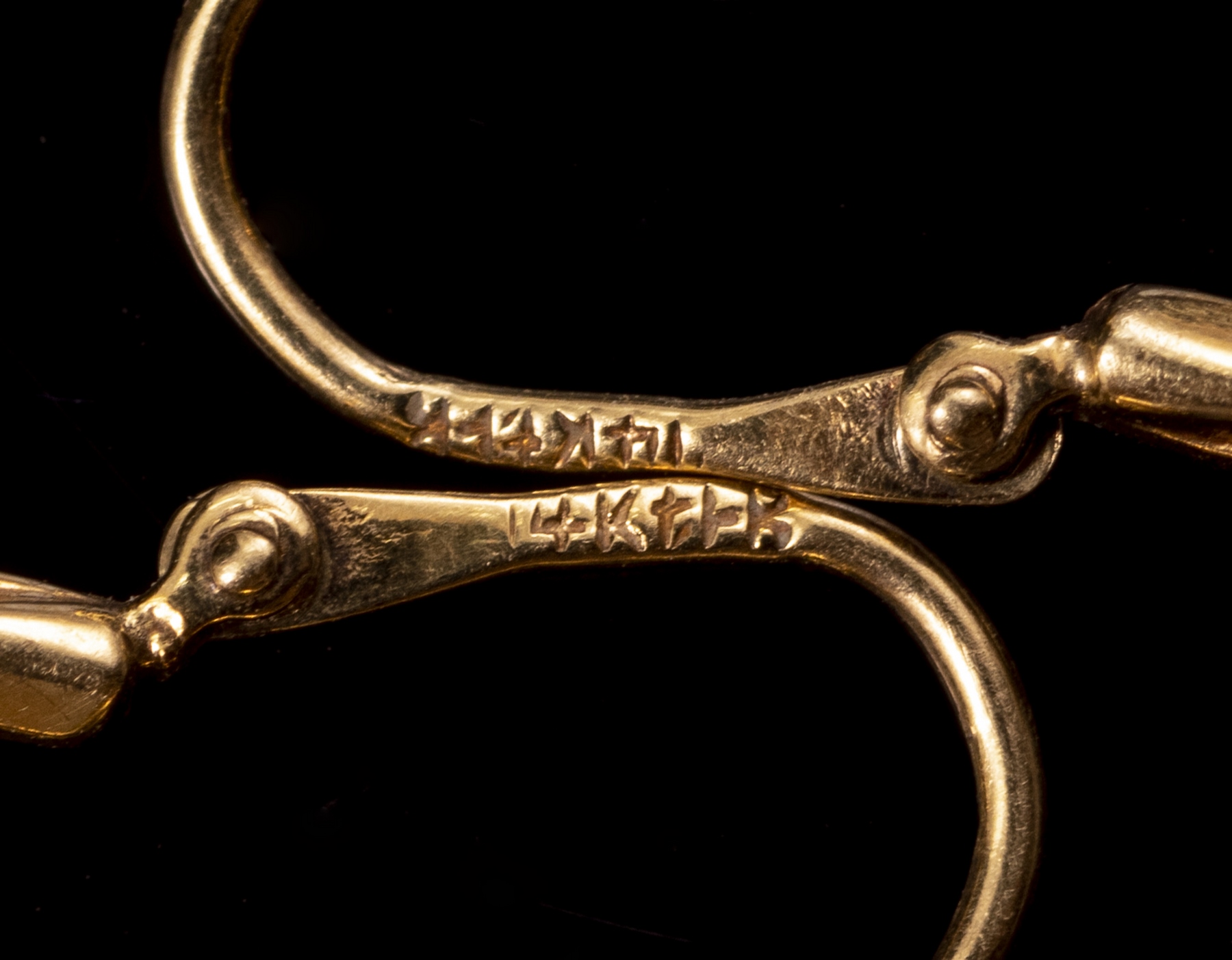 לוט שני זוגות עגילי זהב 14K, אורך/קוטר: 20-23 מ“מ, משקל 6.8 גרם, זוג אחד חתום, השני נבדק.