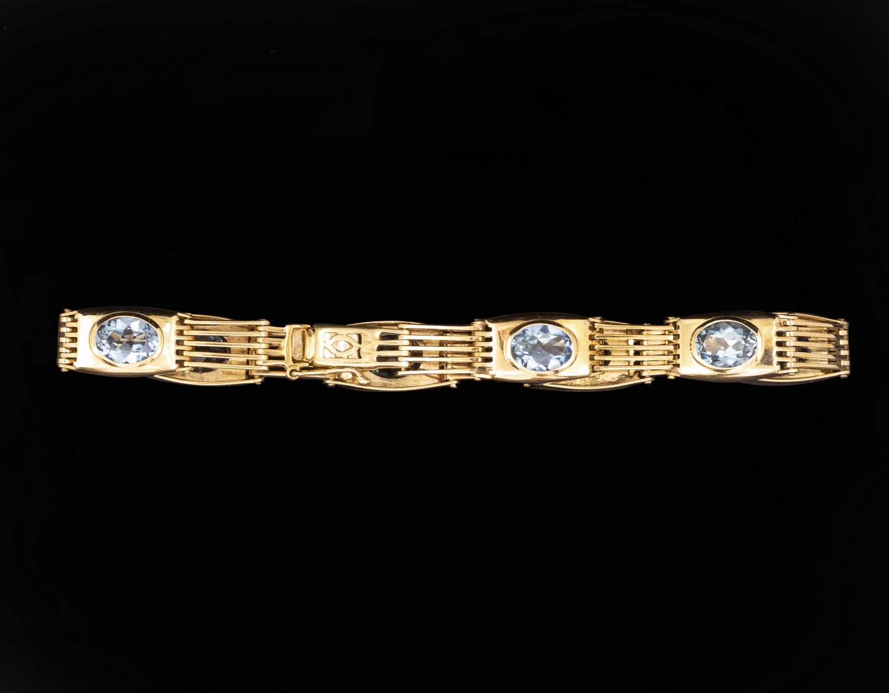 צמיד זהב 14K עשוי חוליות משובץ אבנים בצבע תכלת (8X6 מ“מ). אורך: 19 ס“מ. רוחב: 8 מ“מ. משקל: 17.7 גרם. חתום.
