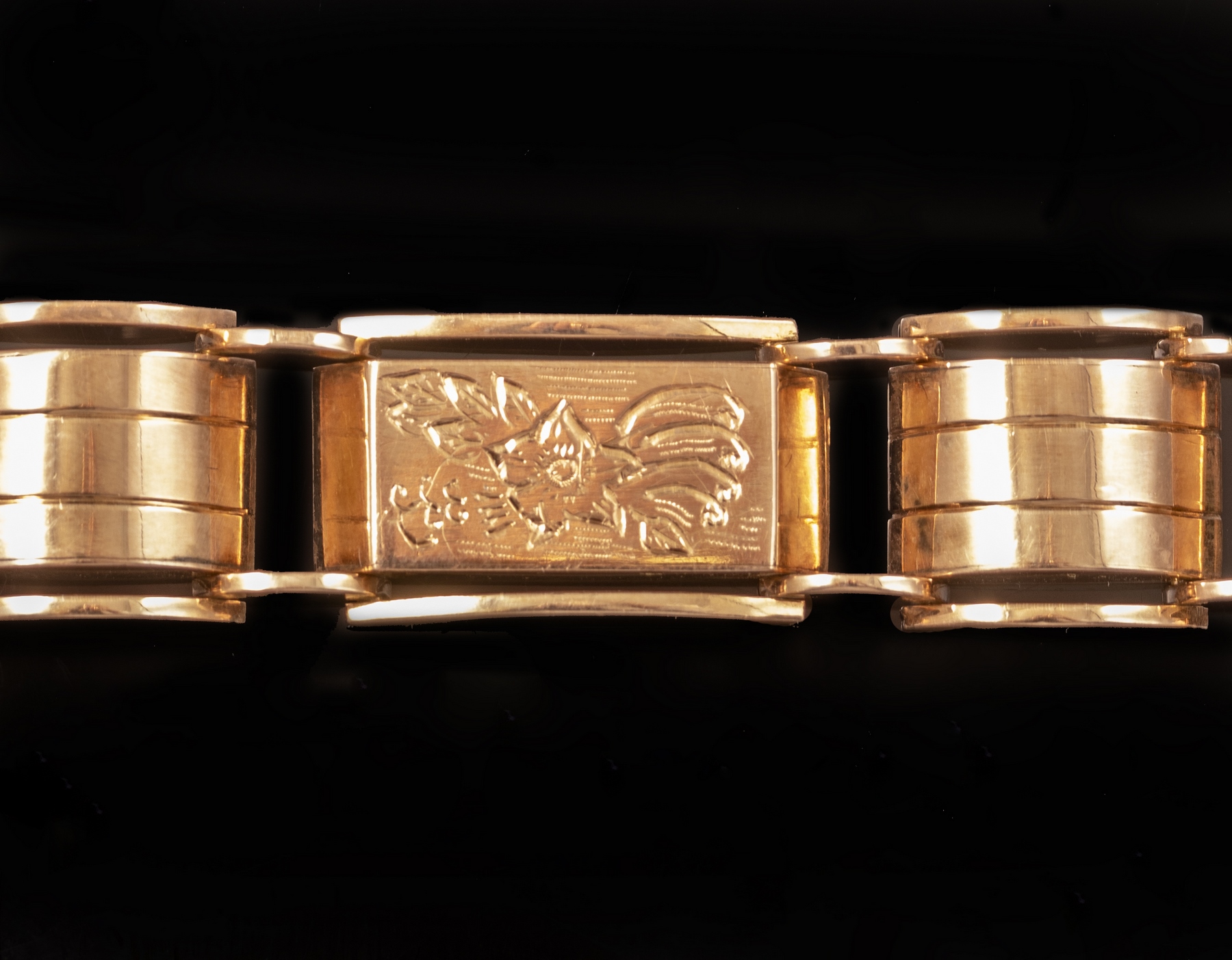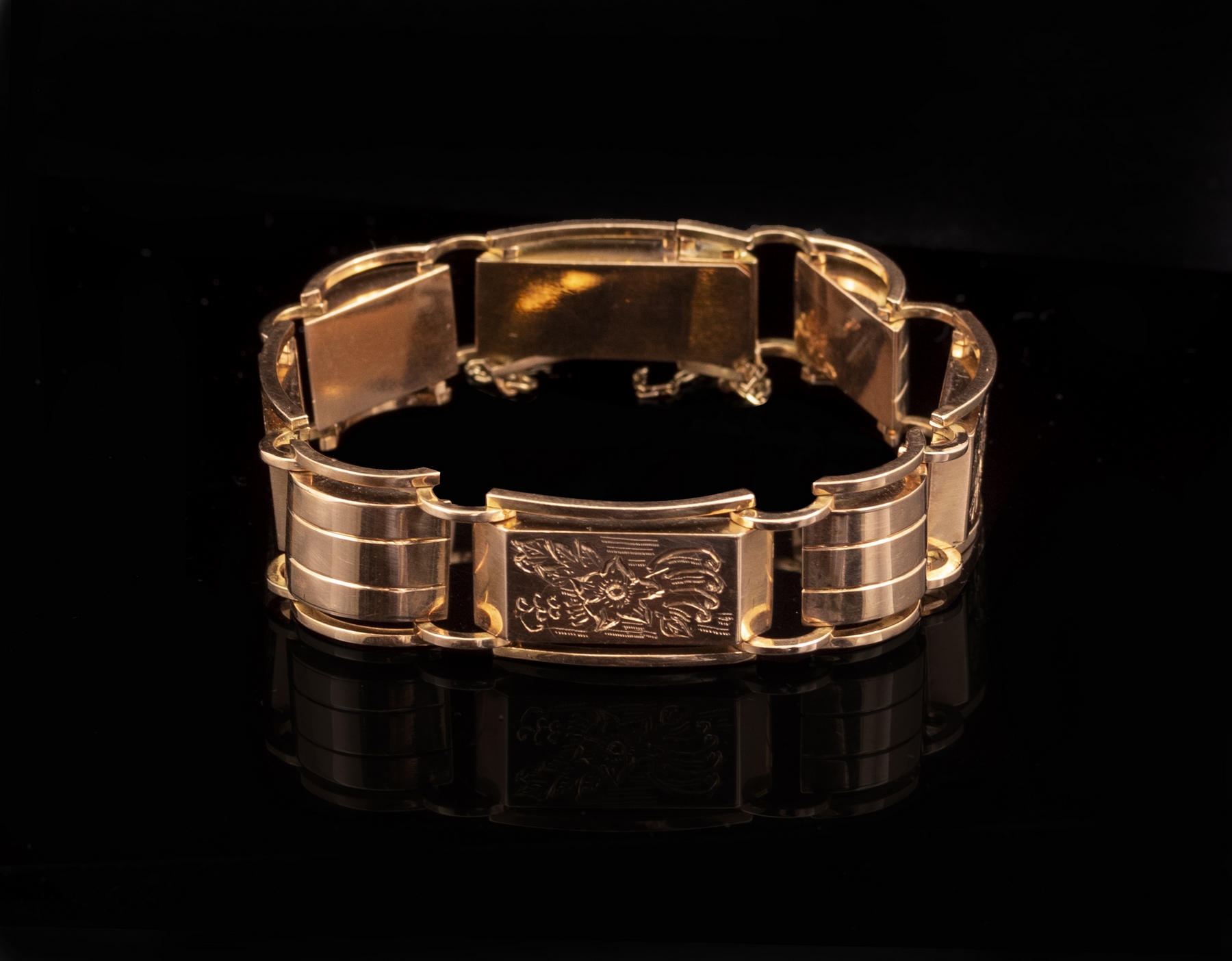 צמיד זהב 14K עשוי חוליות מעוטר בחריטות. אורך: 18.5 ס“מ. רוחב: 14 מ“מ. משקל: 30 גרם. חתום. שרשרת ביטחון מנותקת.