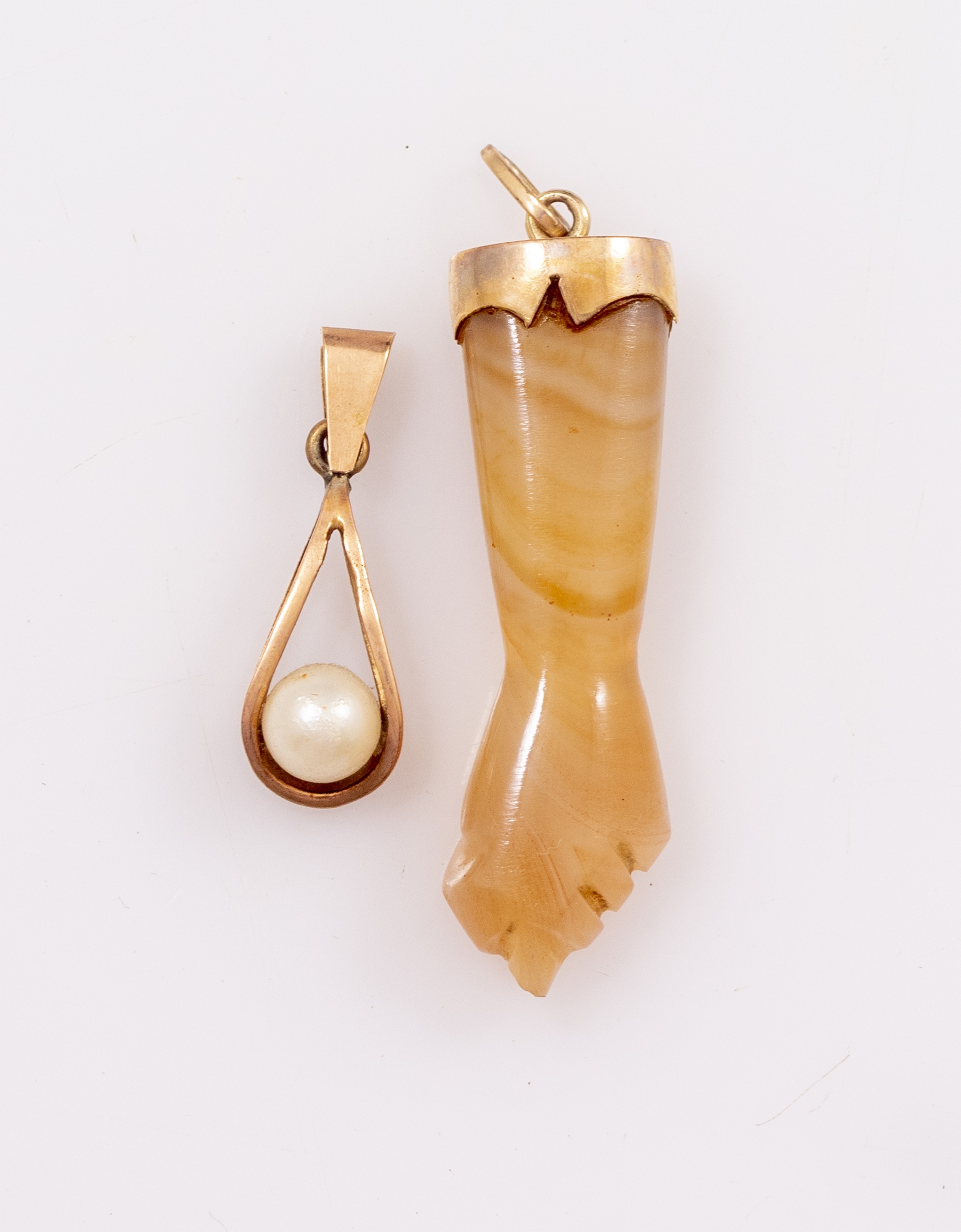 מקבץ תכשיטי זהב 14 קראט משובצים פנינים ואבן חן, משקל כולל: 7.4 גרם. חלק חתומים, זהב נבדק.