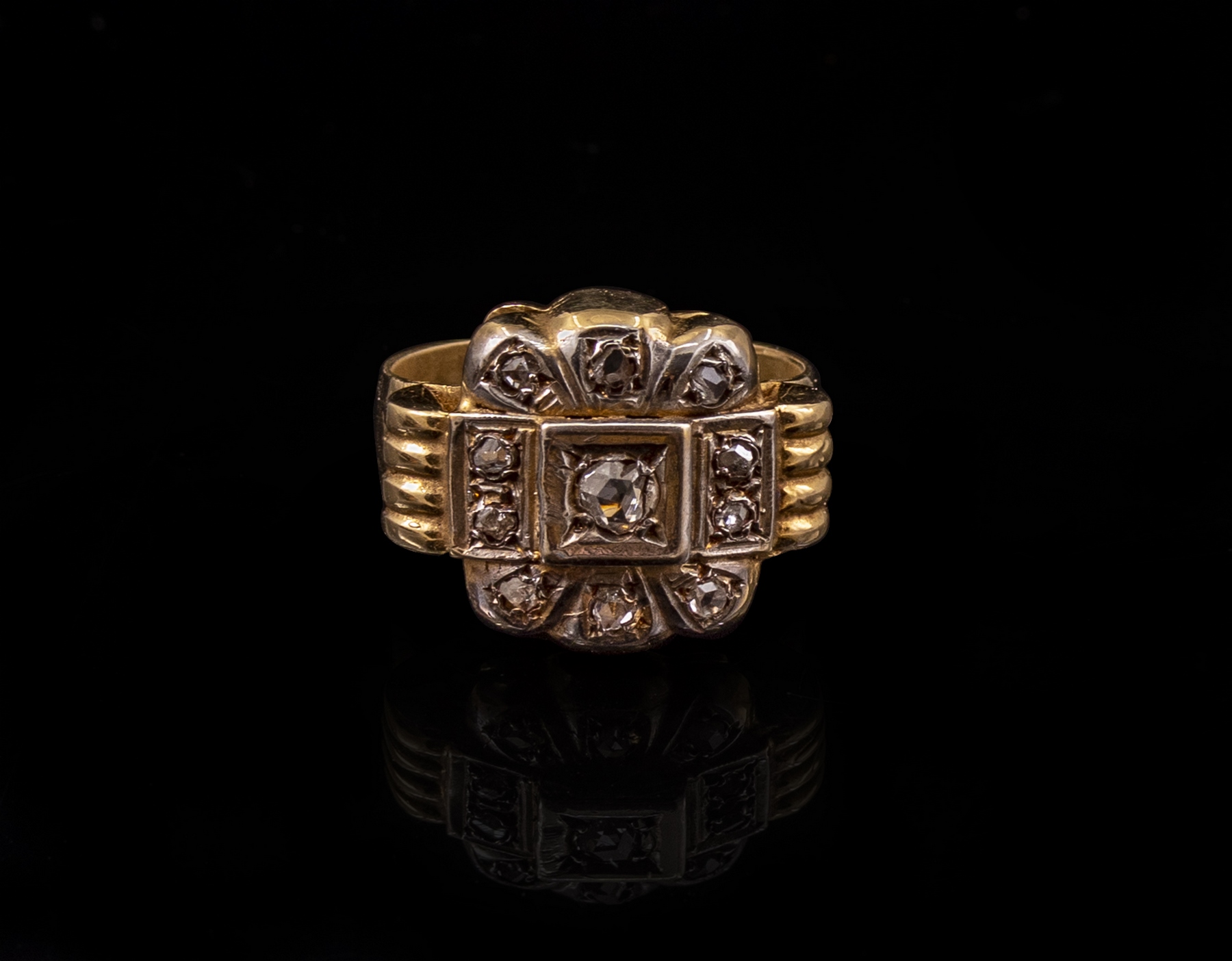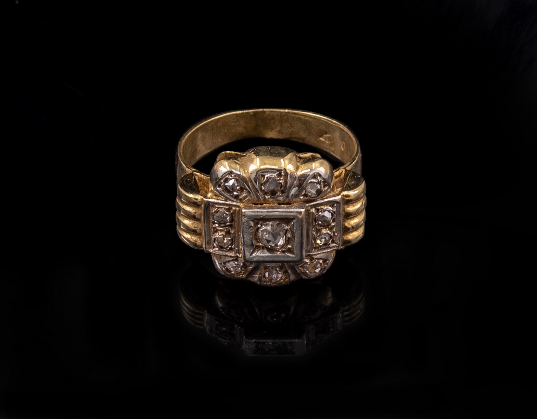 טבעת זהב 9K משובצת דיאמנטים. מידה: 6.5 US, משקל: 6.1 גרם. לא חתומה, הזהב נבדק.