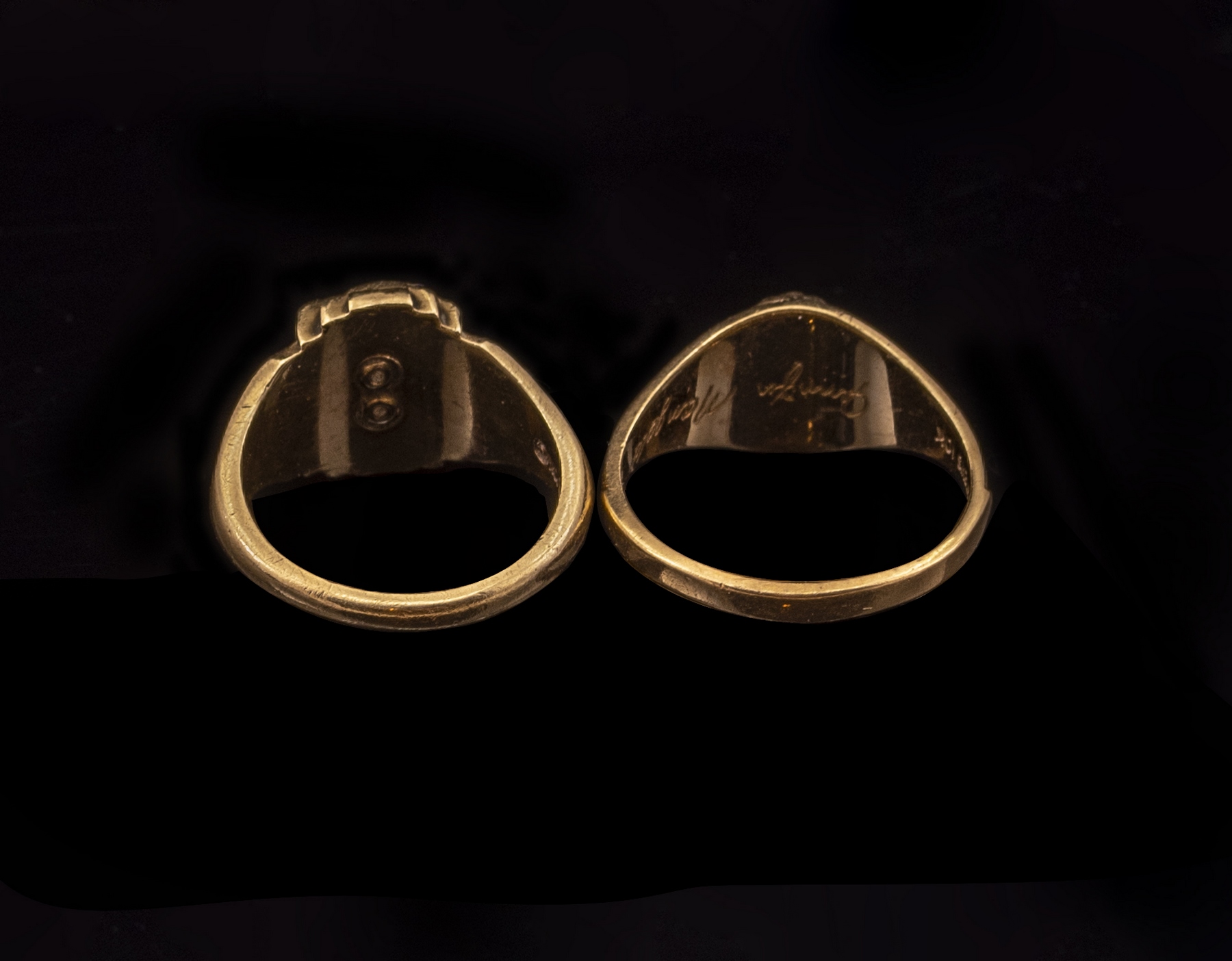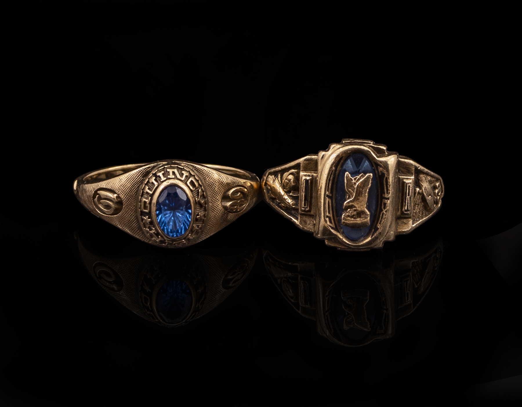 לוט 2 טבעות קולג‘ מזהב 10K. משובצות אבנים כחולות, אחת משנת 1968 והשנייה 1978. מידה: 5.5, 7.75 US, משקל: 8.4 גרם. חתומות.