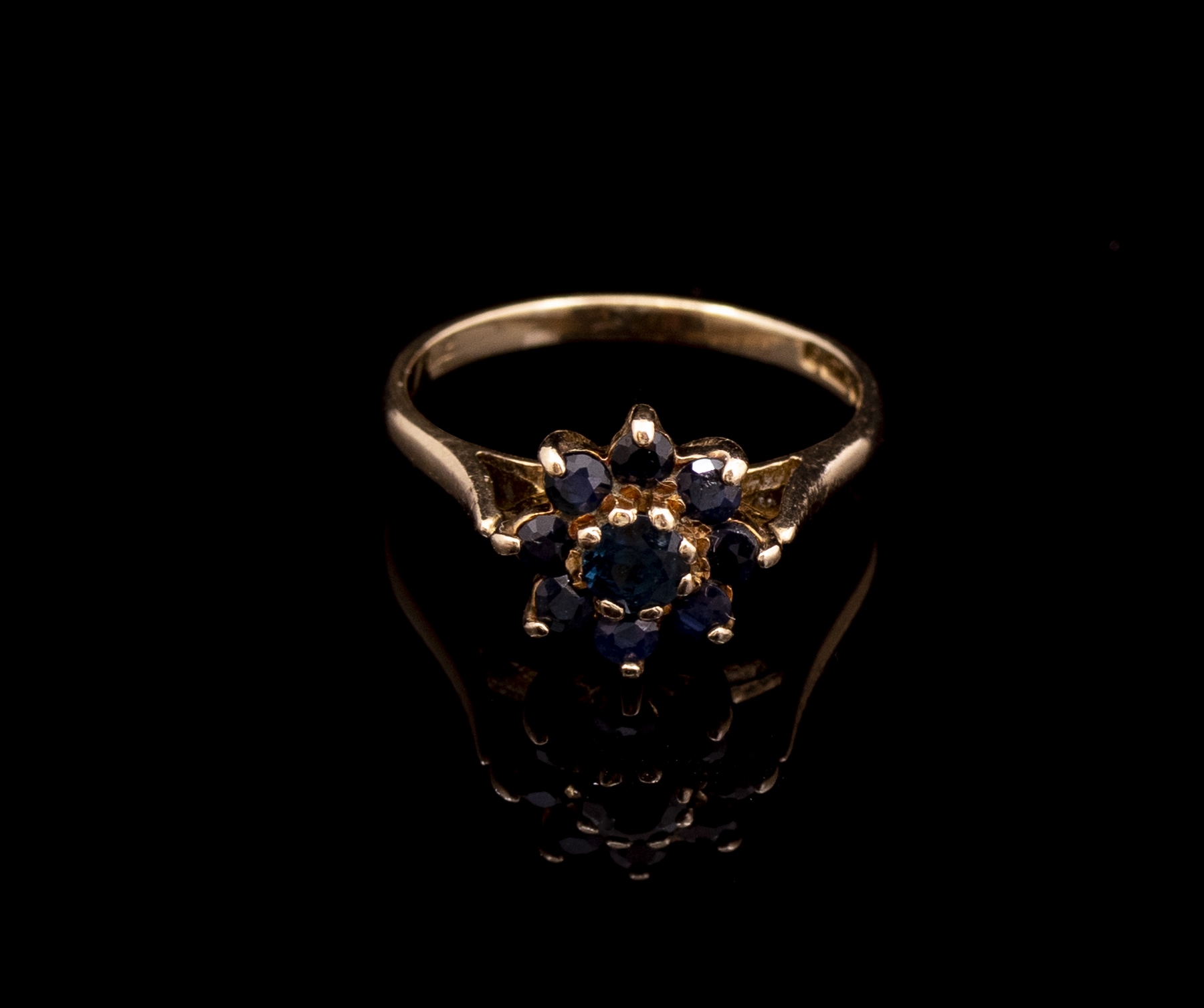 טבעת זהב 9K משובצת 8 אבני ספינל בצורת פרח. מידה :1/4 5 US, משקל: 2.1 גרם. חתומה.