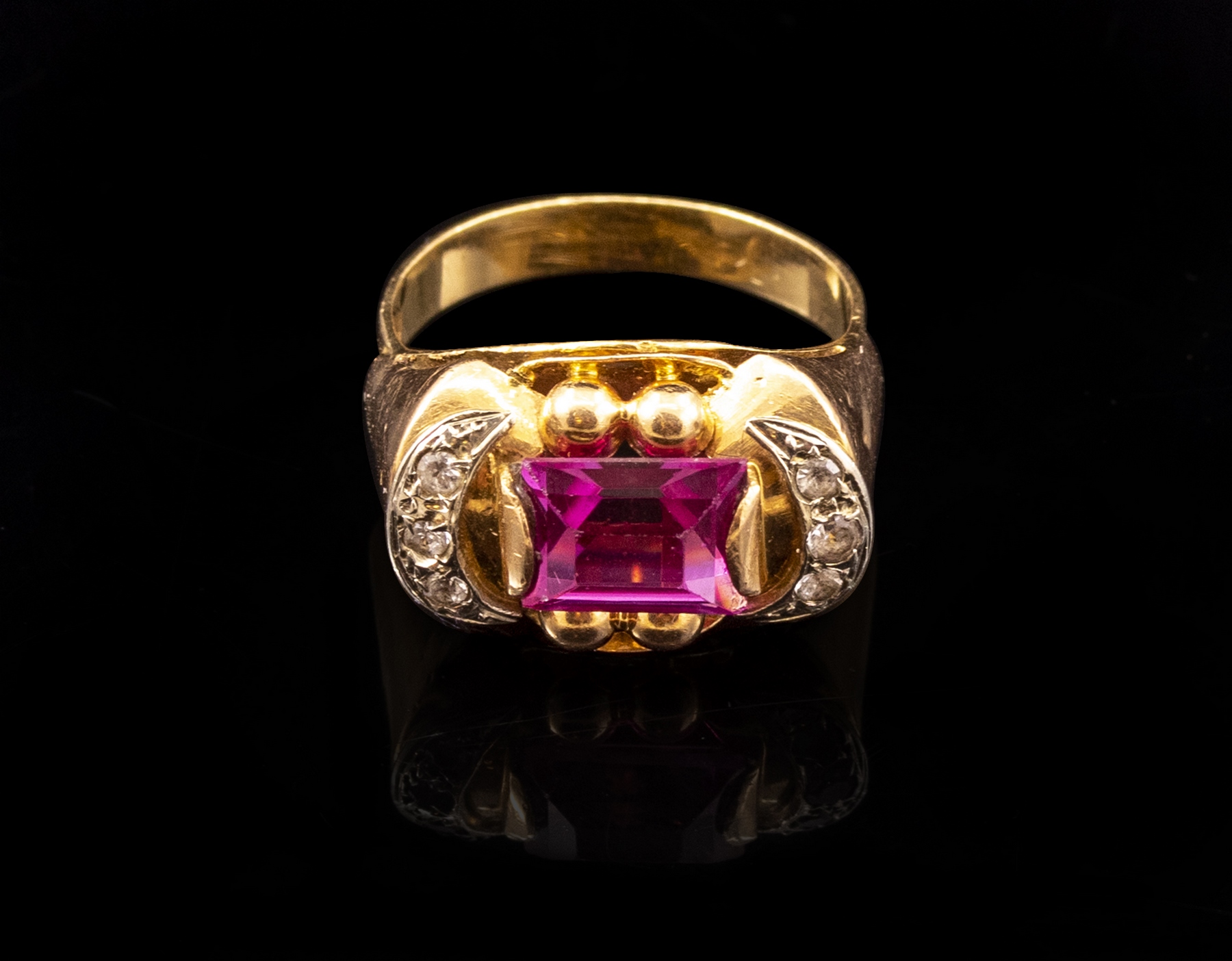 טבעת זהב 18K משובצת אבן אדומה מרכזית (8X6 מ“מ) ואבנים שקופות. מידה: 6 US, משקל: 4.4 גרם. חתימה שחוקה, הזהב נבדק.