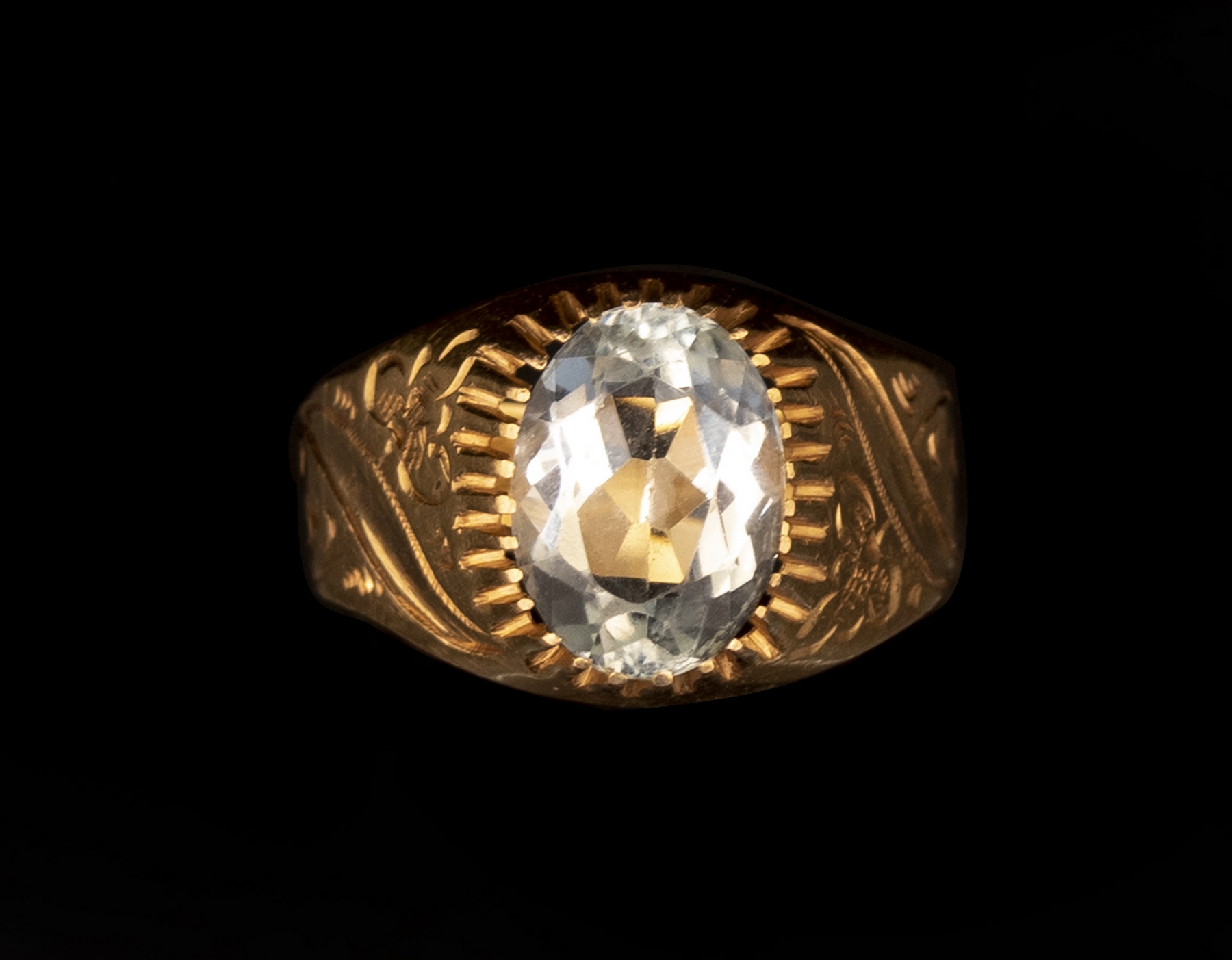 טבעת זהב 14K רוסית, משובצת אבן בצבע תכלת. מידה: 7 US, משקל: 3 גרם. חתומה.