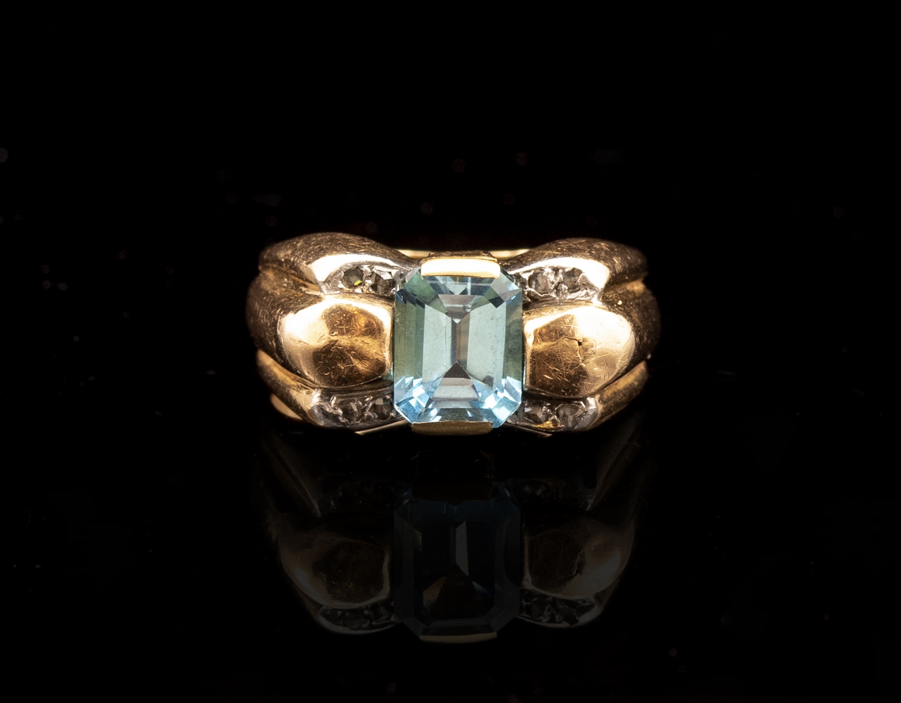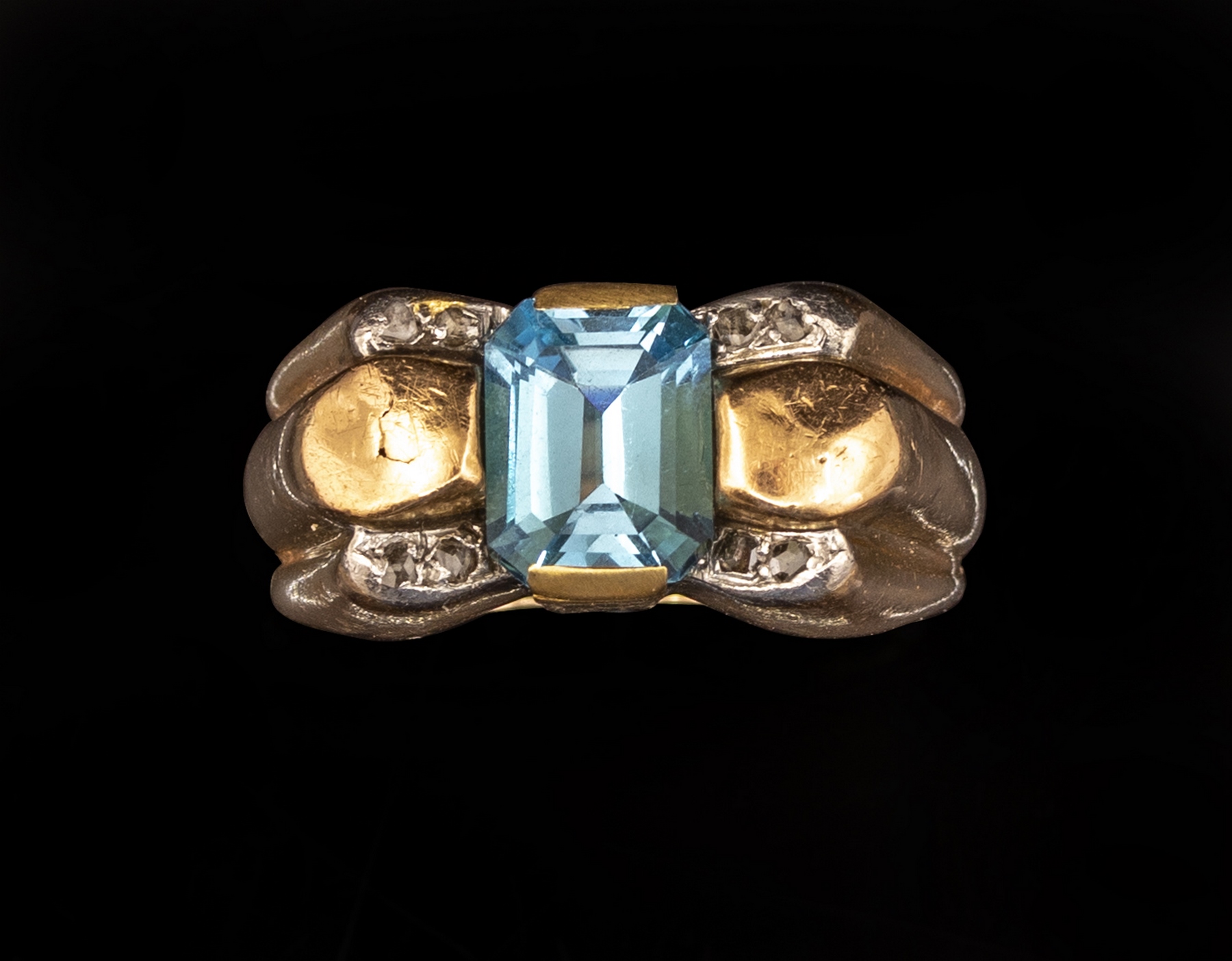 טבעת זהב 18K, משובצת בלו טופז מרכזית (9X7 מ“מ) ומסביב דיאמנטים. מידה: 9.5 US, משקל: 8.4 גרם. חתומה. סדק זעיר לזהב.