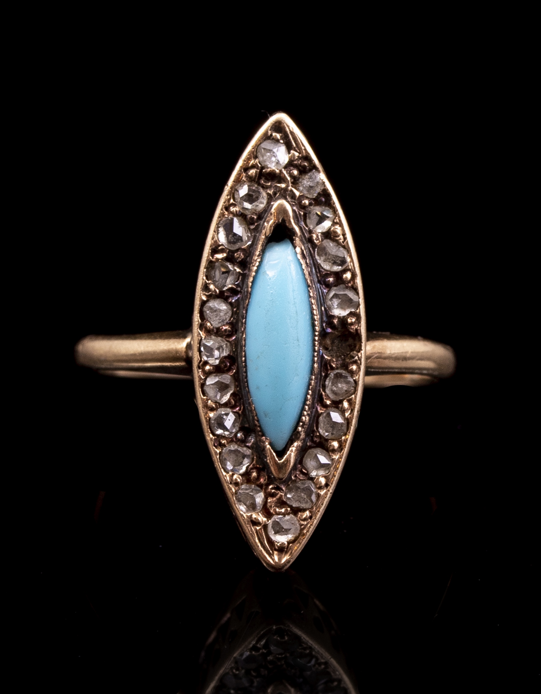 טבעת זהב 14K, משובצת טורקיז מרכזי וסביבו דיאמנטים. מידה: US 4 3/4, משקל: 2.5 גרם. חתומה. חסר דיאמנט אחד.