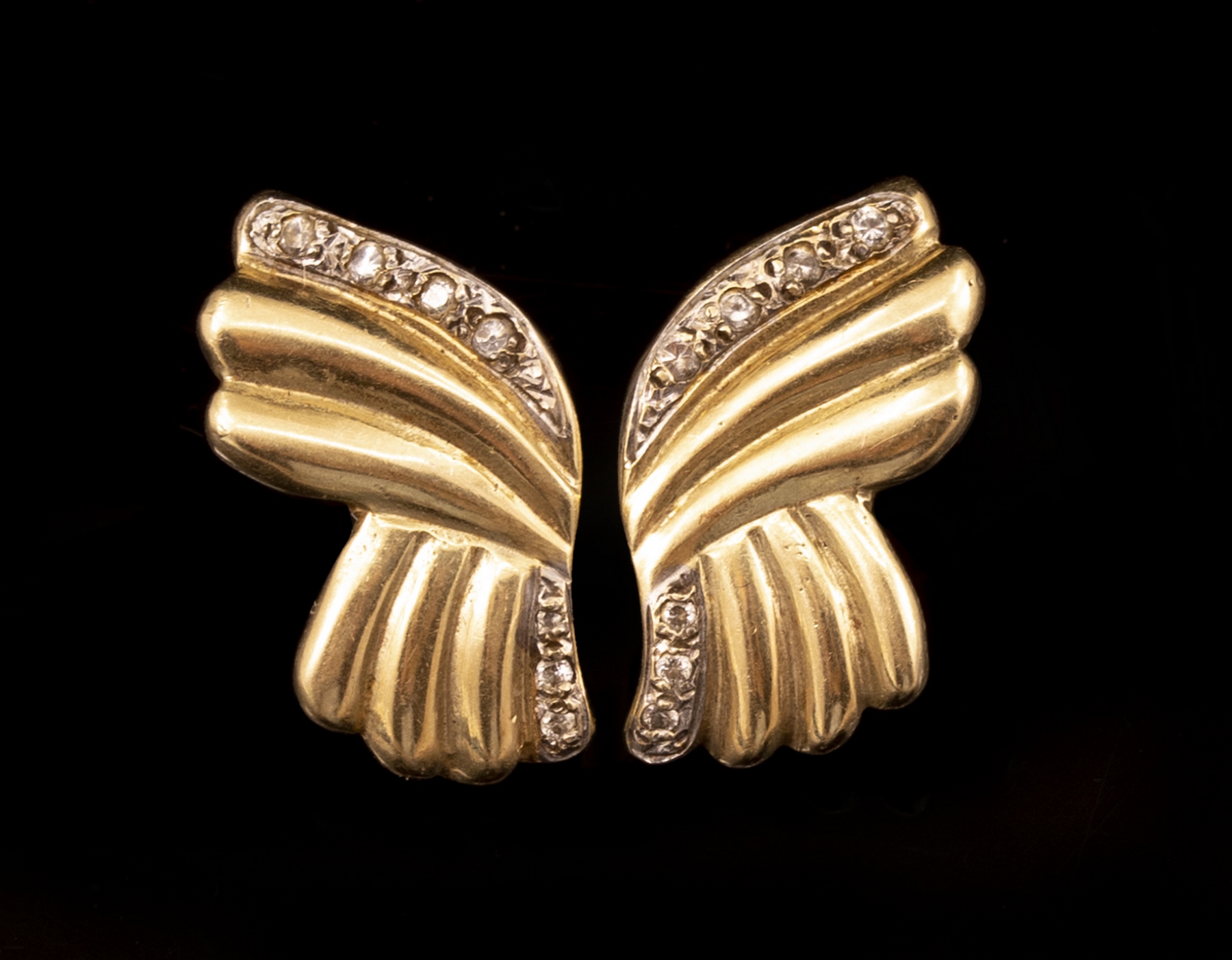 זוג עגילי זהב 14K משובצים דיאמנטים. אורך: 22 מ“מ. משקל כולל: 5.8 גרם. לא חתום, זהב נבדק. סוגר אחד לא מזהב.