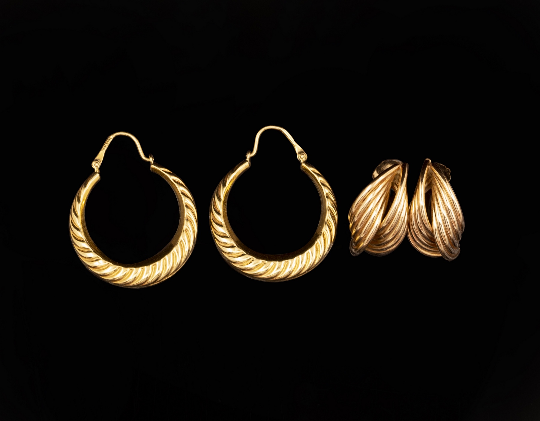 לוט שני זוגות עגילי זהב 14K, אורך/קוטר: 20-23 מ“מ, משקל 6.8 גרם, זוג אחד חתום, השני נבדק.