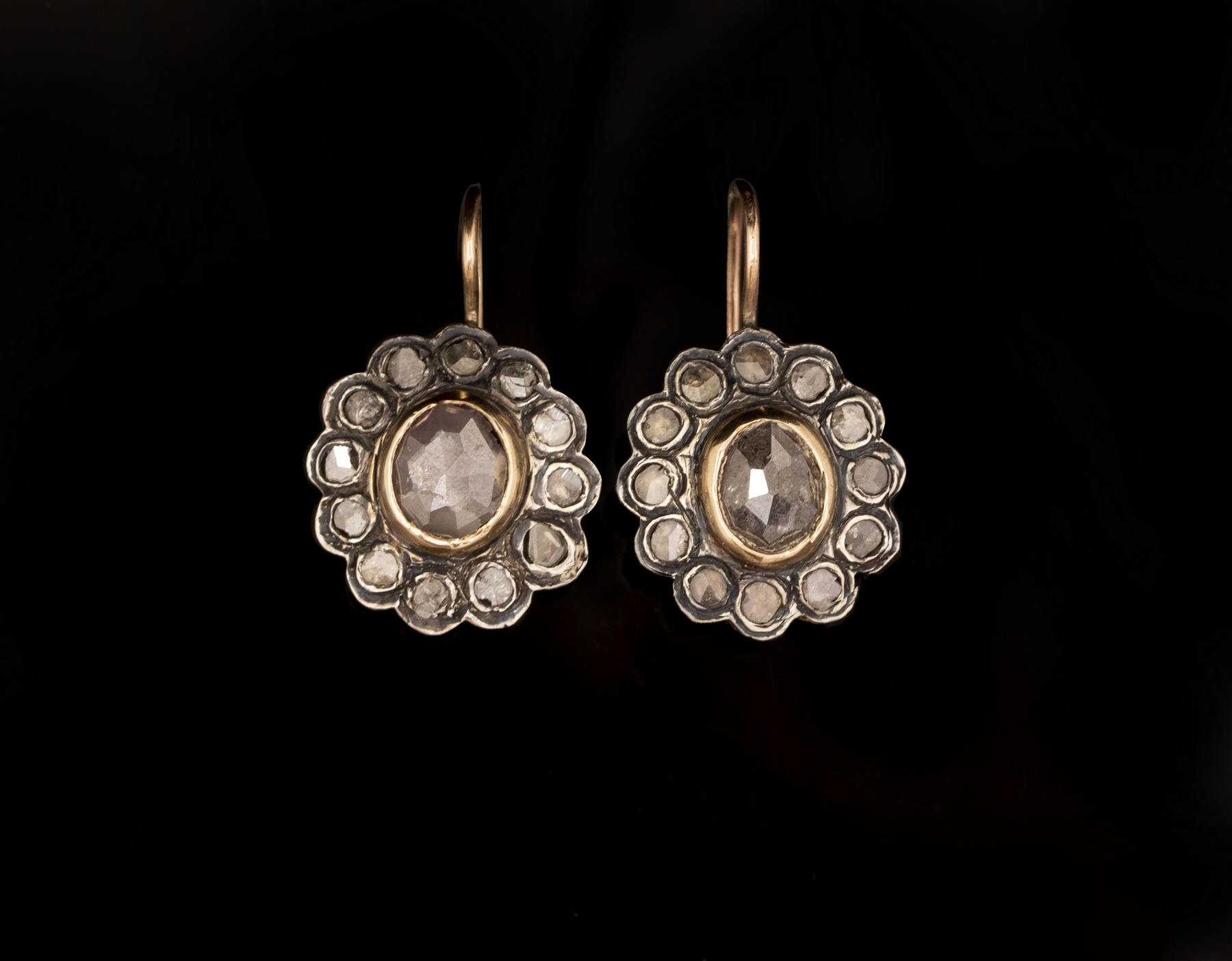זוג עגילי זהב 14K וכסף בצורת פרח. משובצים דיאמנטים (המרכזי בקוטר 7 מ“מ). אורך: 19 מ“מ. משקל: 9.8 גרם. חתומים.