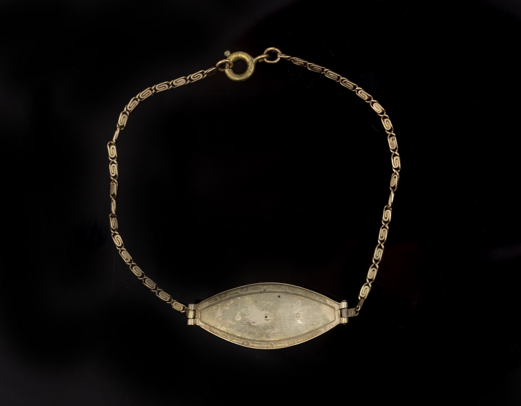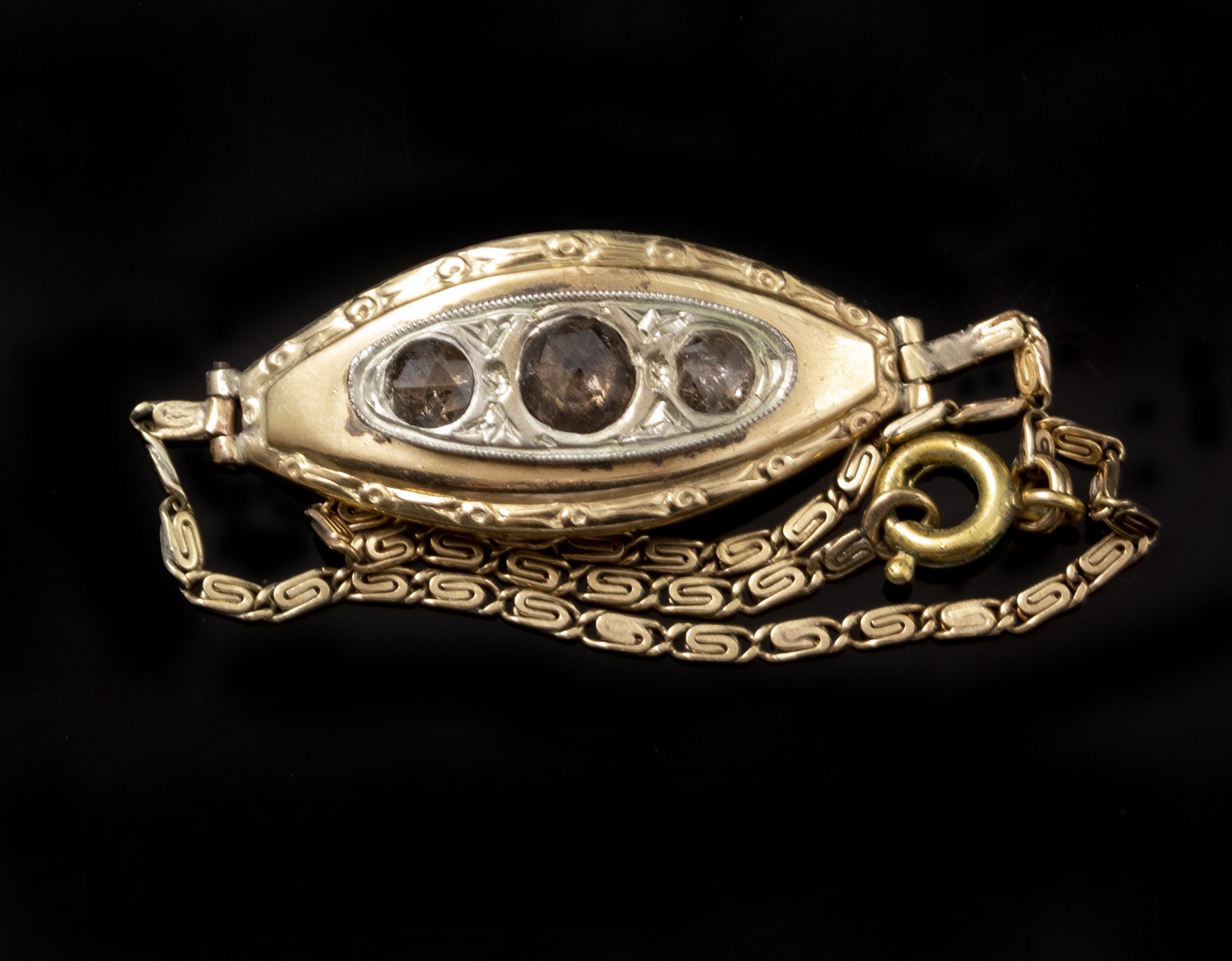 צמיד זהב 14K, מרכזו משולב כסף ומשובץ 3 דיאמנטים (4-5 מ“מ). אורך: 17 מ“מ. רוחב מקסימלי: 12 מ“מ. משקל: 3.7 גרם. לא חתום, זהב נבדק (סוגר מצופה זהב).