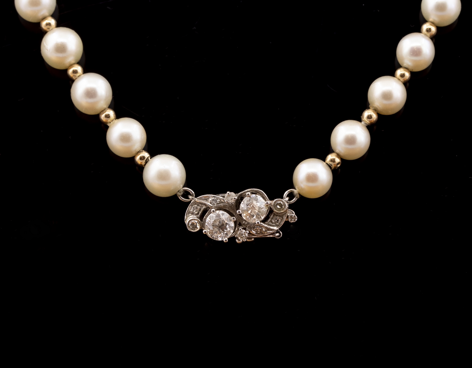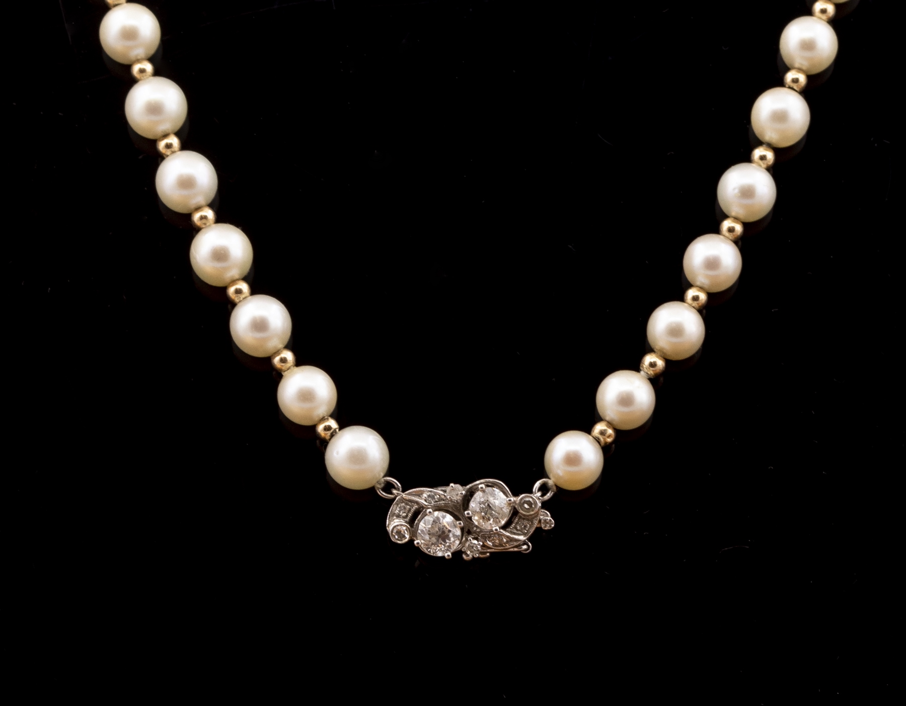 מחרוזת פנינים וחרוזי זהב 14K, עם סוגר זהב לבן 14K משובץ 2 יהלומים בחיתוך אלט-שליף במשקל כ-חצי קראט כ“א, 4 יהלומים במשקל כ 2-3 נק‘ כ“א, כ-1.1 קראט סה“כ. אורך השרשרת: 42 ס“מ. הסוגר חתום, החרוזים נבדקו.