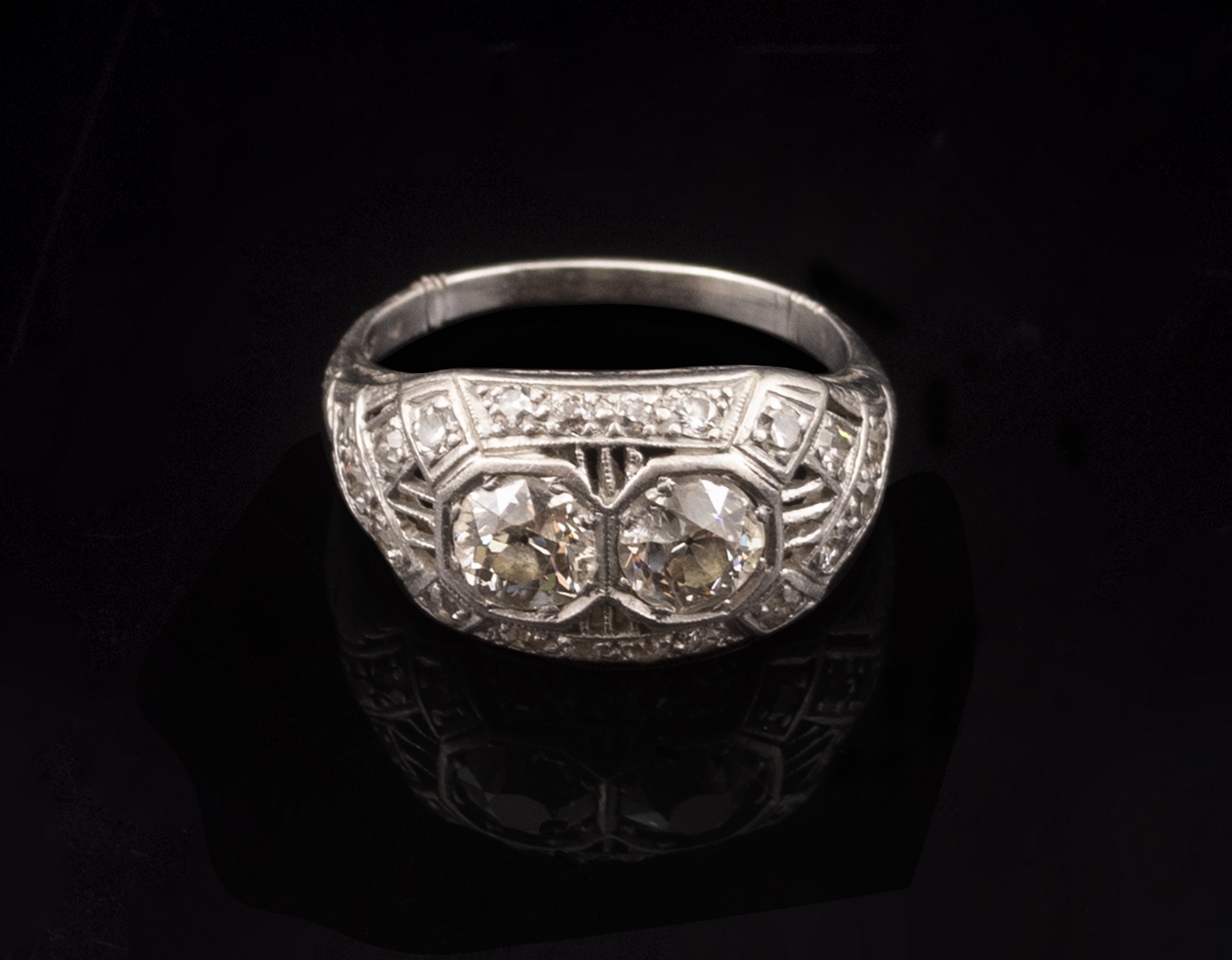 טבעת פלטינה אר-דקו, משובצת 2 יהלומים בחיתוך אלט-שליף במשקל כ-חצי קראט כ“א, וכ-20 יהלומים במשקל כ-1 נק‘ כ“א. סה“כ כ-1.2 קראט יהלומים. מידה: 7 US, משקל: 5.2 גרם. לא חתומה פלטינה נבדקה.
