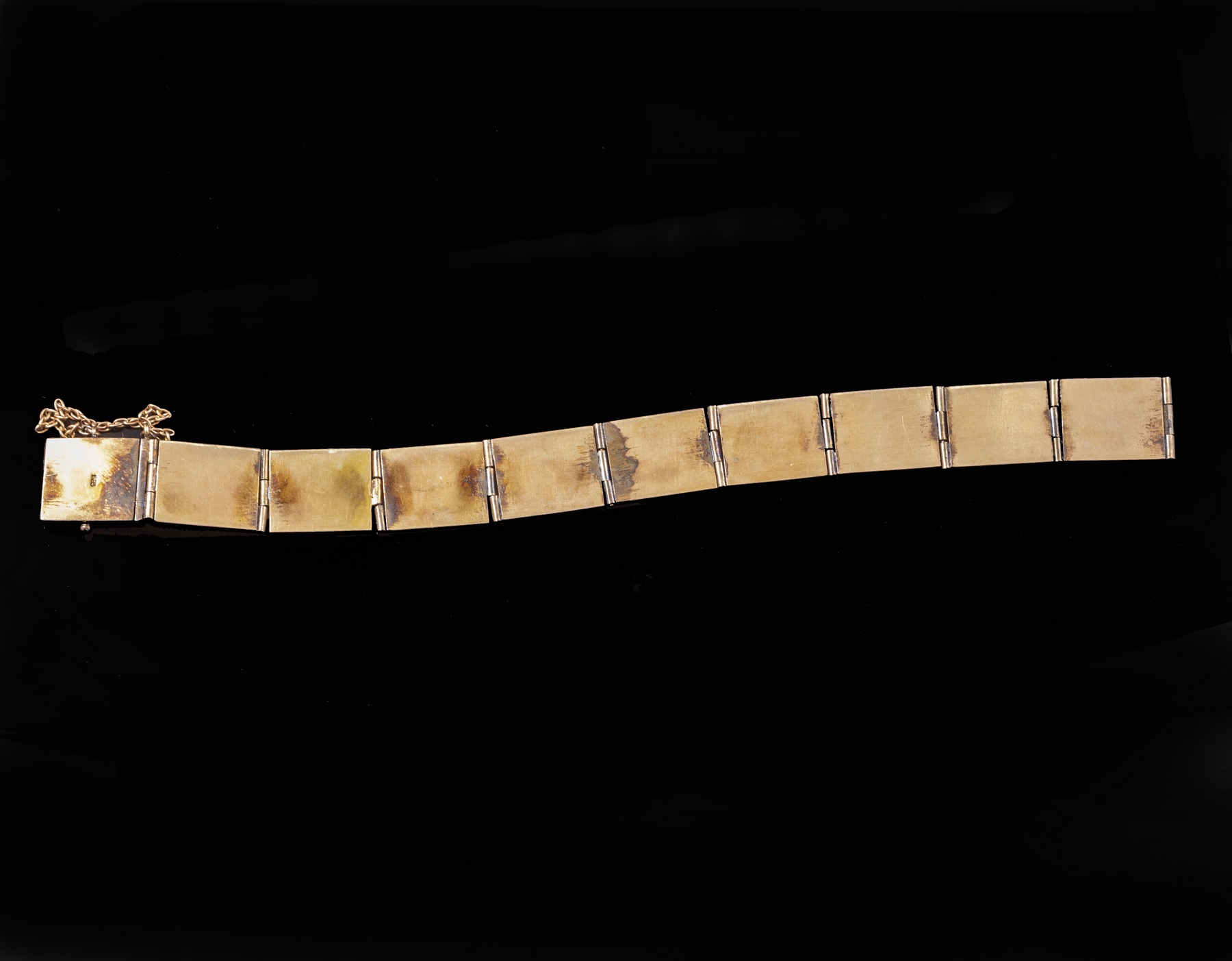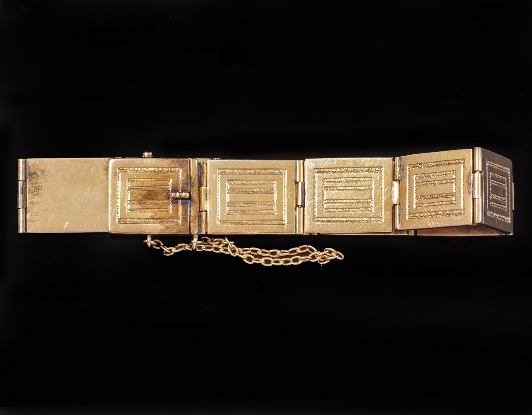צמיד זהב 14K עשוי חוליות מעוטר בחריטות. אורך: 18.5 ס“מ. רוחב: 14 מ“מ. משקל: 50 גרם. חתום. צד אחד מנותק.