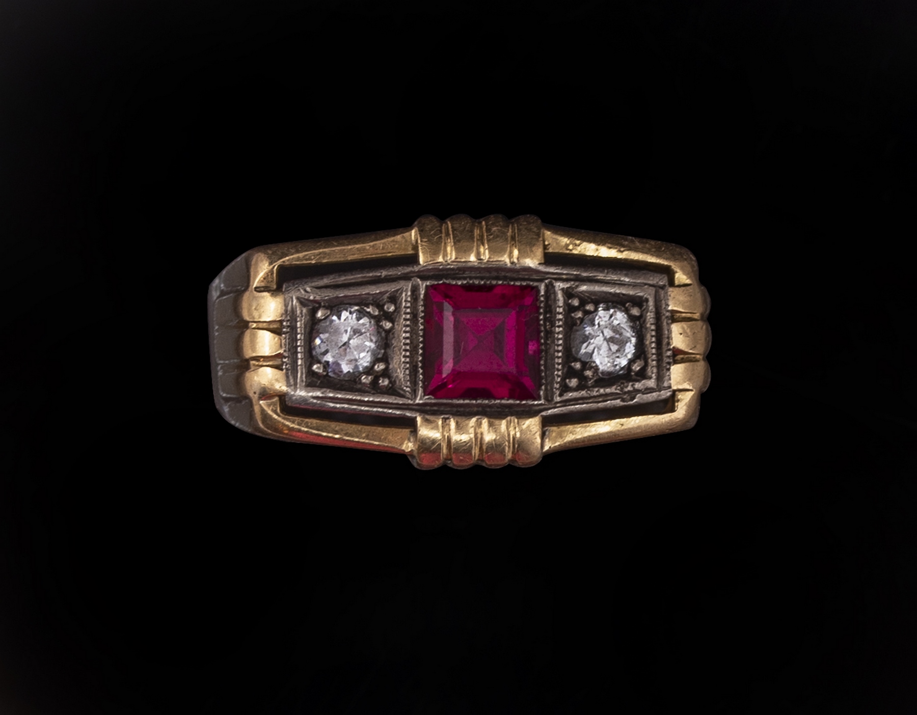 18K gold ring, set with a ruby (5×5 mm) and two transparent stones. Size: US 9 3/4, weight: 4.5 grams. Hallmarked (French import hallmarks).