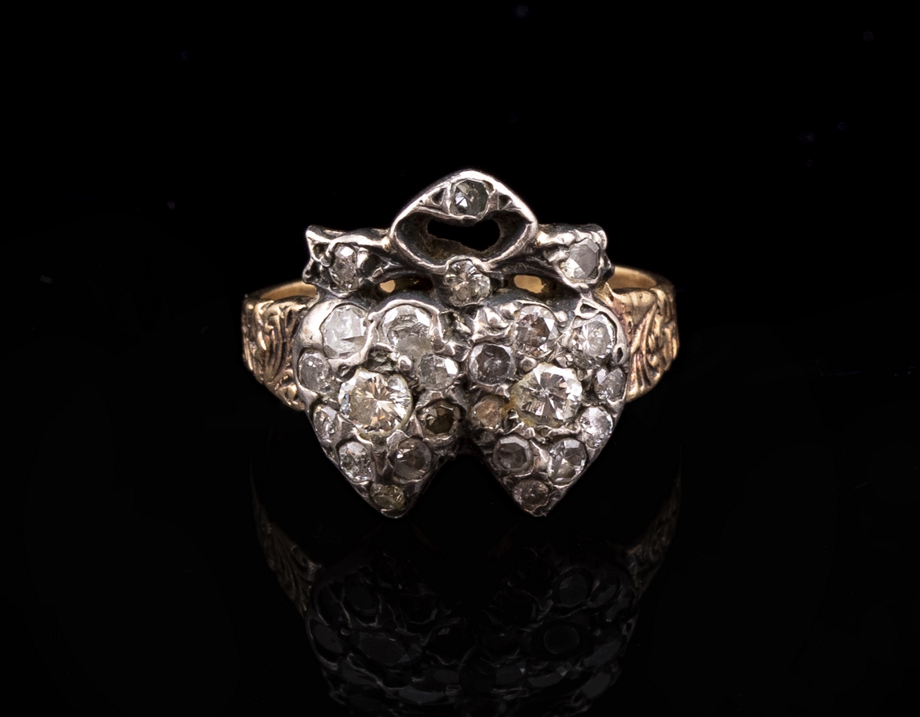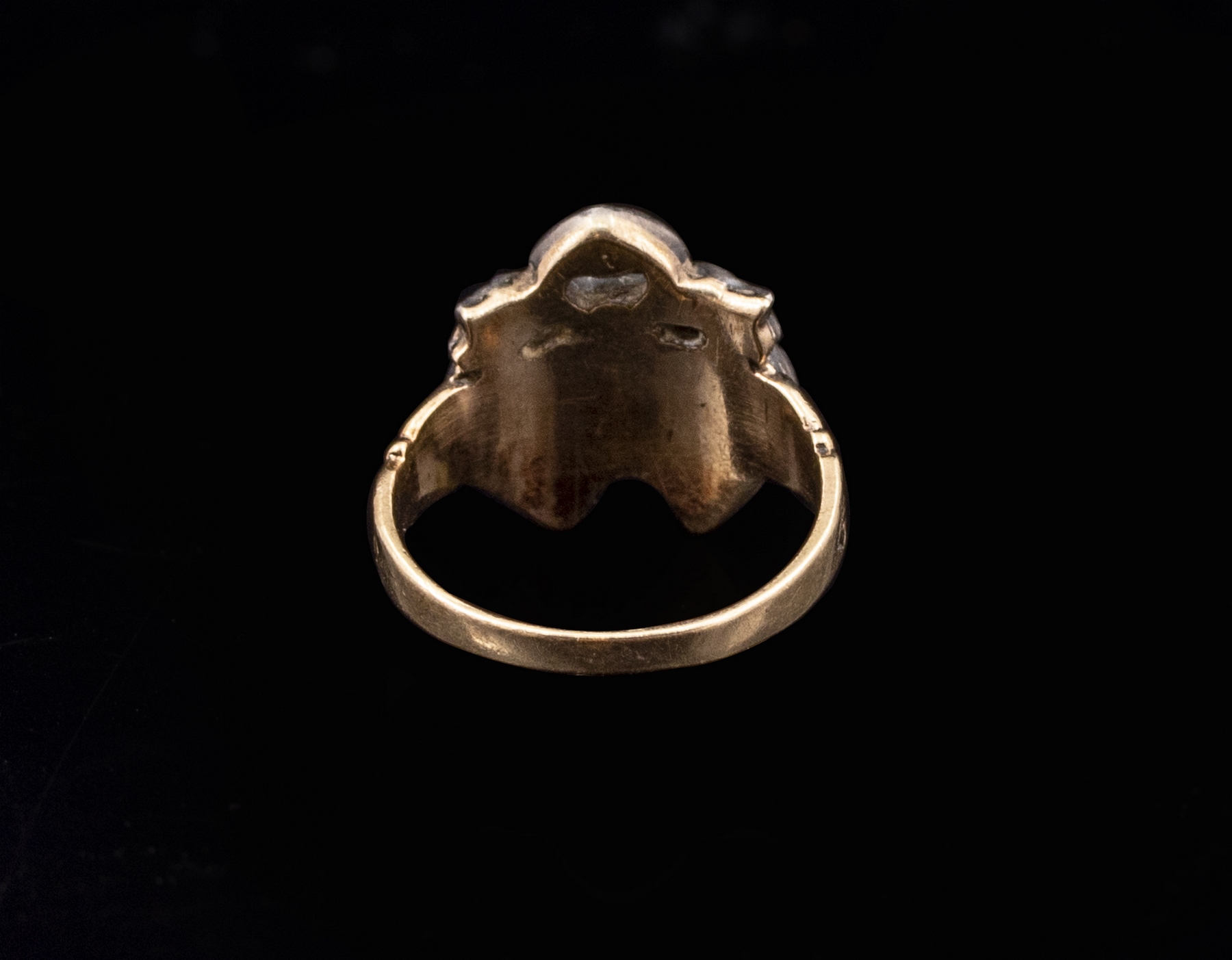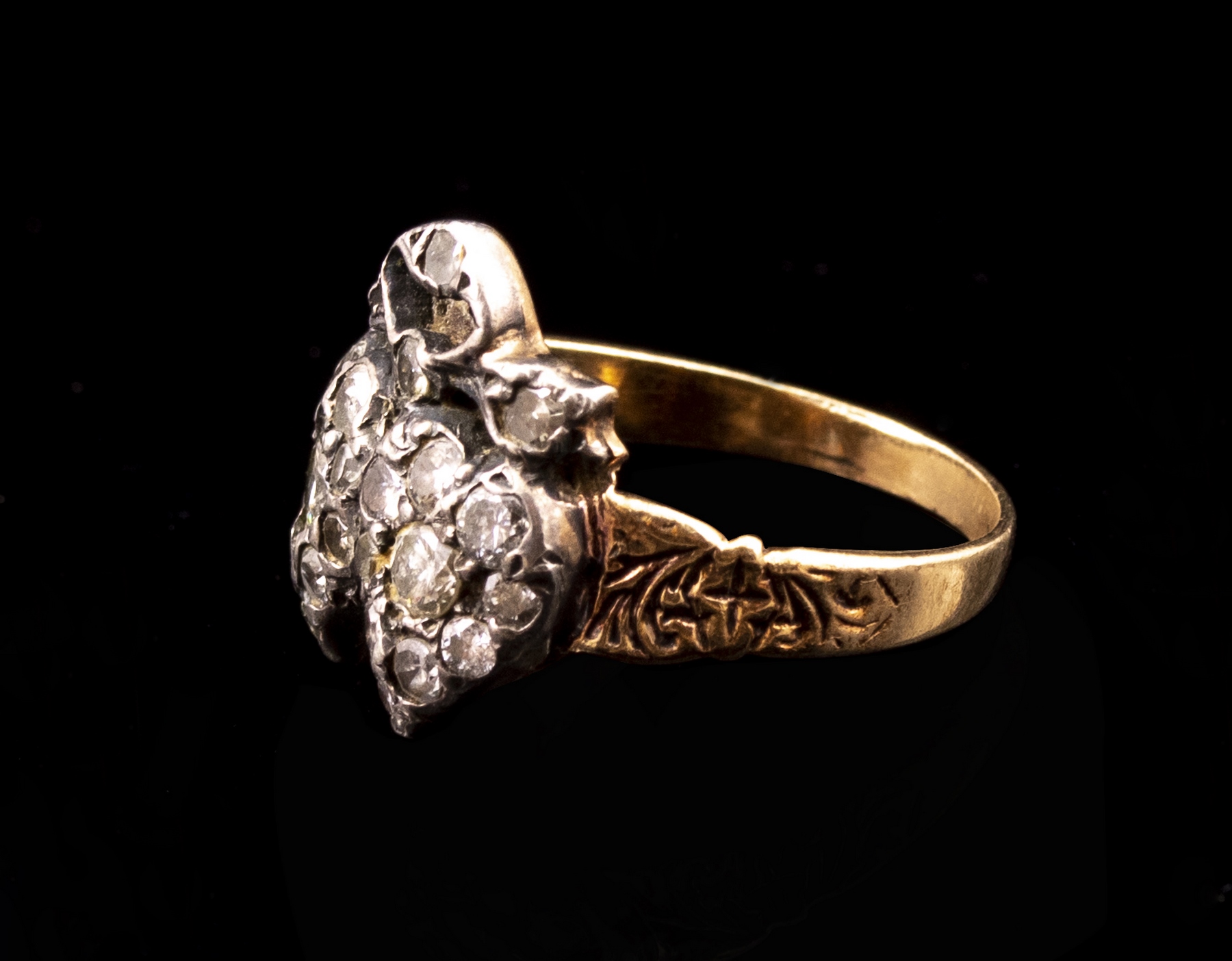 14K gold and silver ring set with rose cut diamonds. Size: US 6.5, weight: 5.1 grams. Apparently unmarked, gold tested.