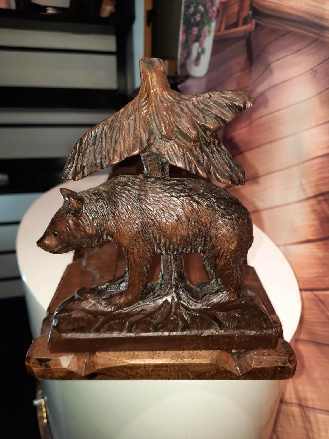 Carved bear and bird on both sides