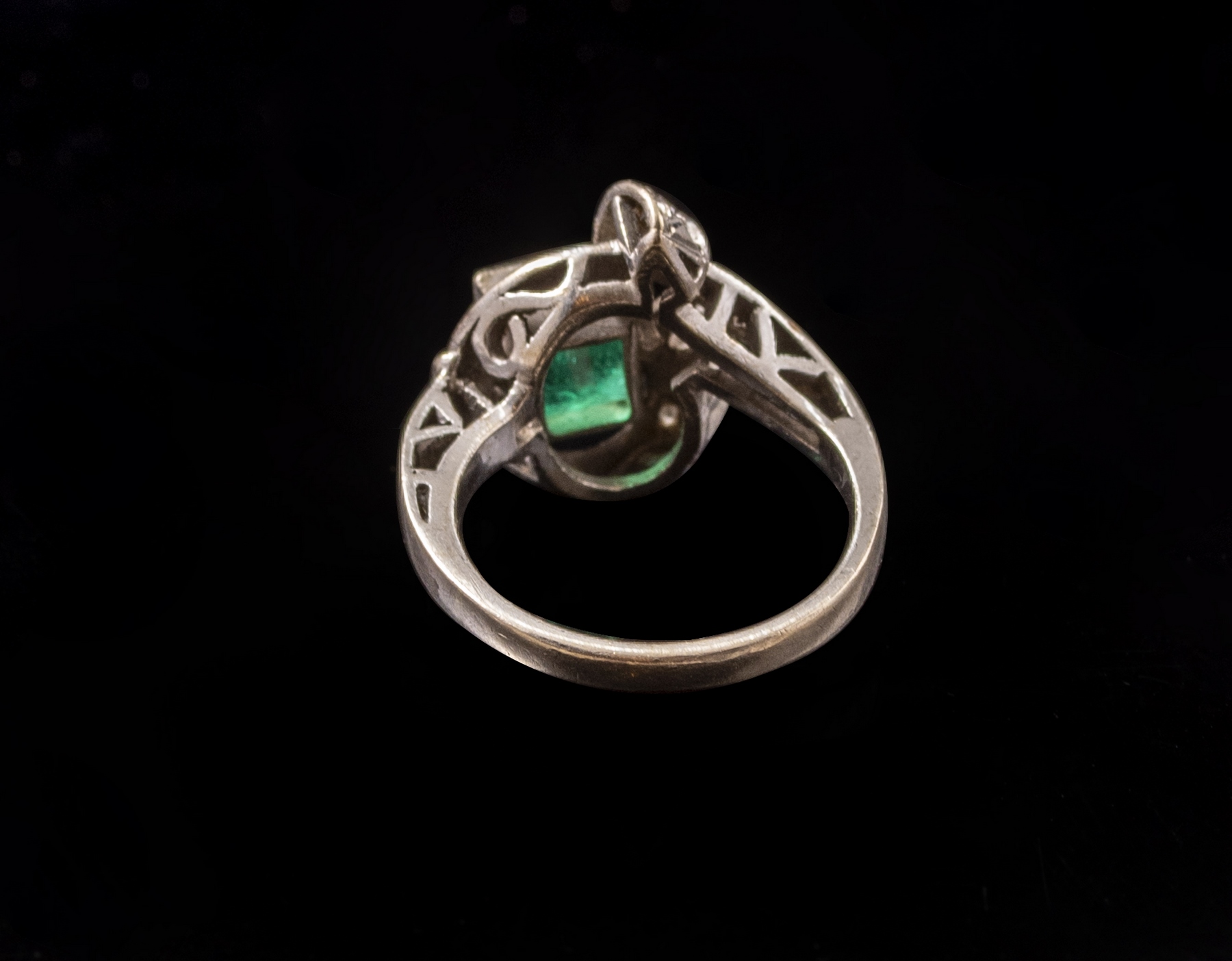 טבעת זהב לבן 14K משובצת אמרלד מרכזי (מידות: 6X5 מ»מ) וכ-10 יהלומים זעירים במשקל כ-1.5 נק’ כ»א. מידה: US 6.5. משקל: 5.5 גרם. לא חתומה, זהב נבדק.