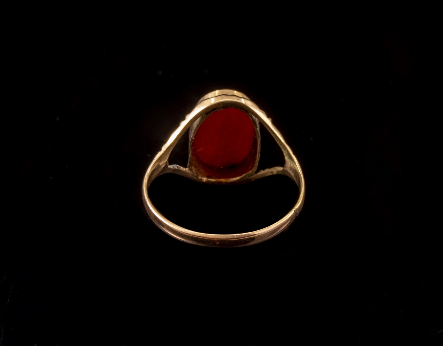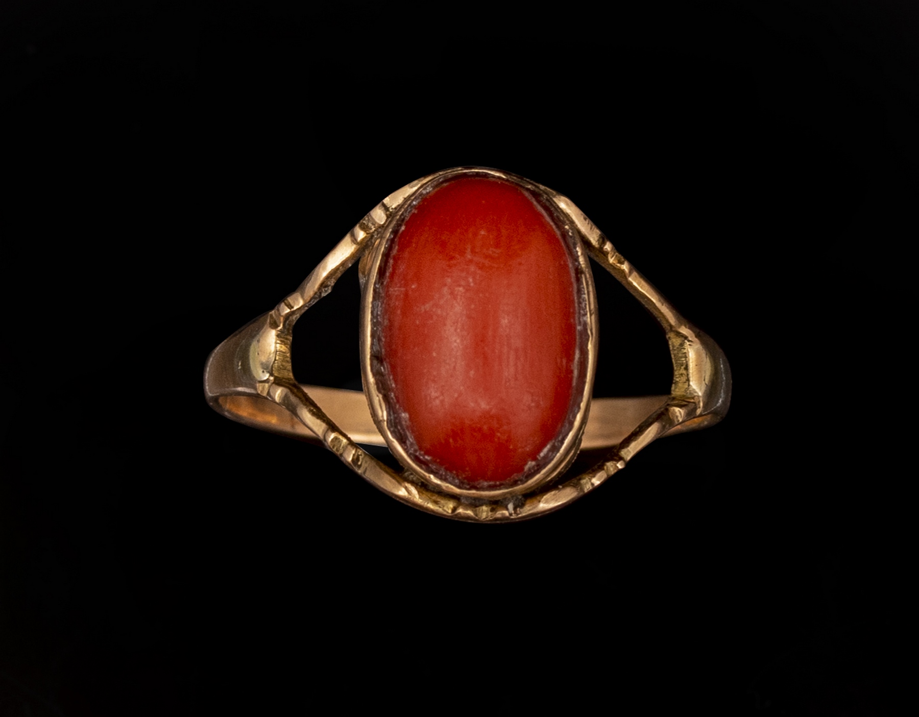טבעת זהב 14K משובצת קורל (11X8 מ»מ). מידה: 8 US, משקל: 2.4 גרם. לא חתומה, הזהב נבדק.