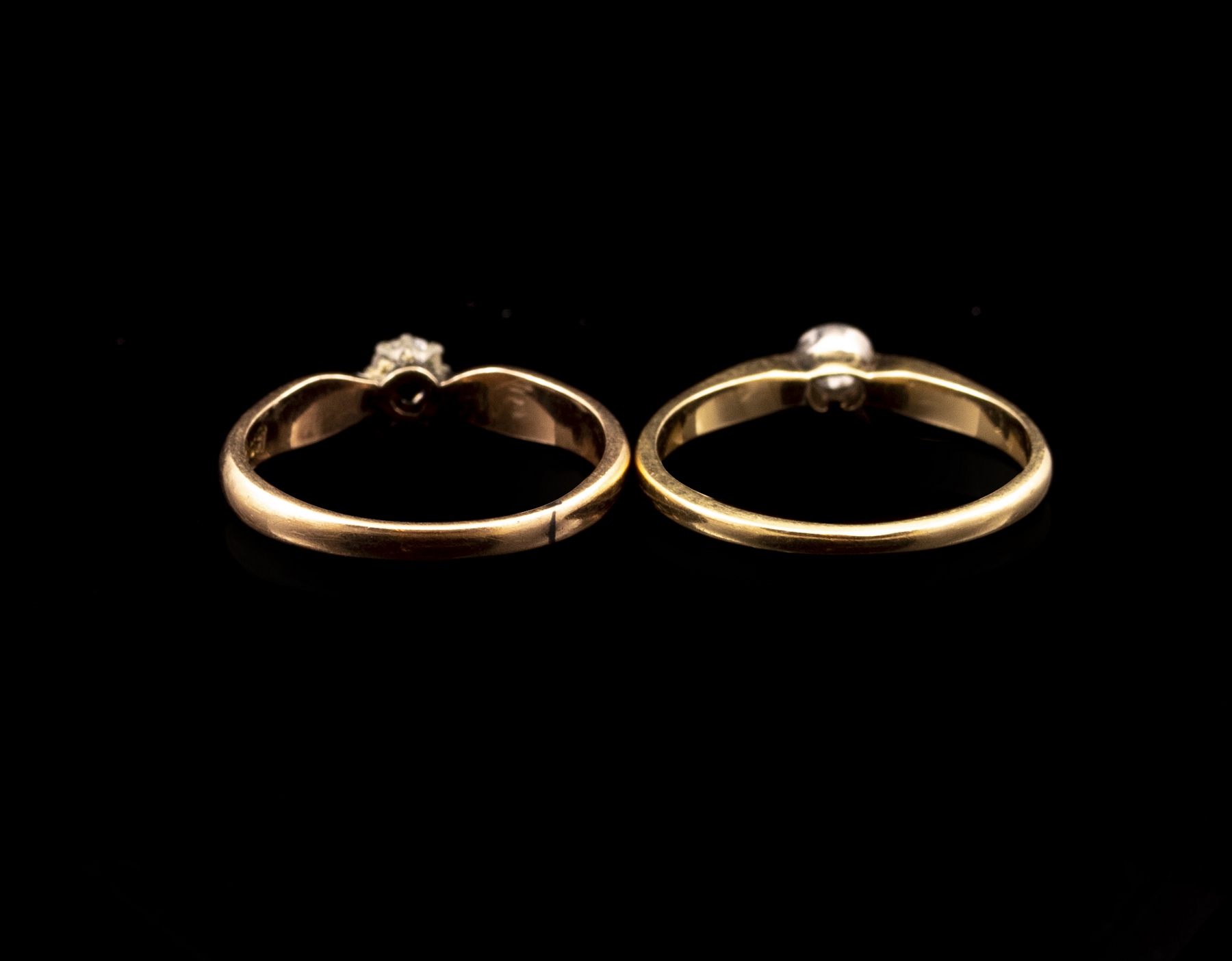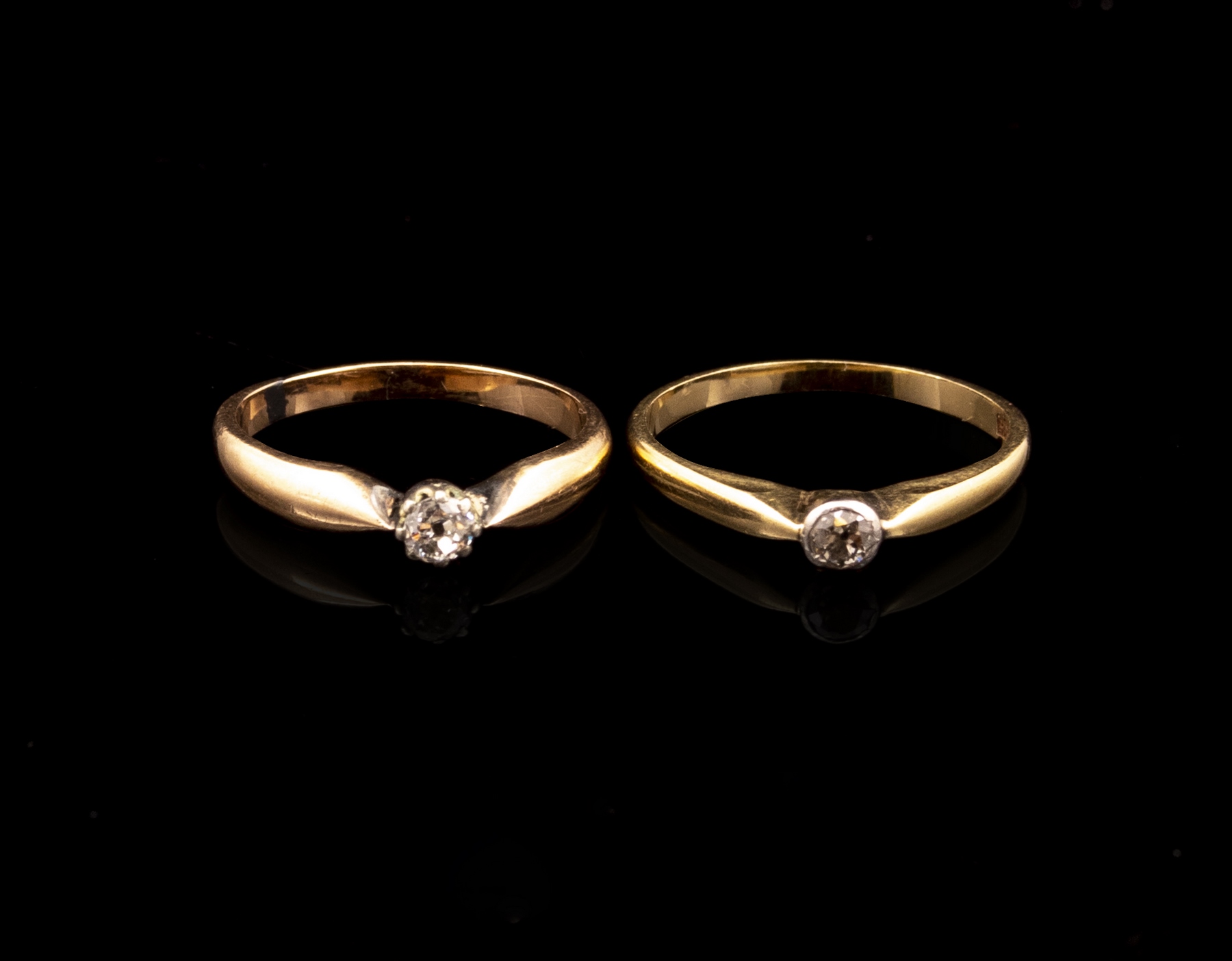 לוט 2 טבעות זהב 14K (תושבת היהלום מכסף). כל טבעת משובצת יהלום מרכזי בחיתוך אלט-שליף במשקל של כ-13 נק’, כ-26 נק’ סה»כ. מידה: 1/4 7-6 US, משקל כולל: 4.3 גרם. לא חתומות, הזהב נבדק.