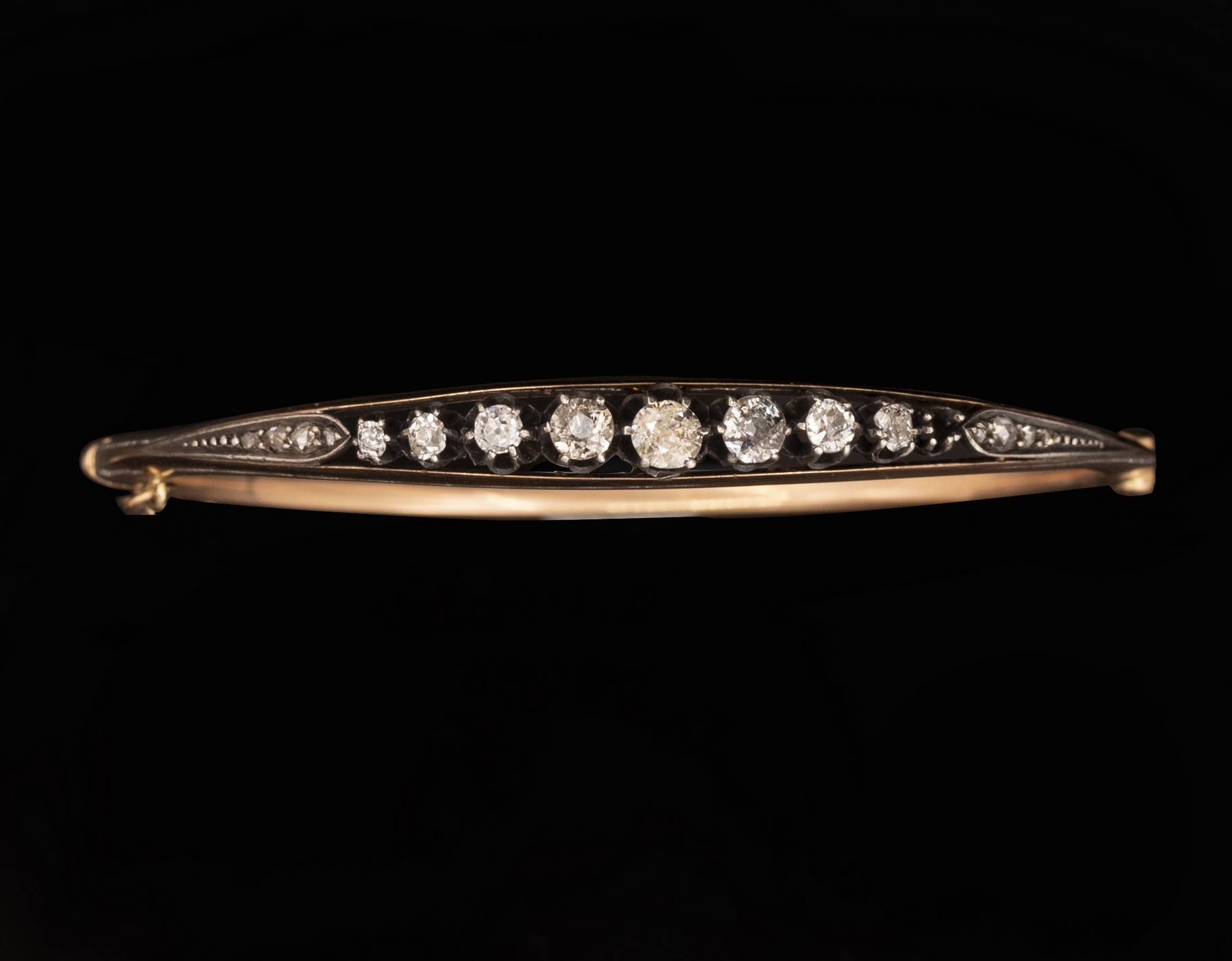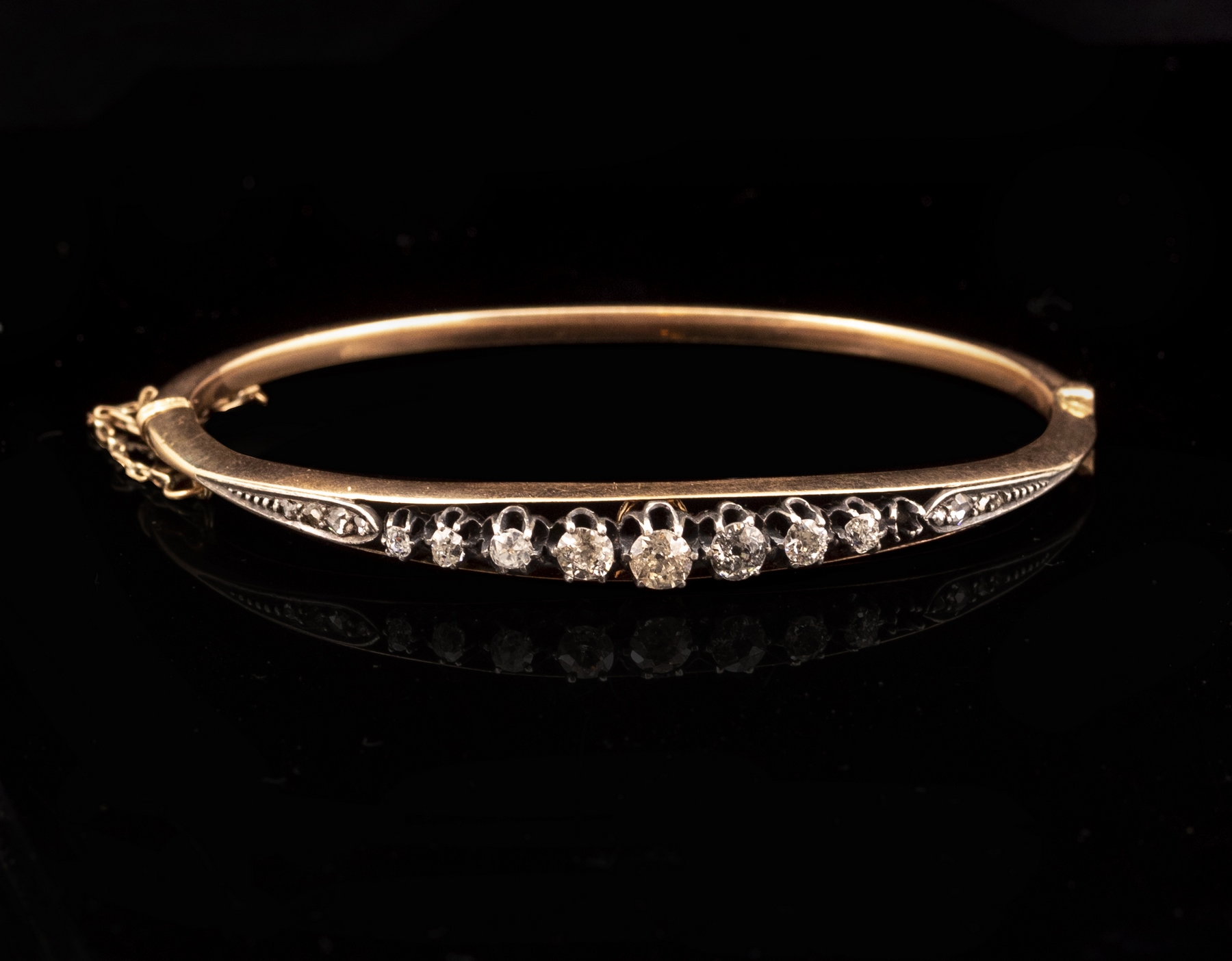 צמיד זהב 14K עתיק, משובץ יהלומים בחיתוך אלט-שליף: יהלום אחד כ-20 נקודות, 2 יהלומים של כ-16 נקודות, 2 יהלומים של כ-10 נקודות, 2 יהלומים של כ-5 נקודות ויהלום אחד של כ-3 נקודות. סה»כ כ-0.9 קראט יהלומים. תושבות היהלומים מכסף. מידות פנים: 57X51 מ»מ, רוחב מקסימלי: 6 מ»מ. משקל: 16.7 גרם. יהלום אחד חסר. לא חתום, הזהב נבדק.