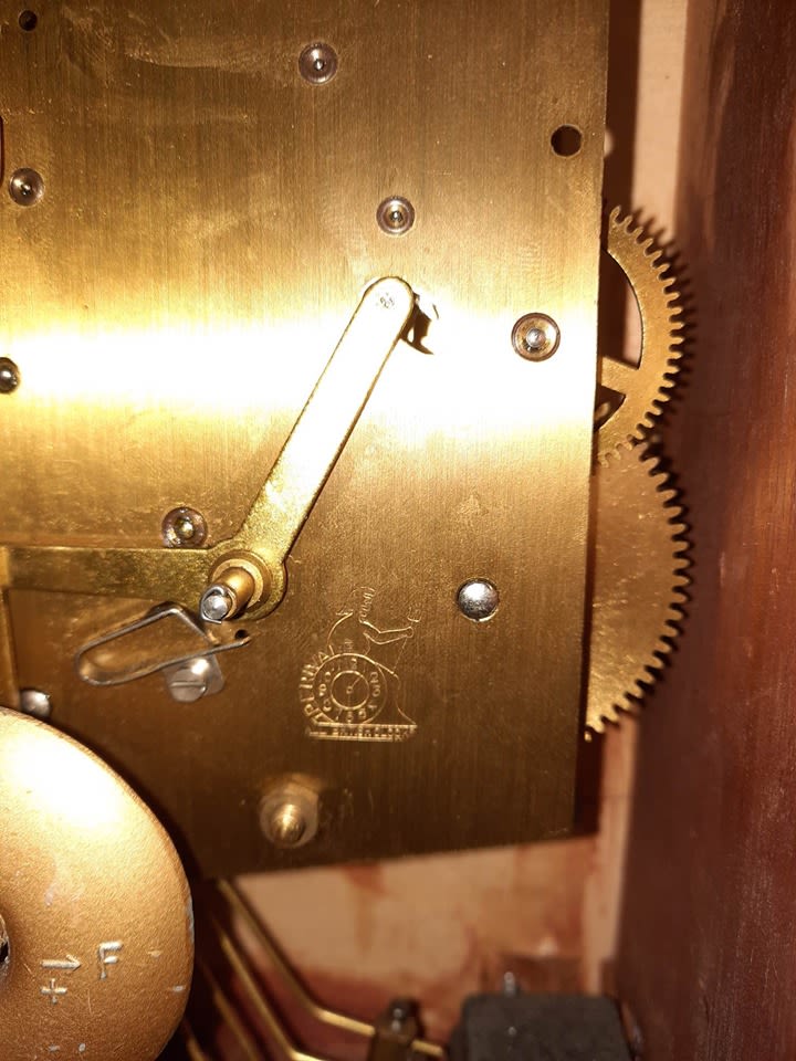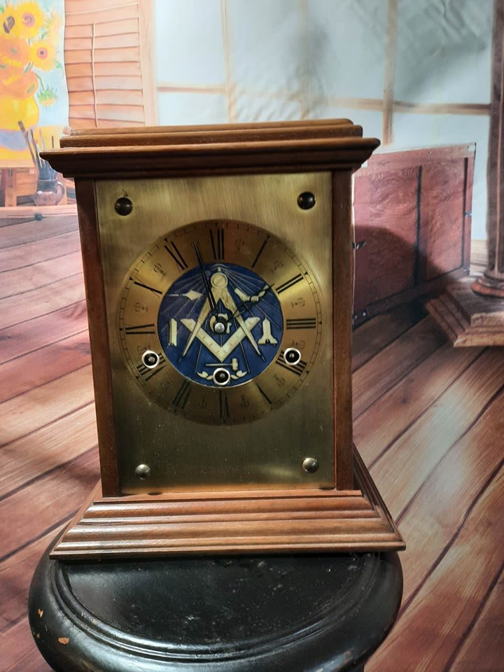 A large vintage brass faced Masonic mantle clock made by the Perivale Clock Co.