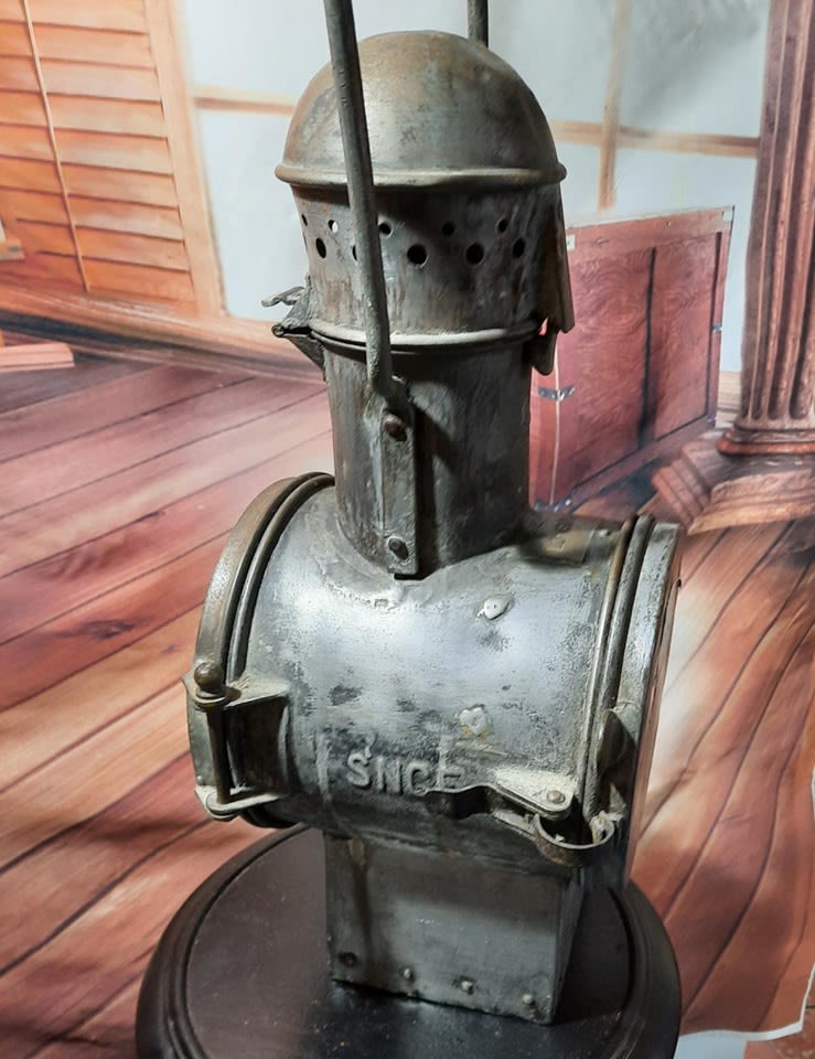A large antique French railway kerosene lamp with bullseye lense, front and rear opening. Marked SNCF and Longuyon.