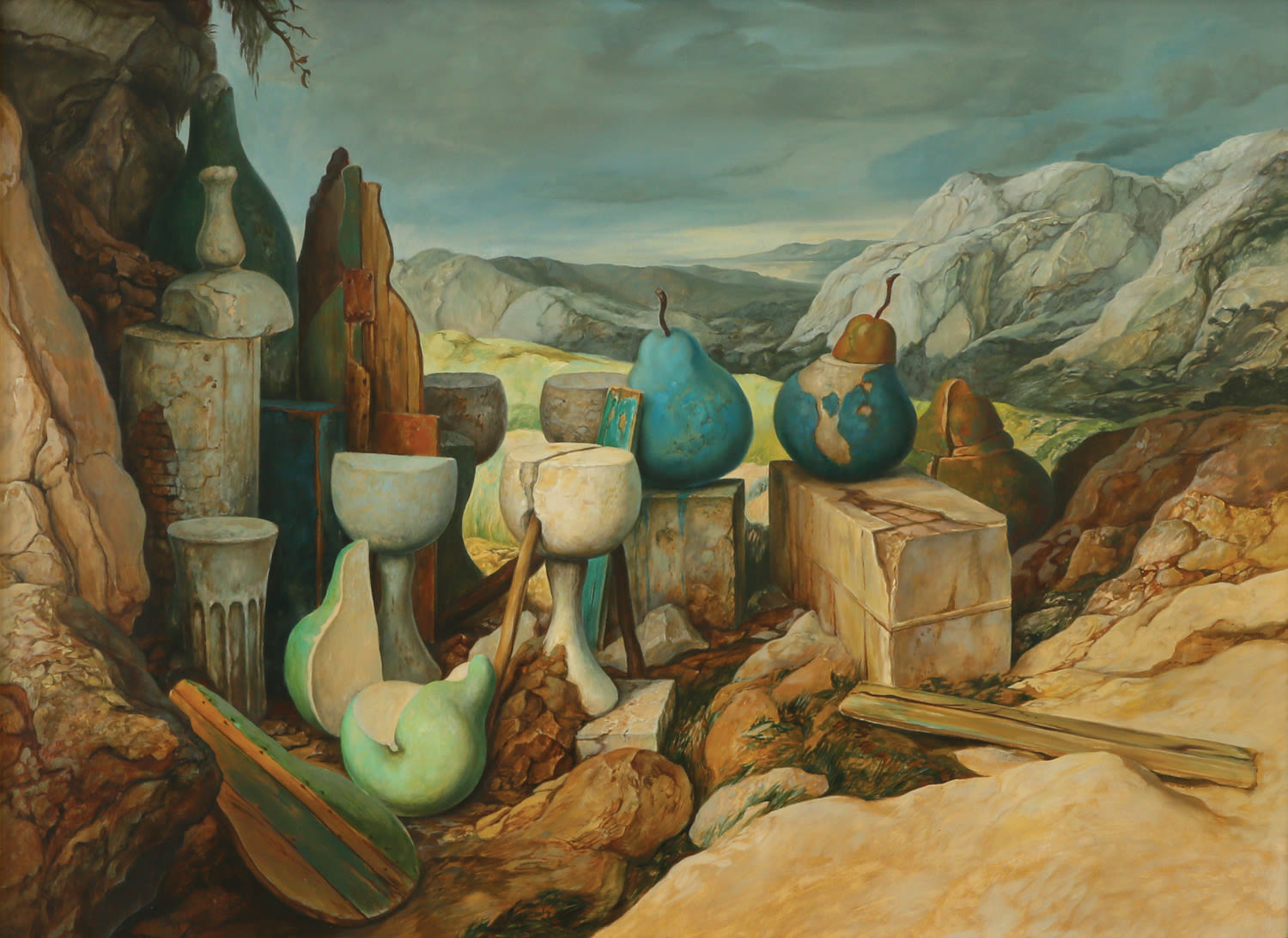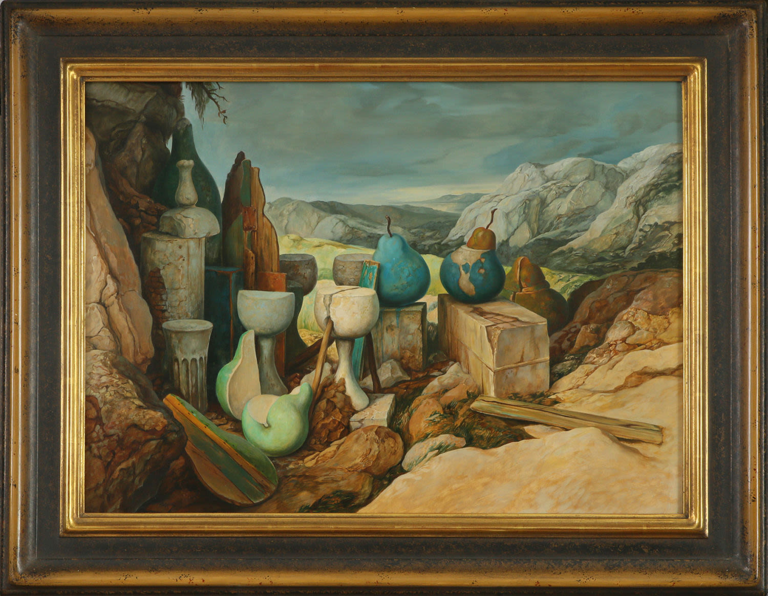 אגסים בנוף, שמן על בד, 54×73 ס"מ, חתום.