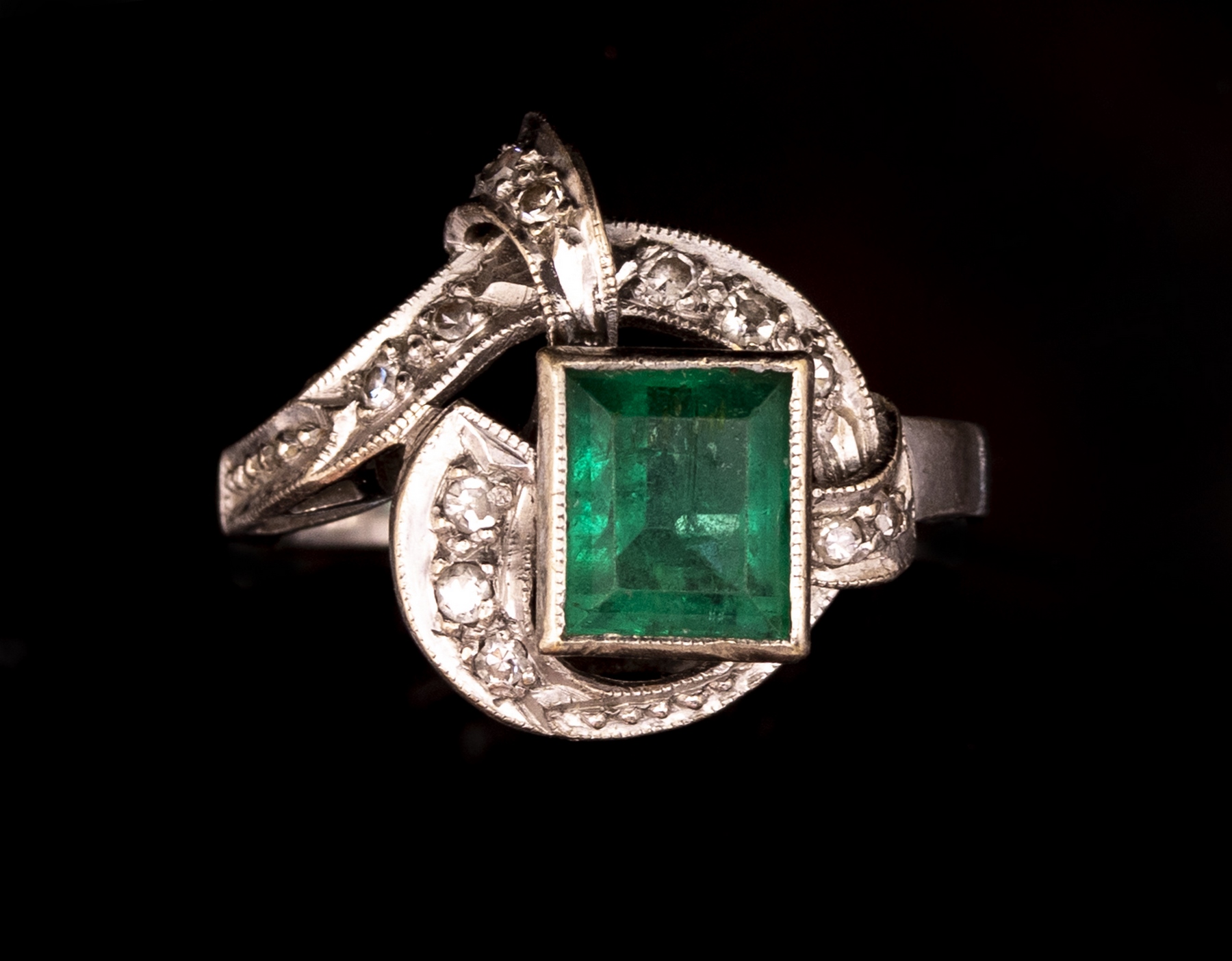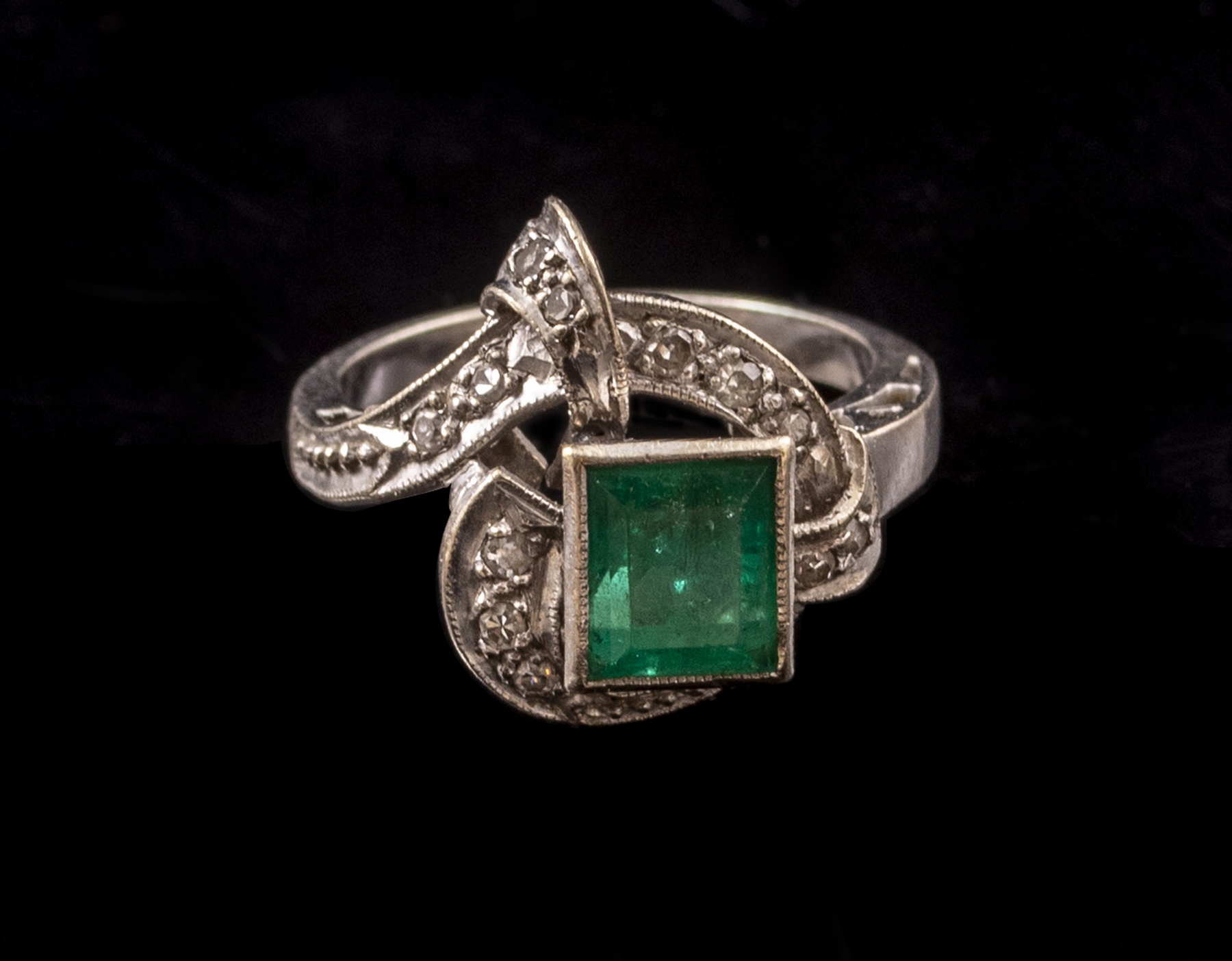 טבעת זהב לבן 14K משובצת אמרלד מרכזי (מידות: 6X5 מ»מ) וכ-10 יהלומים זעירים במשקל כ-1.5 נק’ כ»א. מידה: US 6.5. משקל: 5.5 גרם. לא חתומה, זהב נבדק.