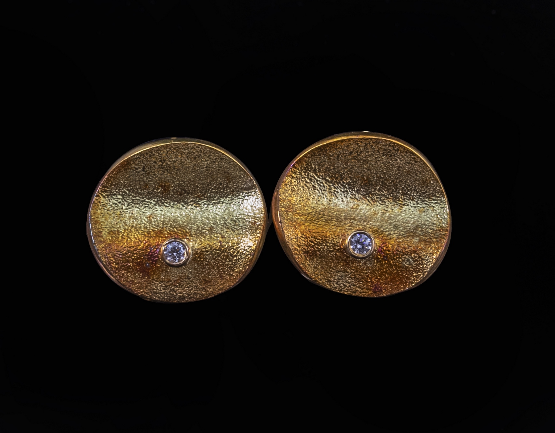 זוג עגילי זהב 14K, תוצרת עידית. משובצים ביהלום במשקל של כ-4 נק’ כ»א. קוטר: 19 מס»מ, משקל כולל: 8 גרם, חתומים.
