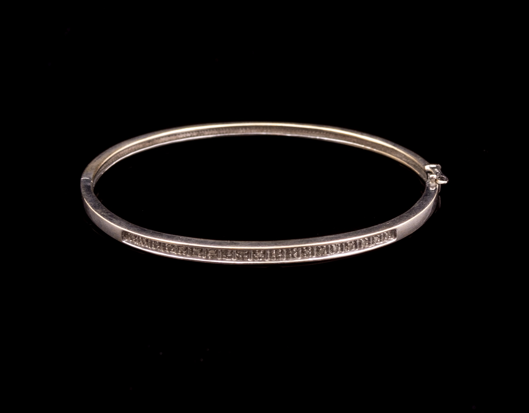 צמיד זהב לבן 9K משובץ 19 יהלומים במשקל של כ-1 נק’ כ»א. מידות פנימיות: 48X57 מ»מ, רוחב: 3 מ»מ. משקל: 7 גרם. חתום
