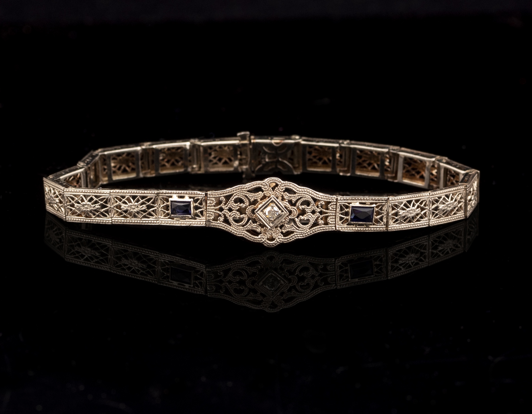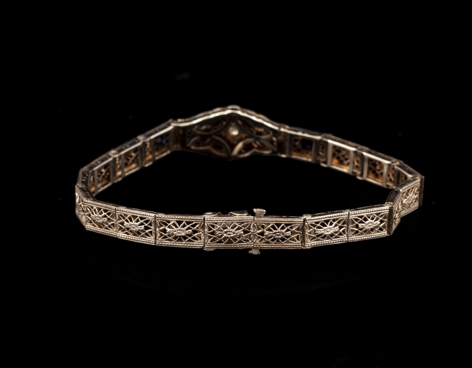 צמיד זהב לבן 14K אר-דקו, משובץ יהלום במשקל כ-3 נק’. ו-2 ספירים. אורך: 17.5 ס»מ. רוחב מקסימלי: 11 מ»מ. משקל: 5.8 גרם. חתום.