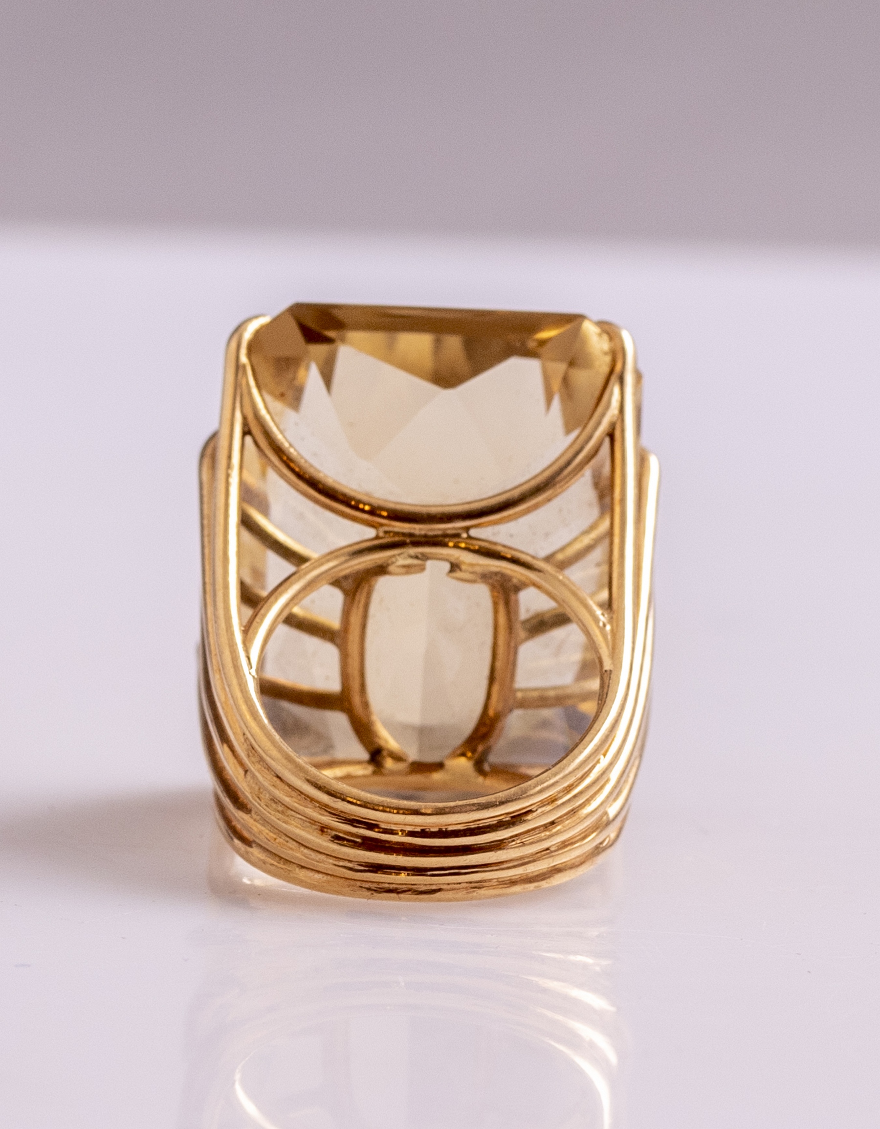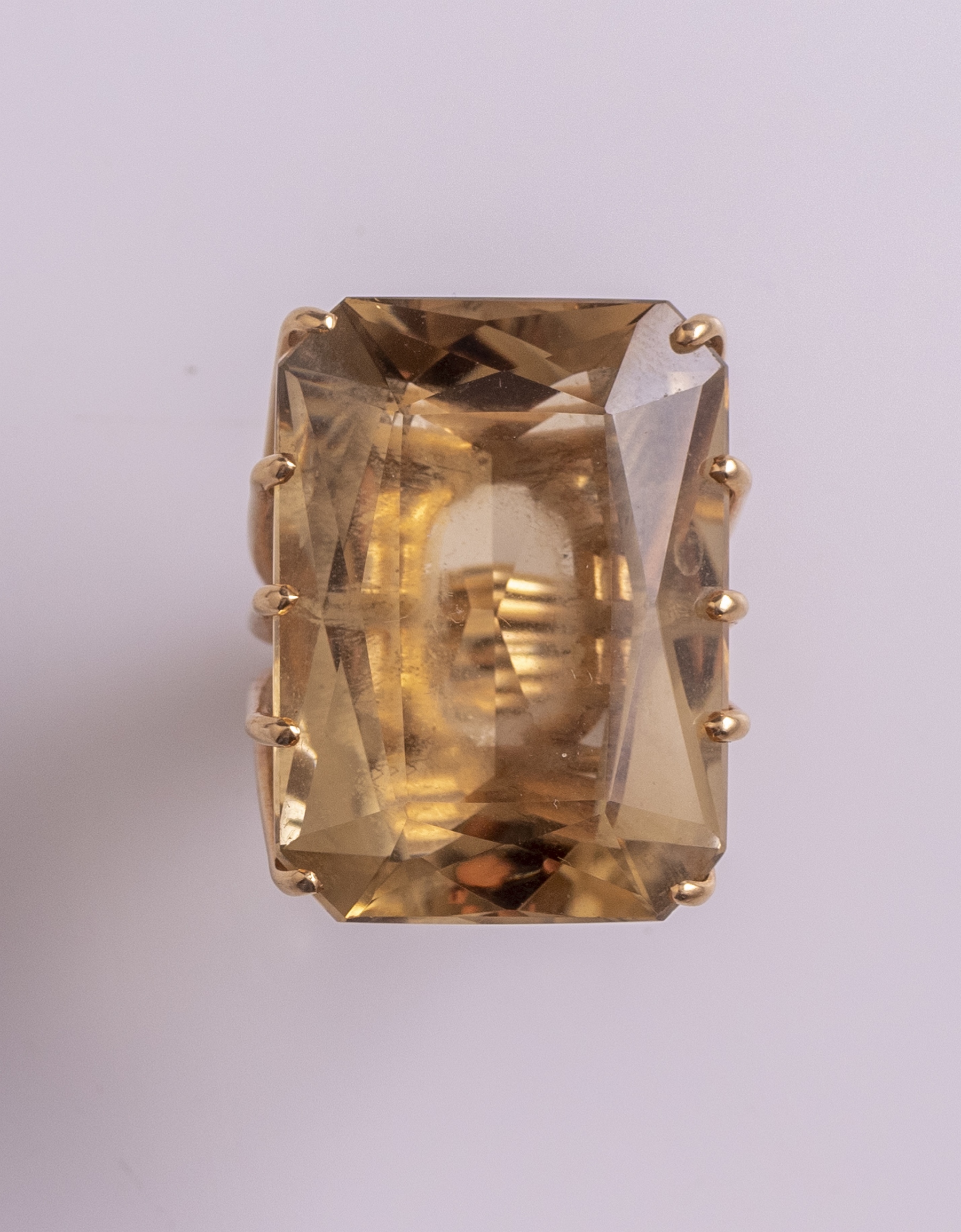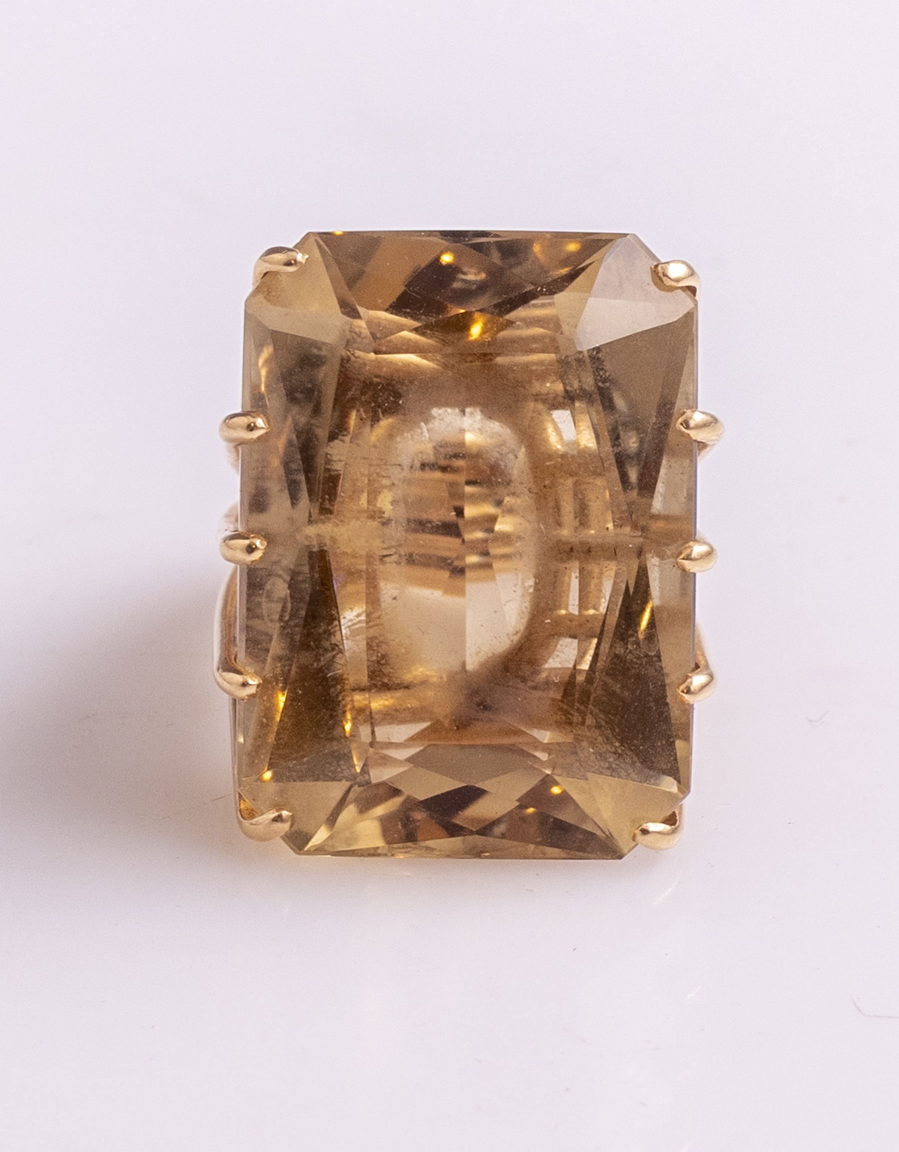 טבעת זהב 14K משובצת סמוקי קוורץ גדול (29X21 מ»מ). מידה: US 5 3/4, משקל כולל: 21.8 גרם. לא חתום, זהב נבדק.