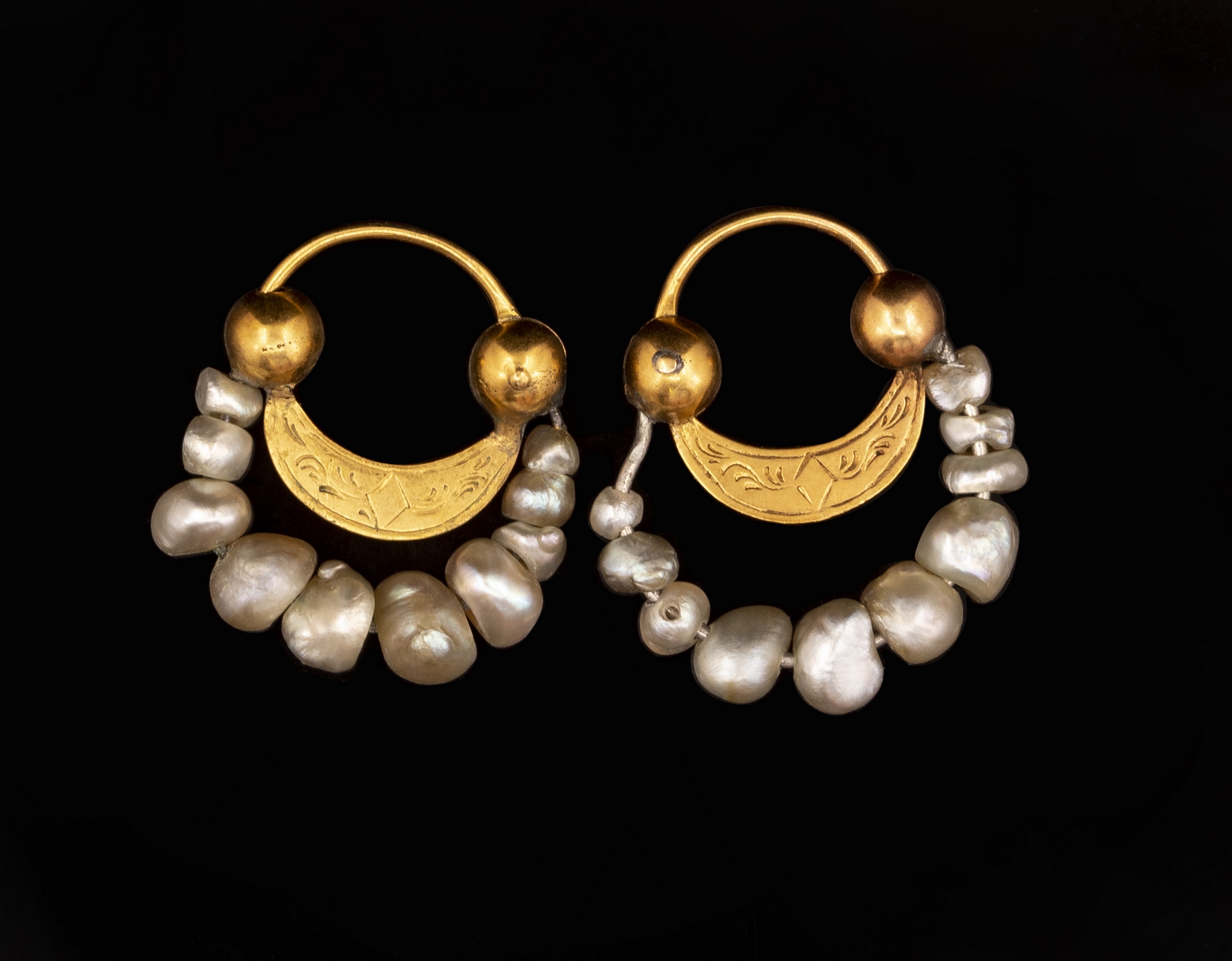 זוג עגילי זהב 14K ופנינים בסגנון בוכרי (החרוזים לא מזהב). אורך: 21 מ»מ, משקל כולל: 3.4 גרם, לא חתומים, הזהב נבדק.