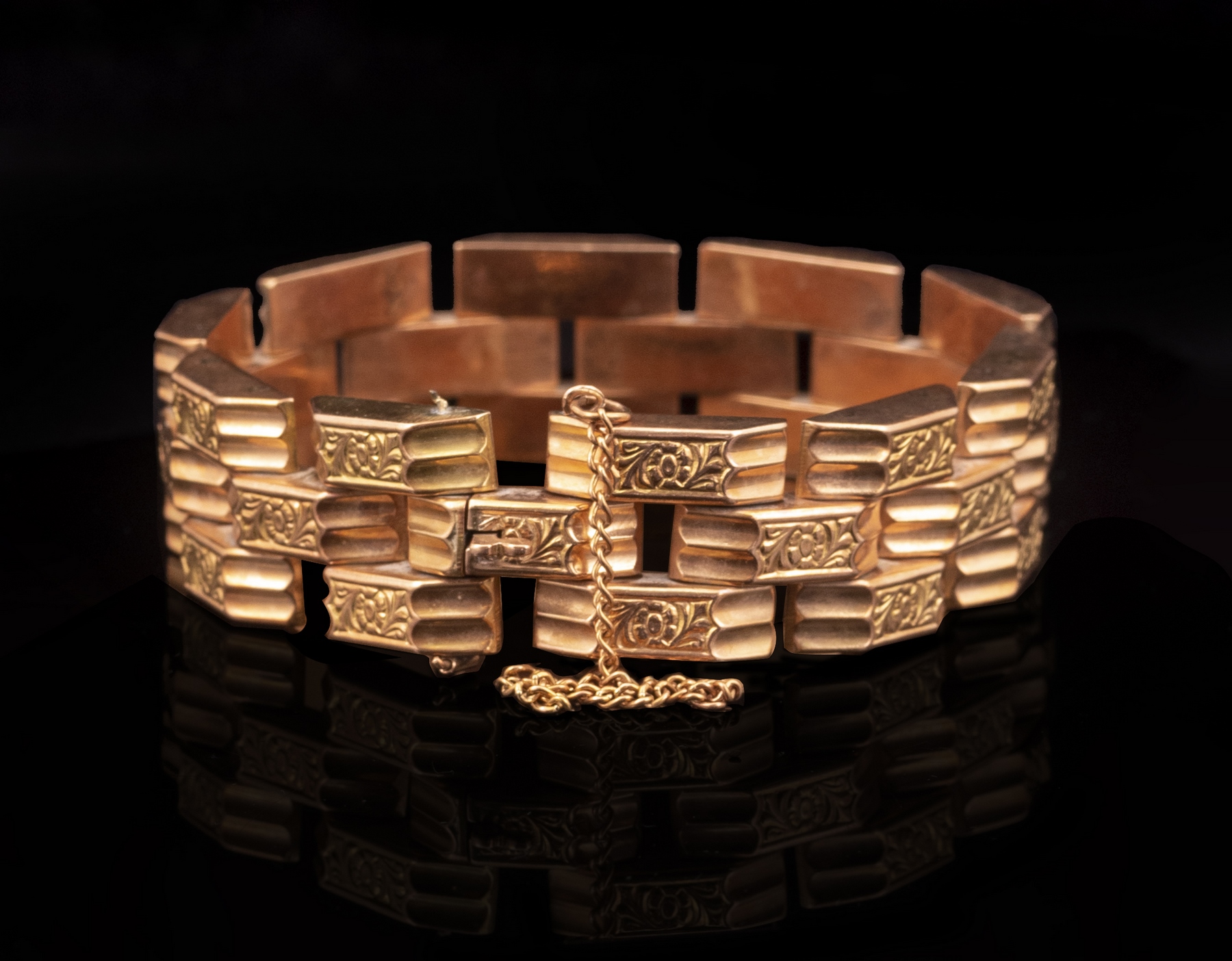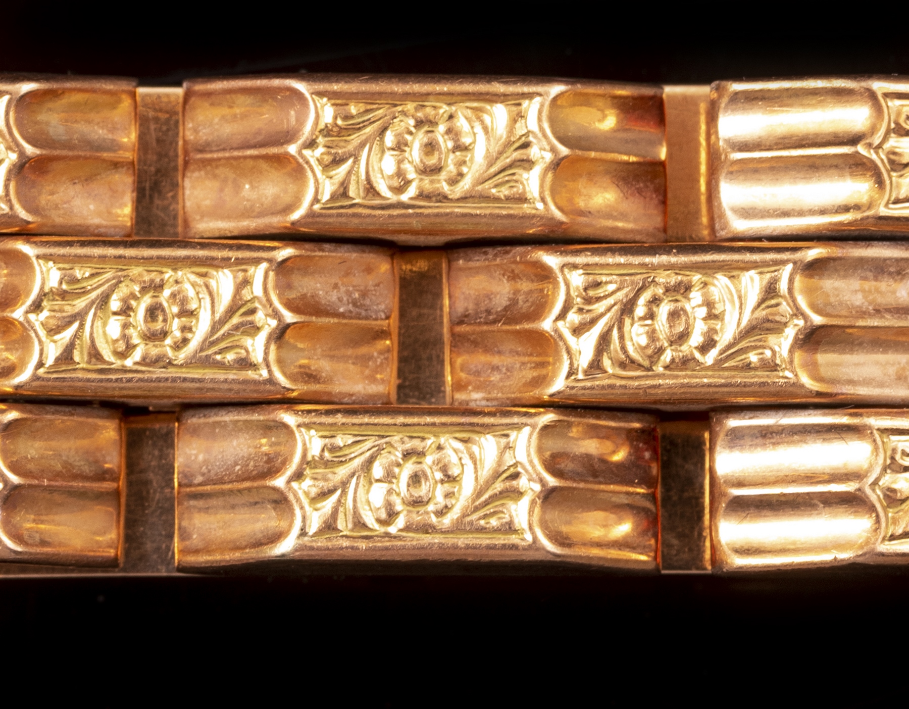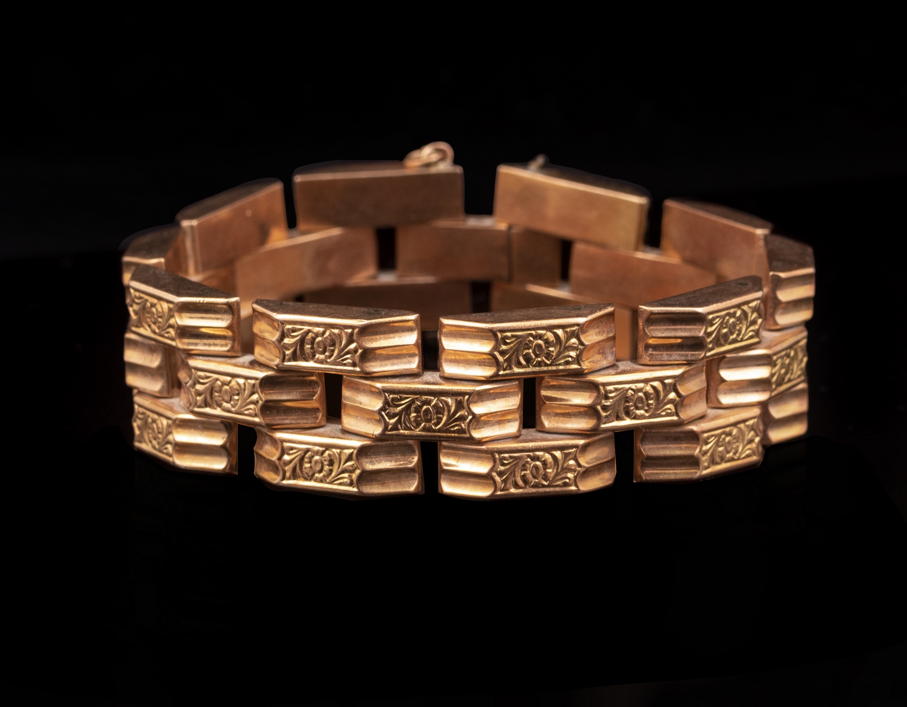 צמיד זהב 14K עשוי חוליות מעוטר בחריטות. אורך: 18.5 ס»מ. רוחב: 17 מ»מ. משקל: 32.2 גרם. חתום. שרשרת ביטחון מנותקת.