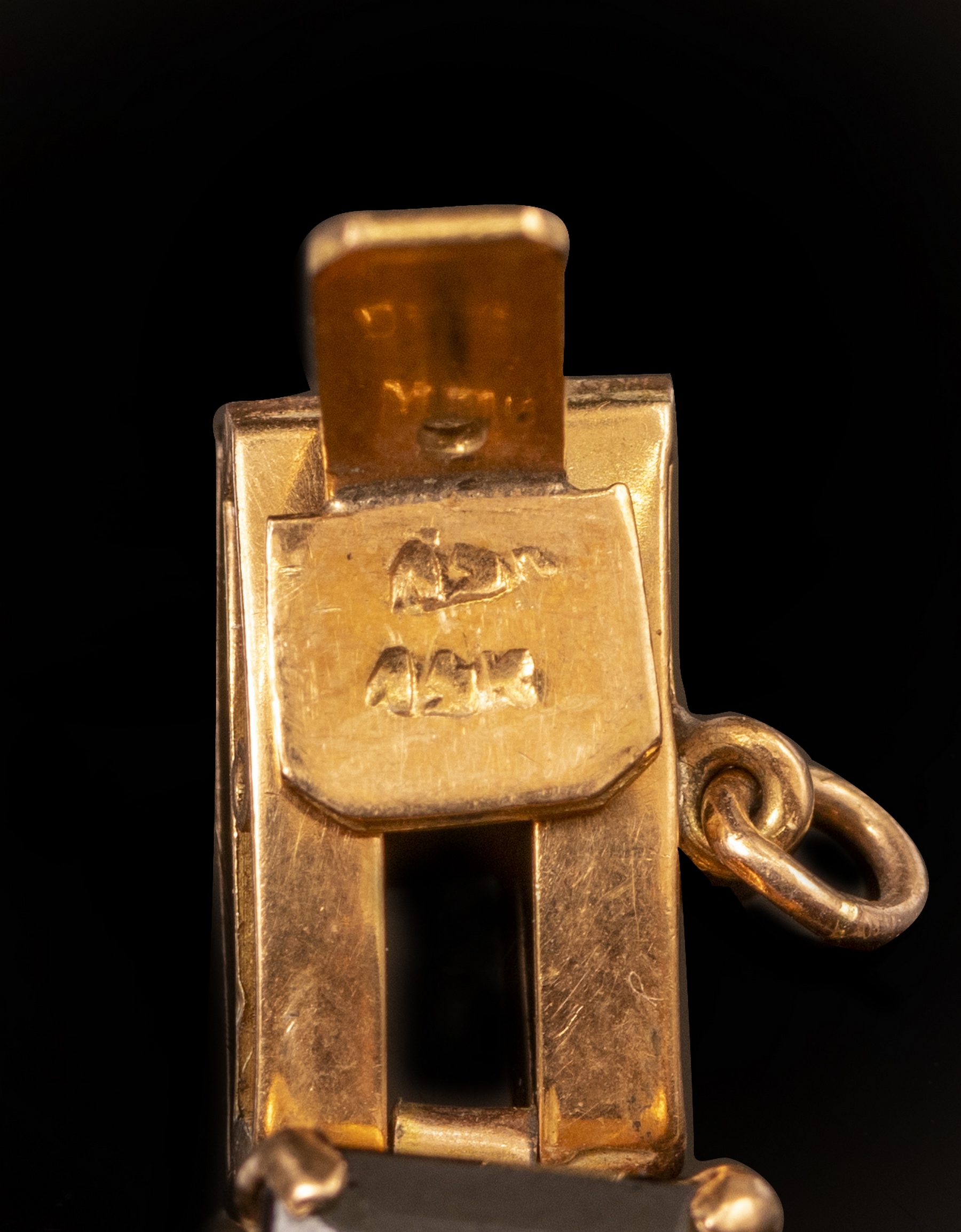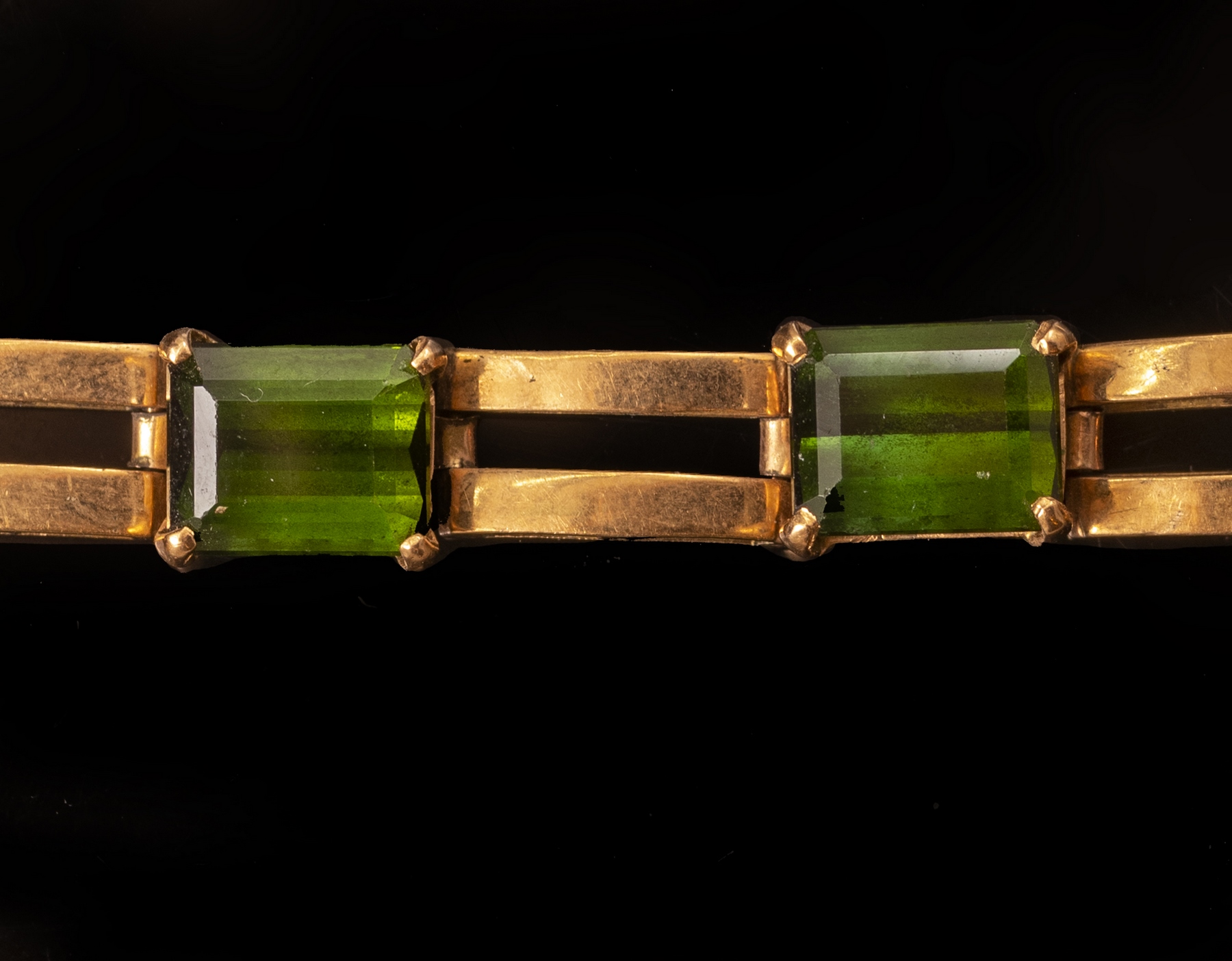 צמיד זהב 14K עשוי חוליות. משובץ 9 אבנים ירוקות (9X7 מ»מ) אורך: 19 ס»מ, רוחב: 7 מ»מ. משקל: 20 גרם. חתום.