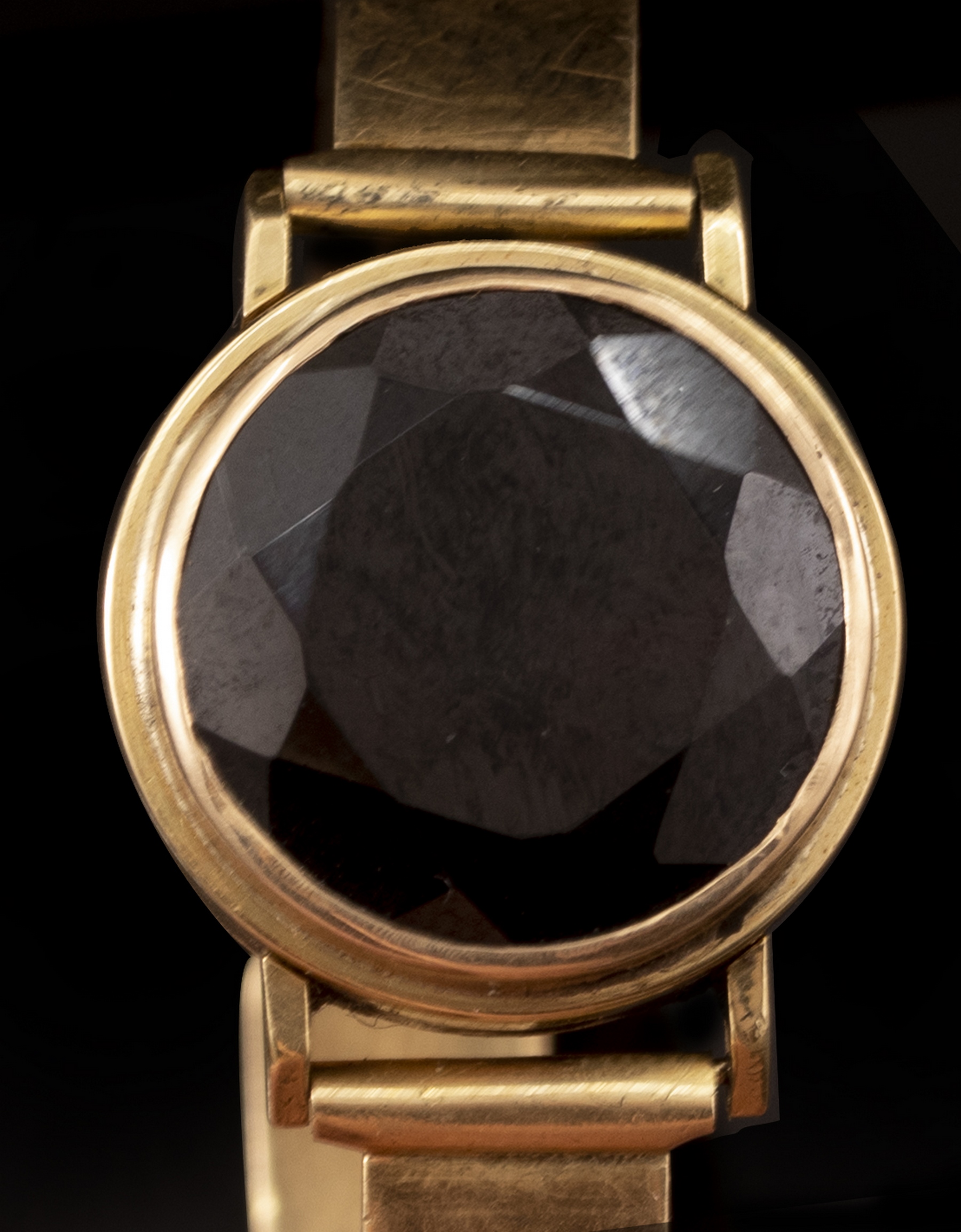 צמיד זהב 14K שהוסב משעון יד, במקום מנגנון השעון שובצה אבן חן כחולה. רצועת השעון עשויה זהב 14K (לא חתום, זהב נבדק) מסגרת השעון עשויה זהב 18K (חתום). משקל נטו (ללא האבן): 13 גרם, קוטר מקסימלי: 5.7 ס"מ, קוטר האבן: 1.9 ס"מ.