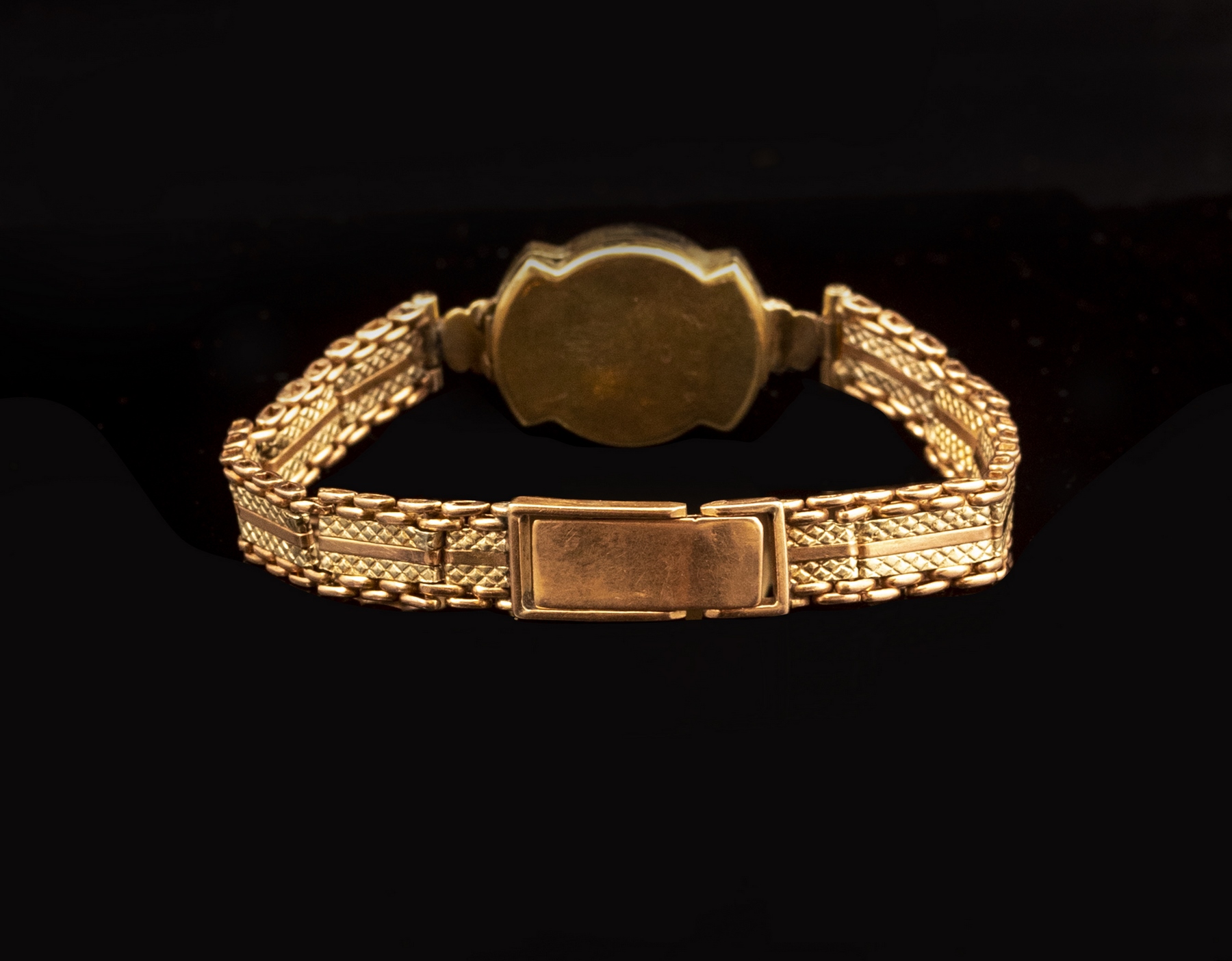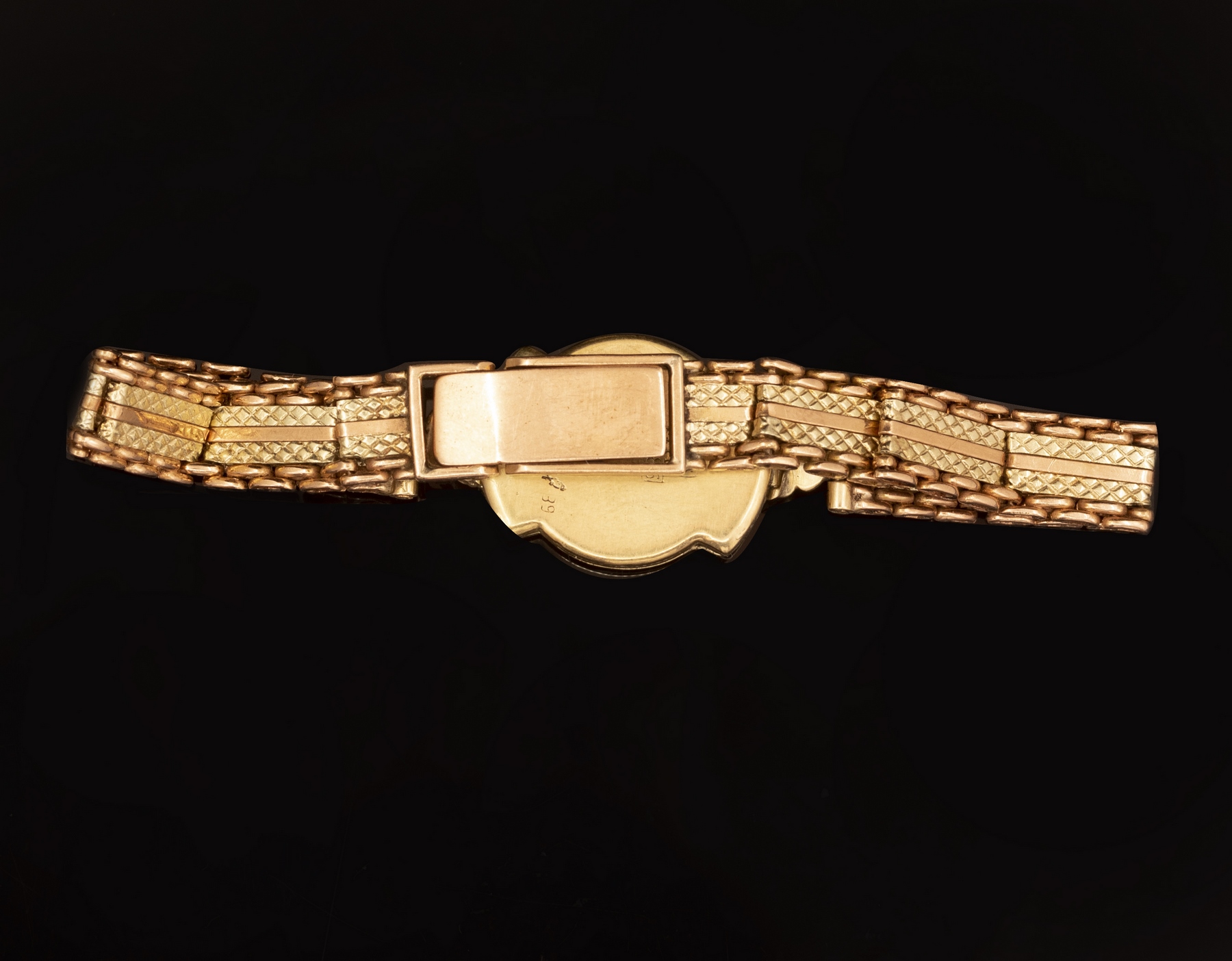 צמיד זהב 14K שהוסב משעון יד לאישה, במקום מנגנון השעון שובצה אבן חן אדומה. רצועת השעון ומסגרת השעון עשויות זהב 14K (חתומים). משקל כולל (יחד עם האבן): 19.6 גרם, אורך: 19 ס»מ, קוטר האבן: 1.4 ס»מ.