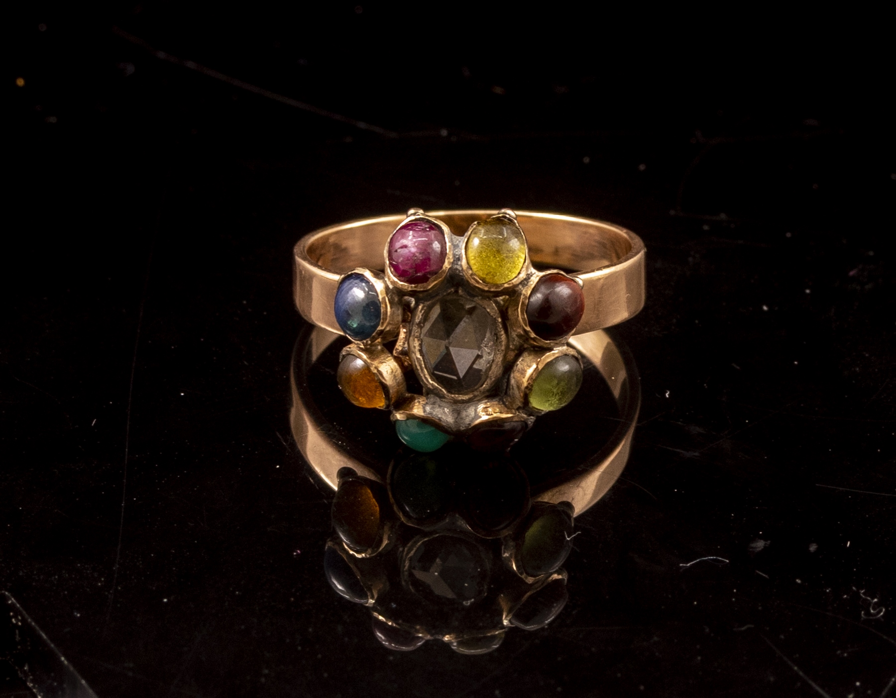טבעת זהב 14K סובייטית בצורת פרח, משובצת דיאמנט מרכזי (6X4 מ»מ) וסביבו 8 אבני חן שונות. מידה: 3/4 8 US, משקל: 4.7 גרם. חתומה.