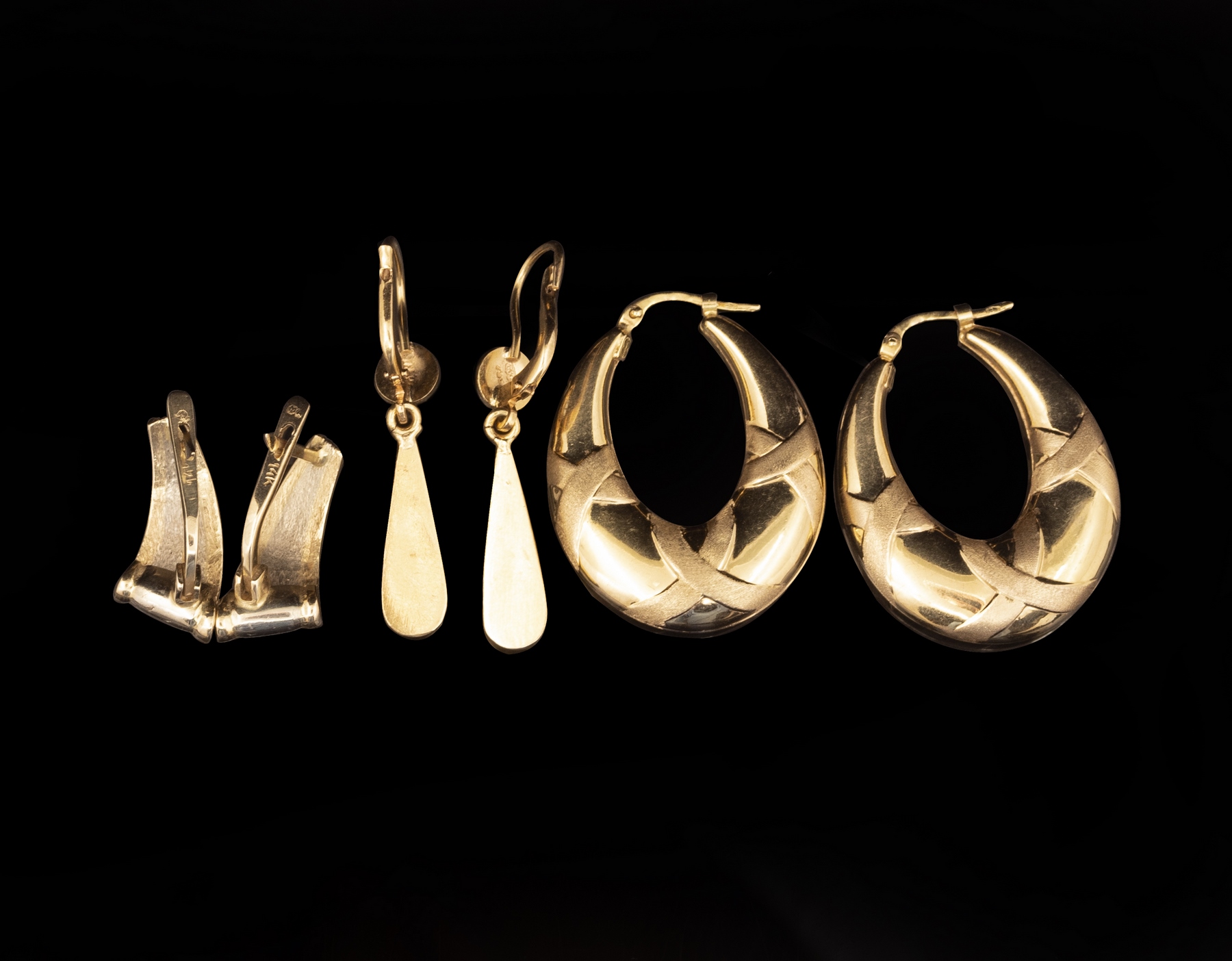 לוט 3 זוגות עגילי זהב 14K. אורך: 21-31 מ»מ. משקל כולל: 14.1 גרם. חתומים.