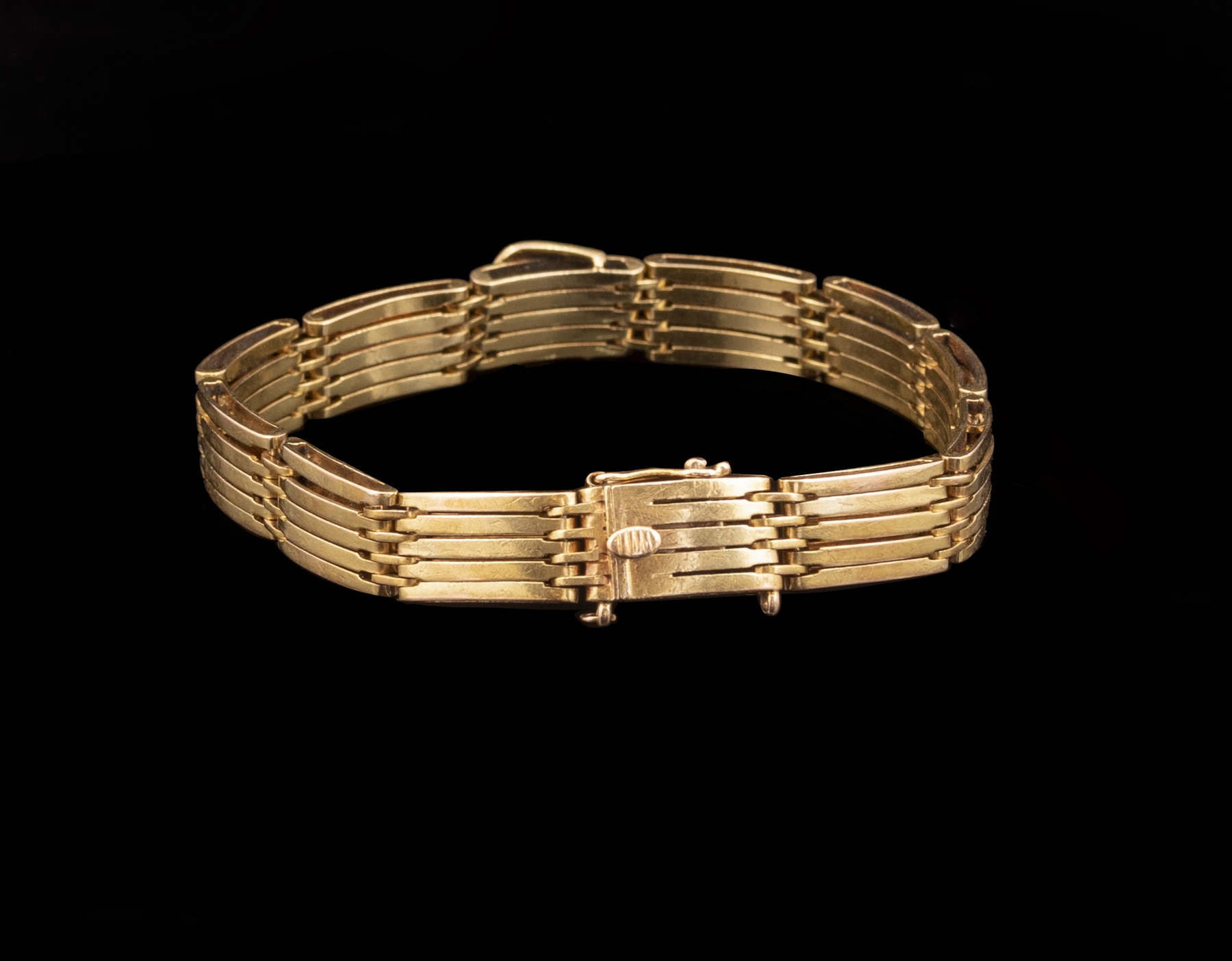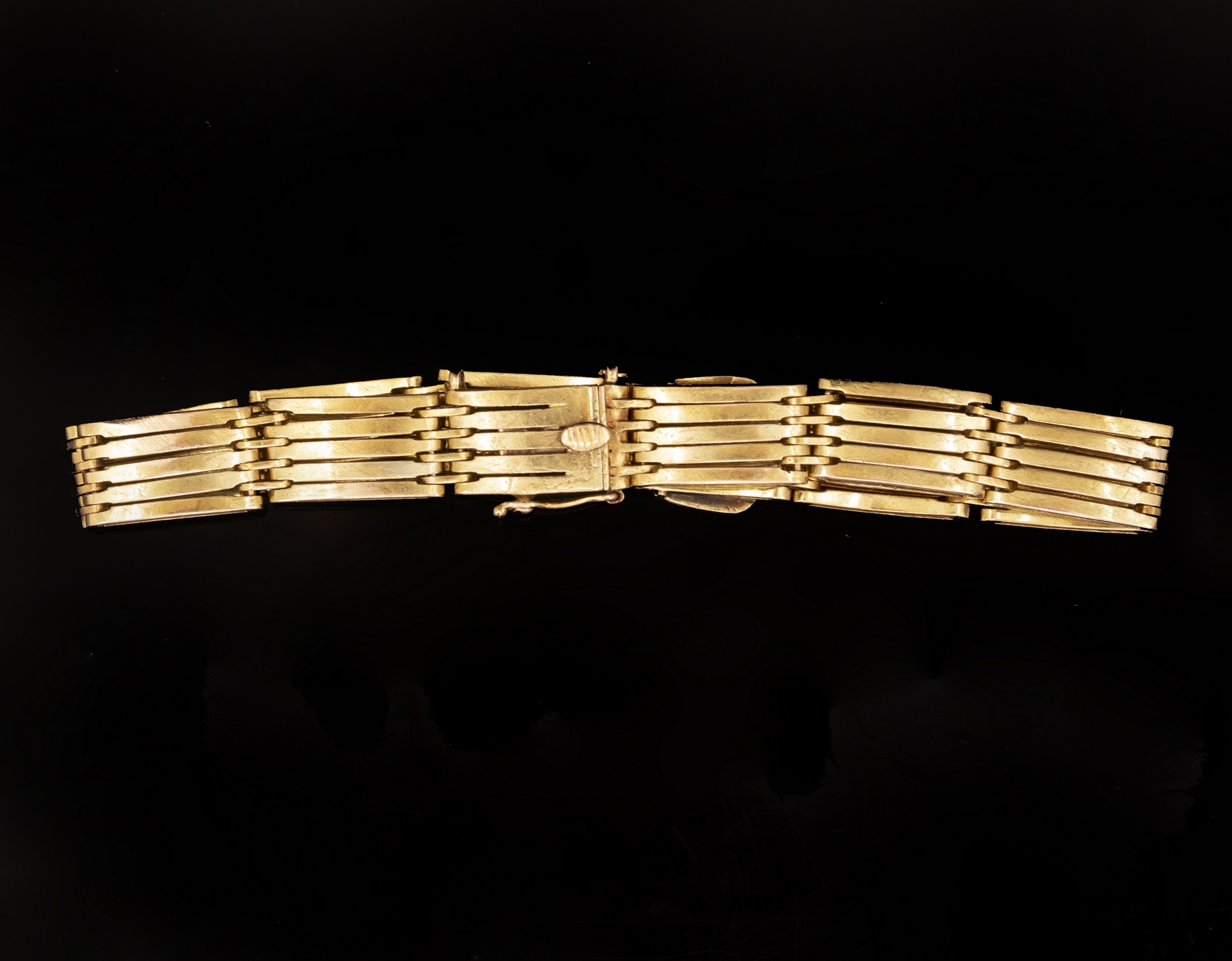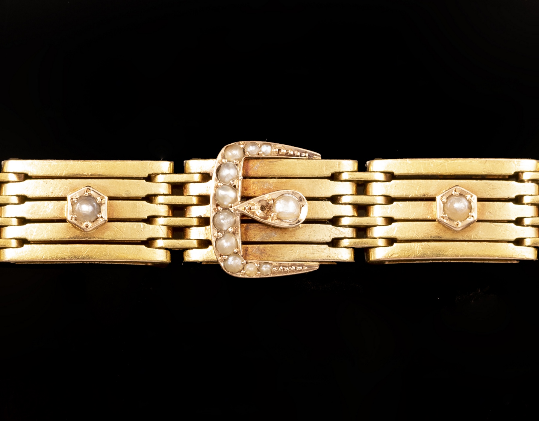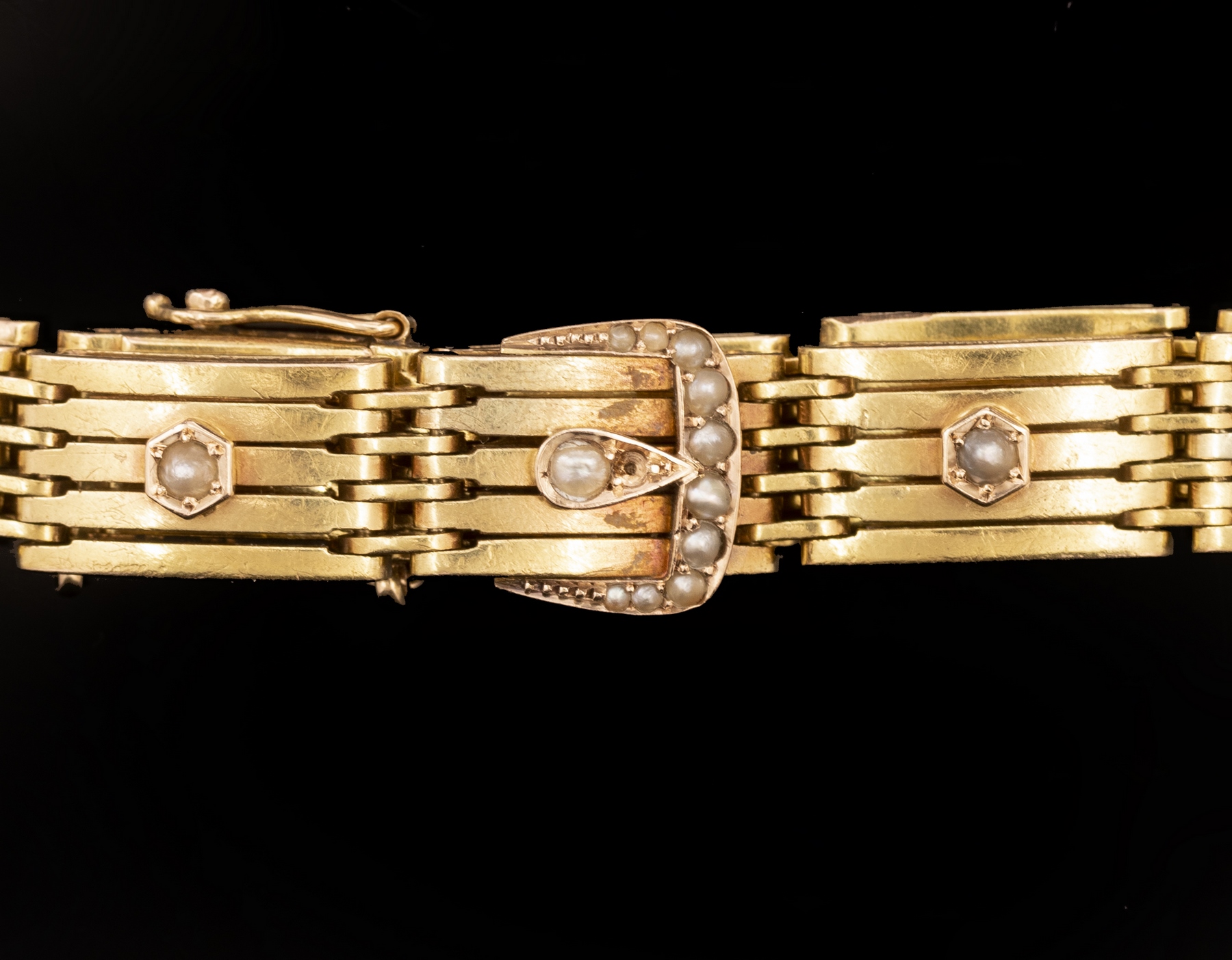צמיד זהב 14K עשוי חוליות בצורת חגורה. משובץ פנינים. אורך: 19 ס»מ. רוחב: 9 מ»מ. משקל: 23.6 גרם. חתום.