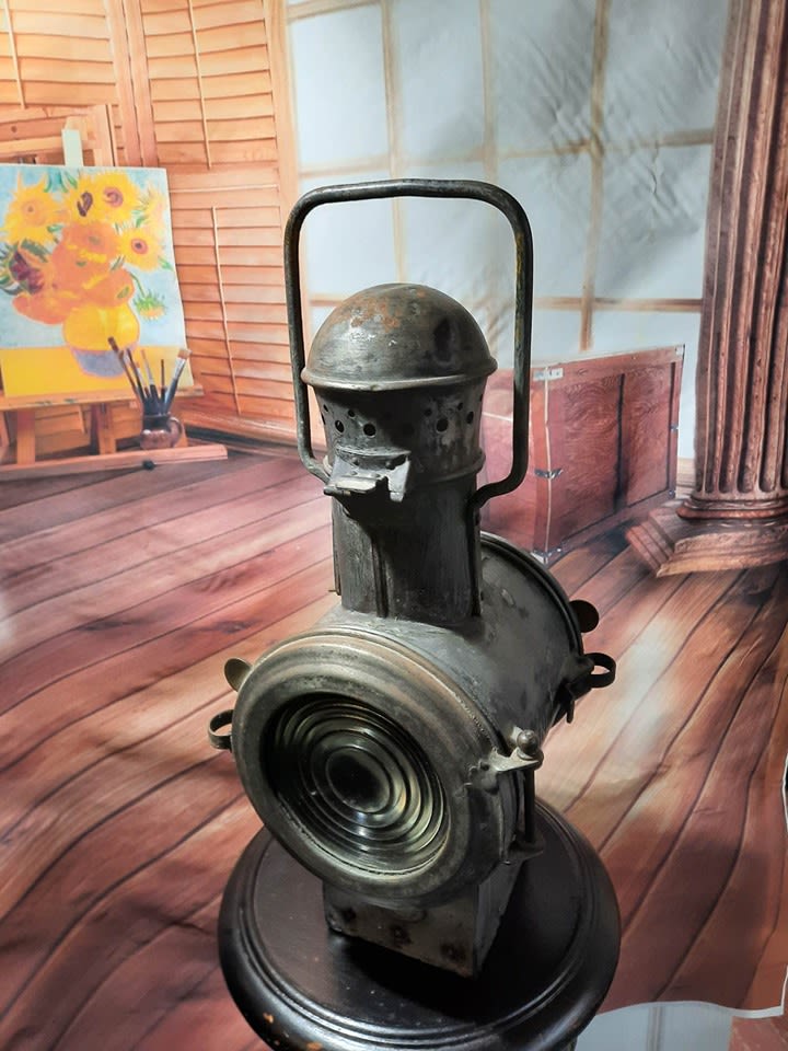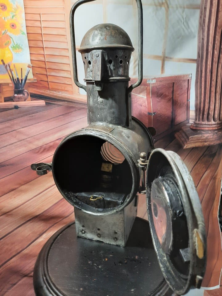 A large antique French railway kerosene lamp with bullseye lense, front and rear opening. Marked SNCF and Longuyon.