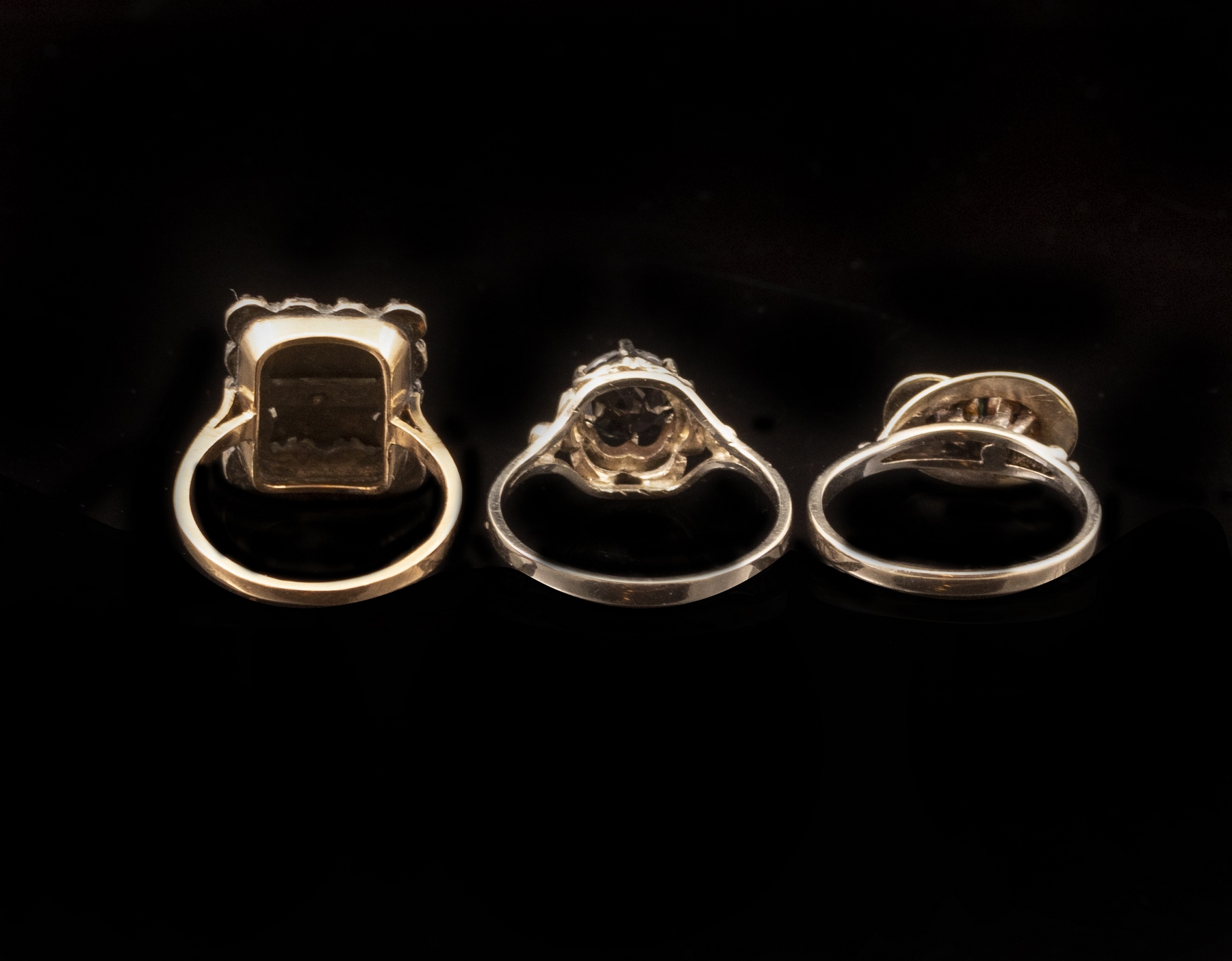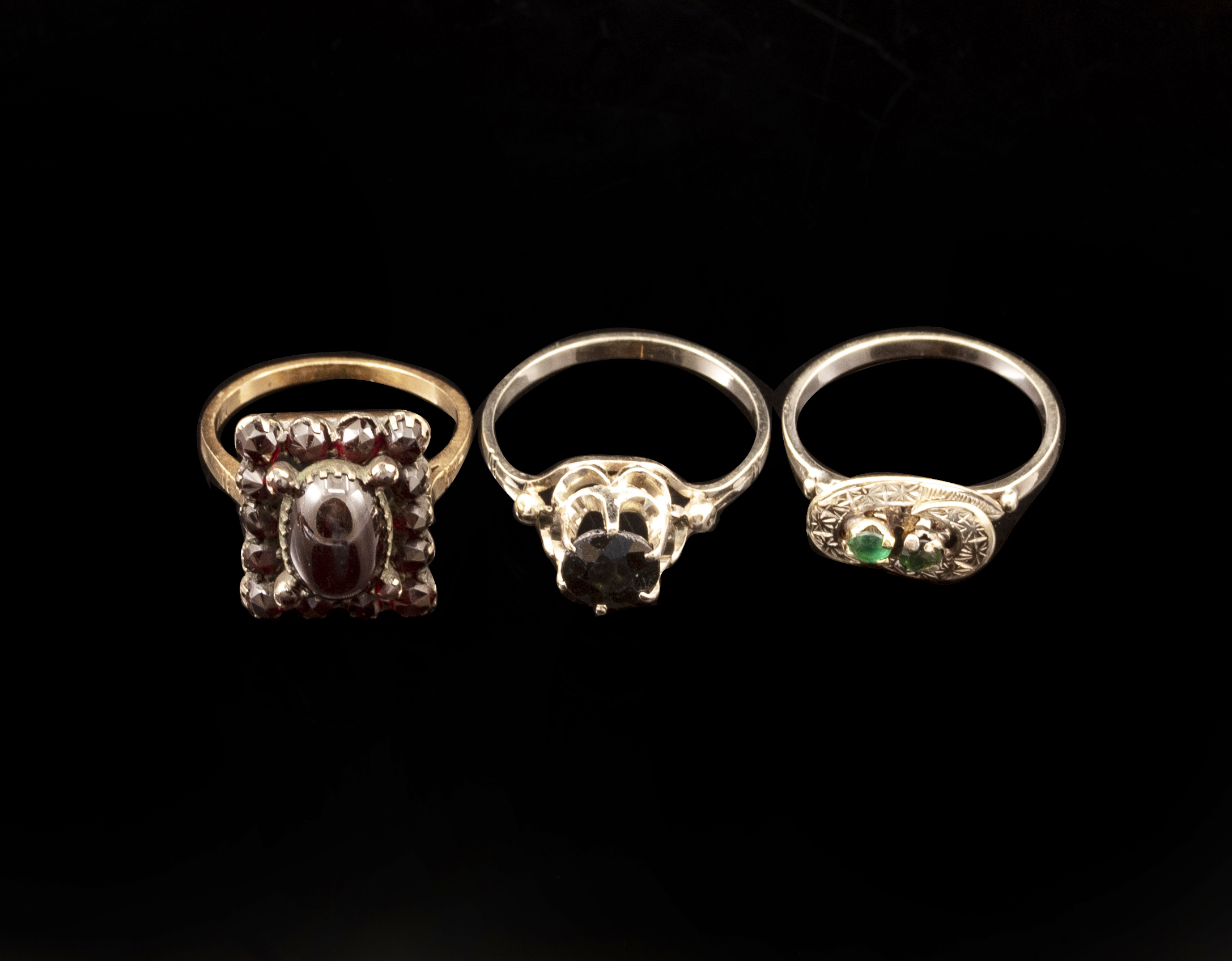 Lot of 3 14K gold rings, including two set with garnets and one with onyx. Size: 6.5-8 US, Weight: 9.6 grams. Apparently not hallmarked, tested gold.