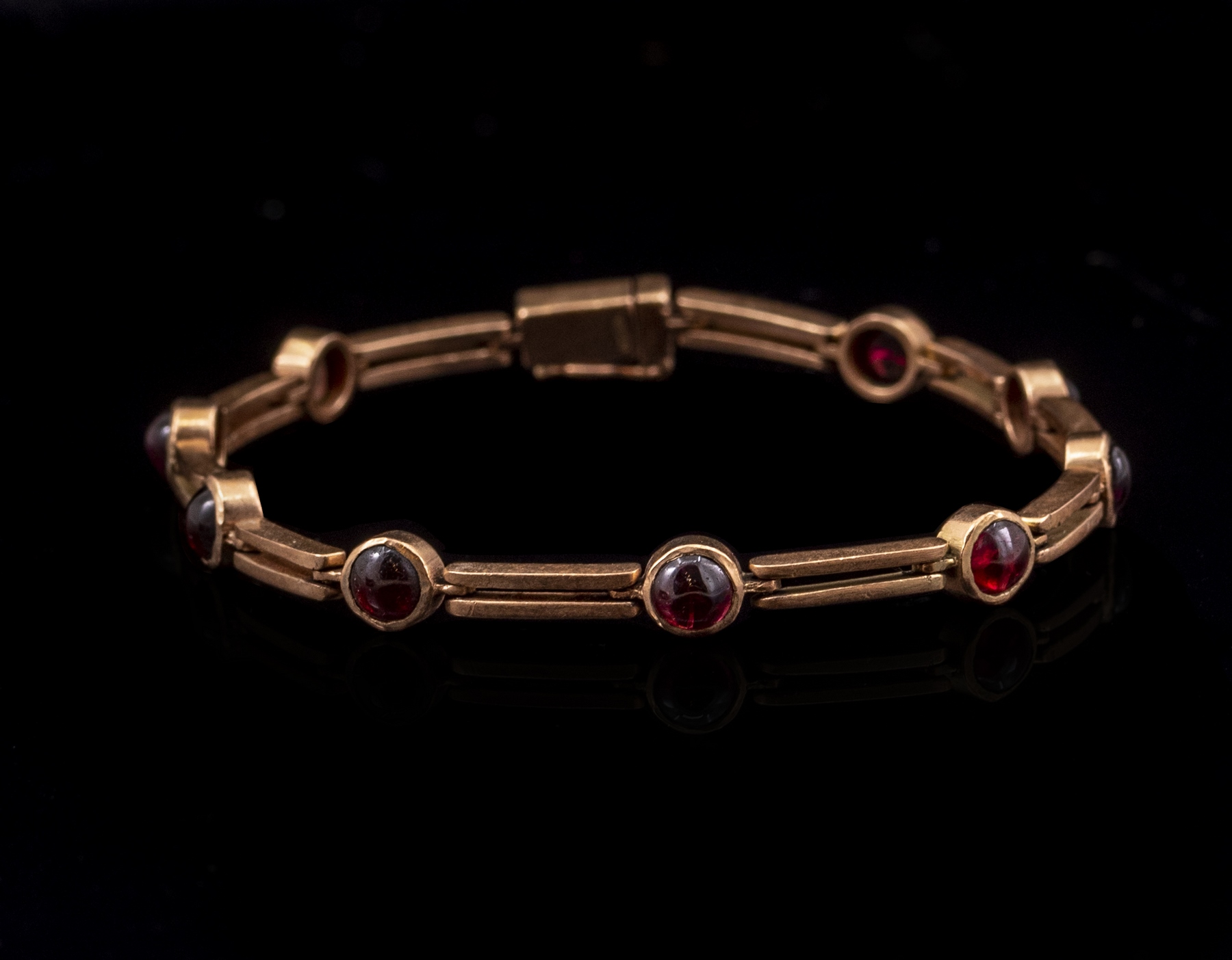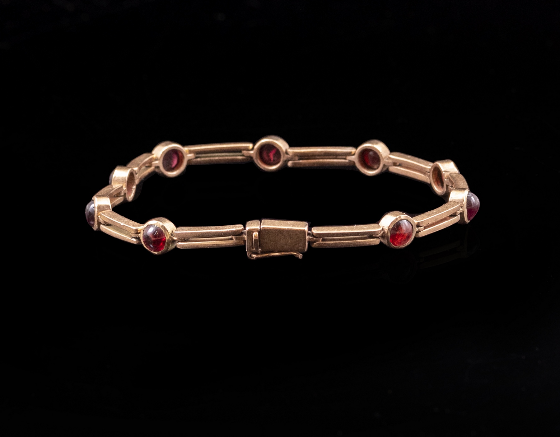 English 9K gold bracelet set with garnets. Length: 19.5 cm, weight: 13.4 grams. Hallmarked.