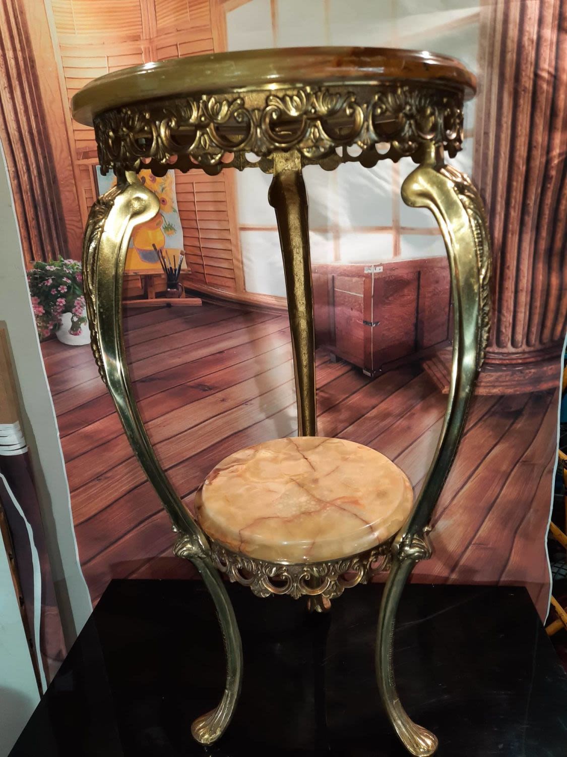Antique french brass stand with round onyx top