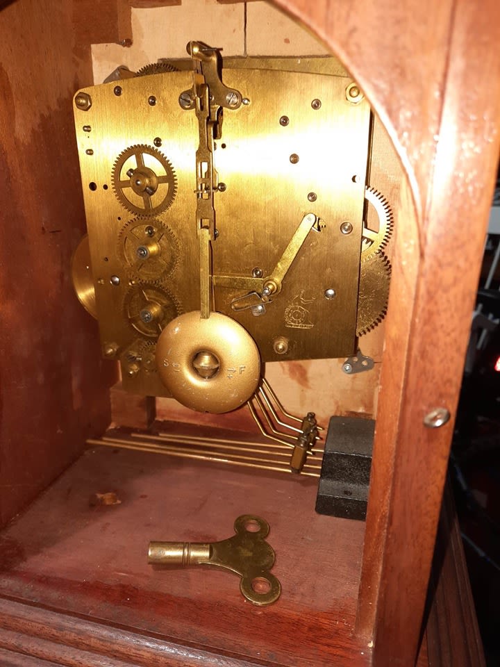 A large vintage brass faced Masonic mantle clock made by the Perivale Clock Co.
