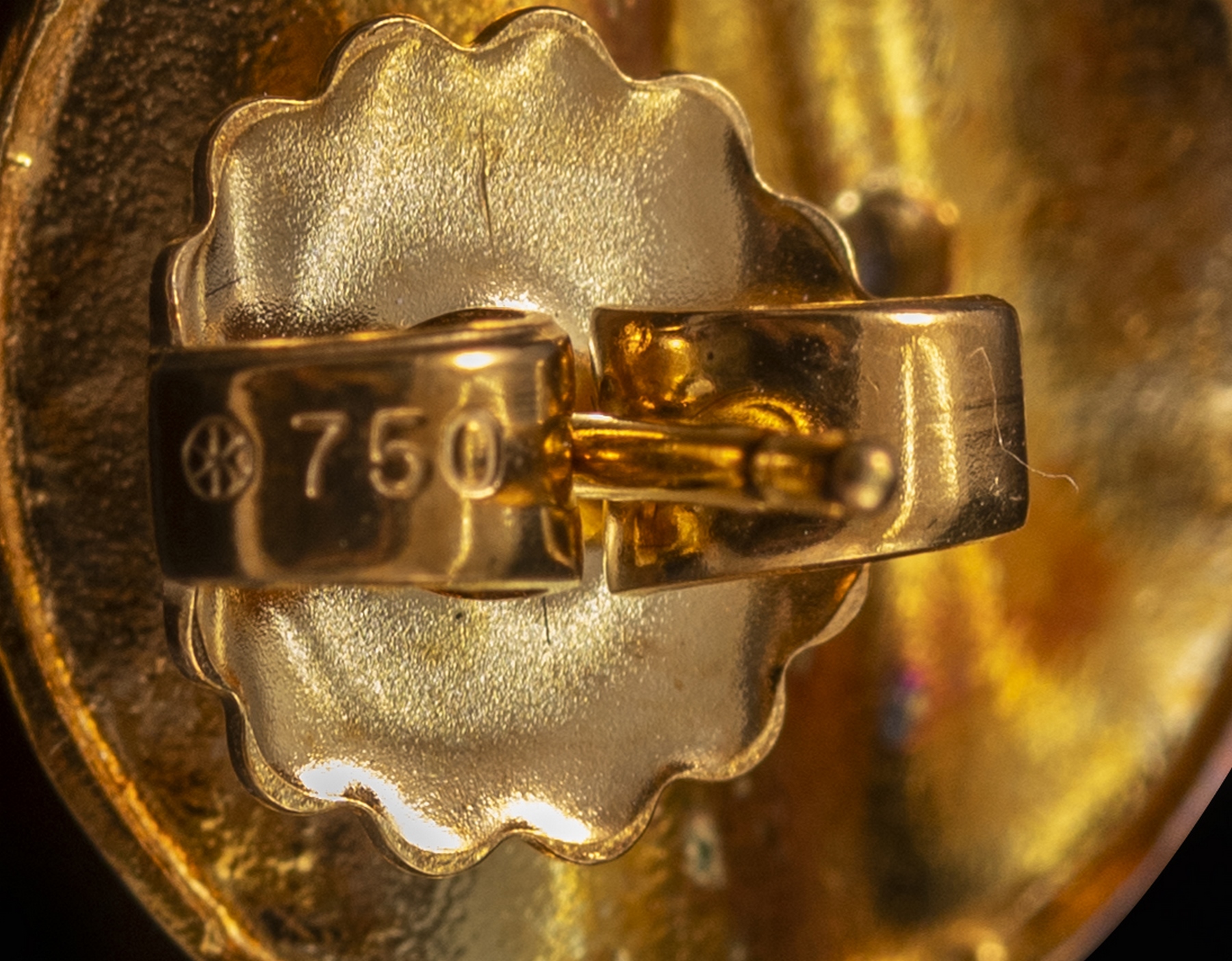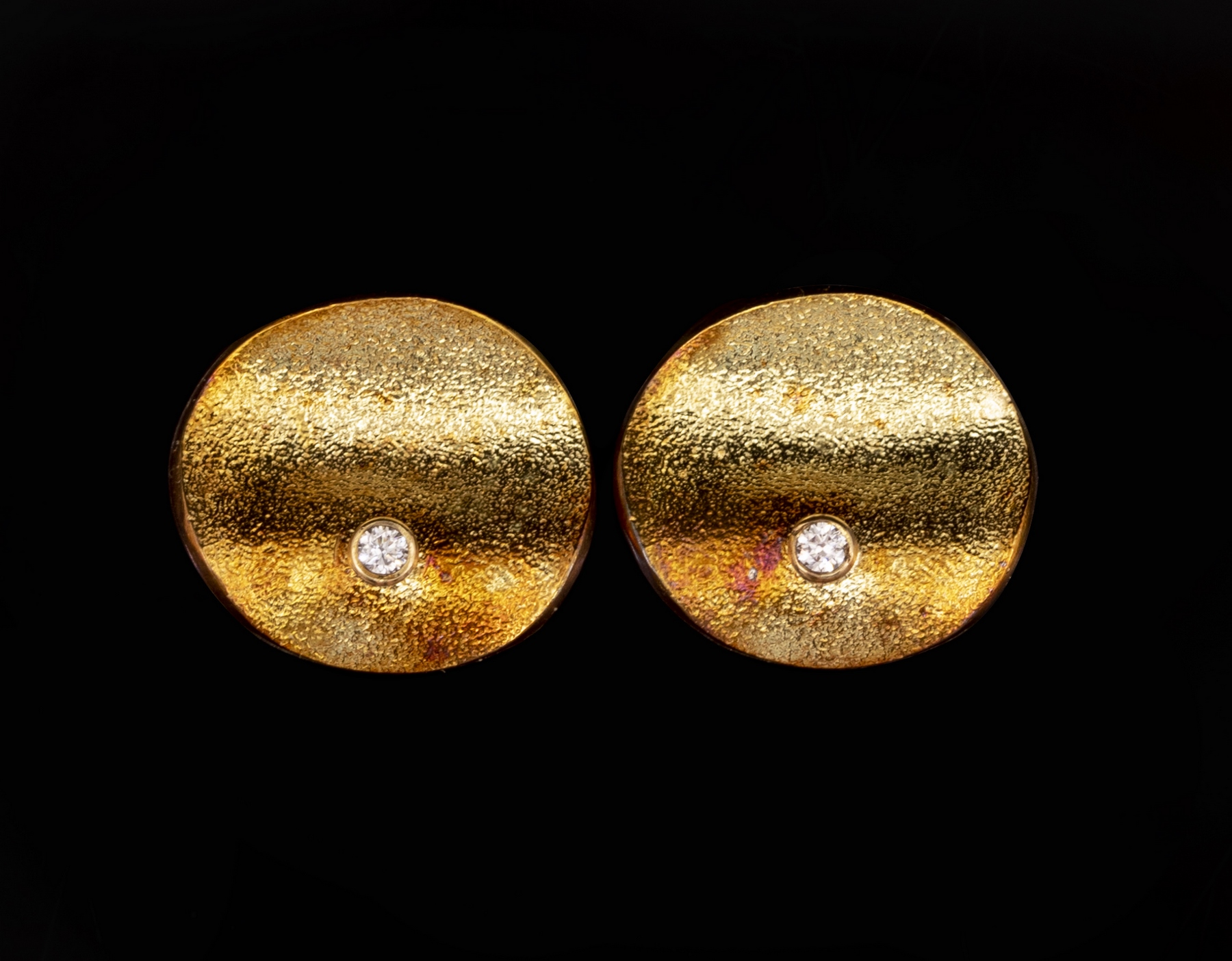 Pair of 14K gold earrings. Set with diamonds. Diameter: 19 mm, total weight: 8 grams. Hallmarked.