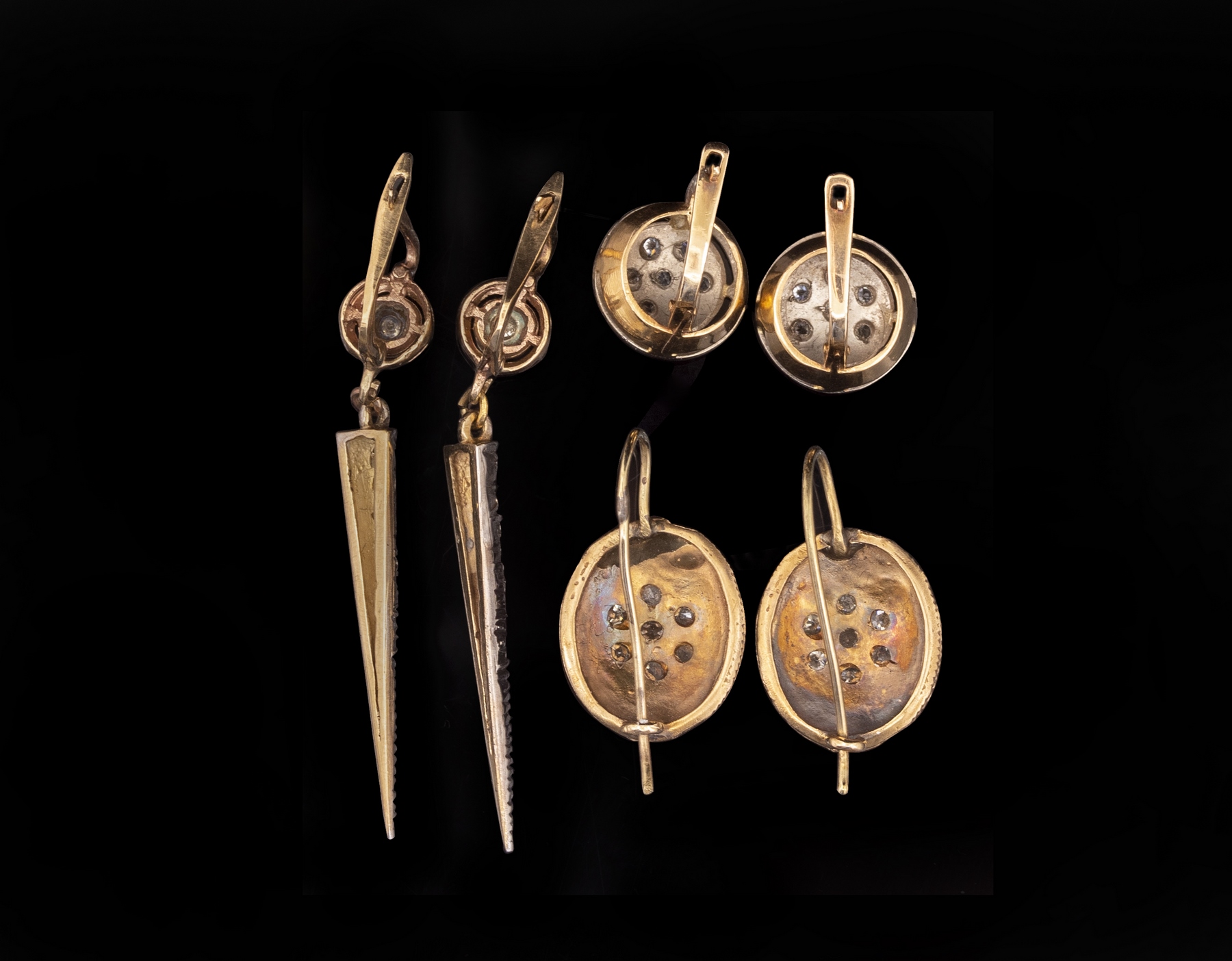 Lot of 3 pairs of 14K gold earrings, set with diamonds, rose cut diamonds and clear stones. Length: 15-45 mm. Total weight: 13.8 grams. Apparently unmarked, gold tested.