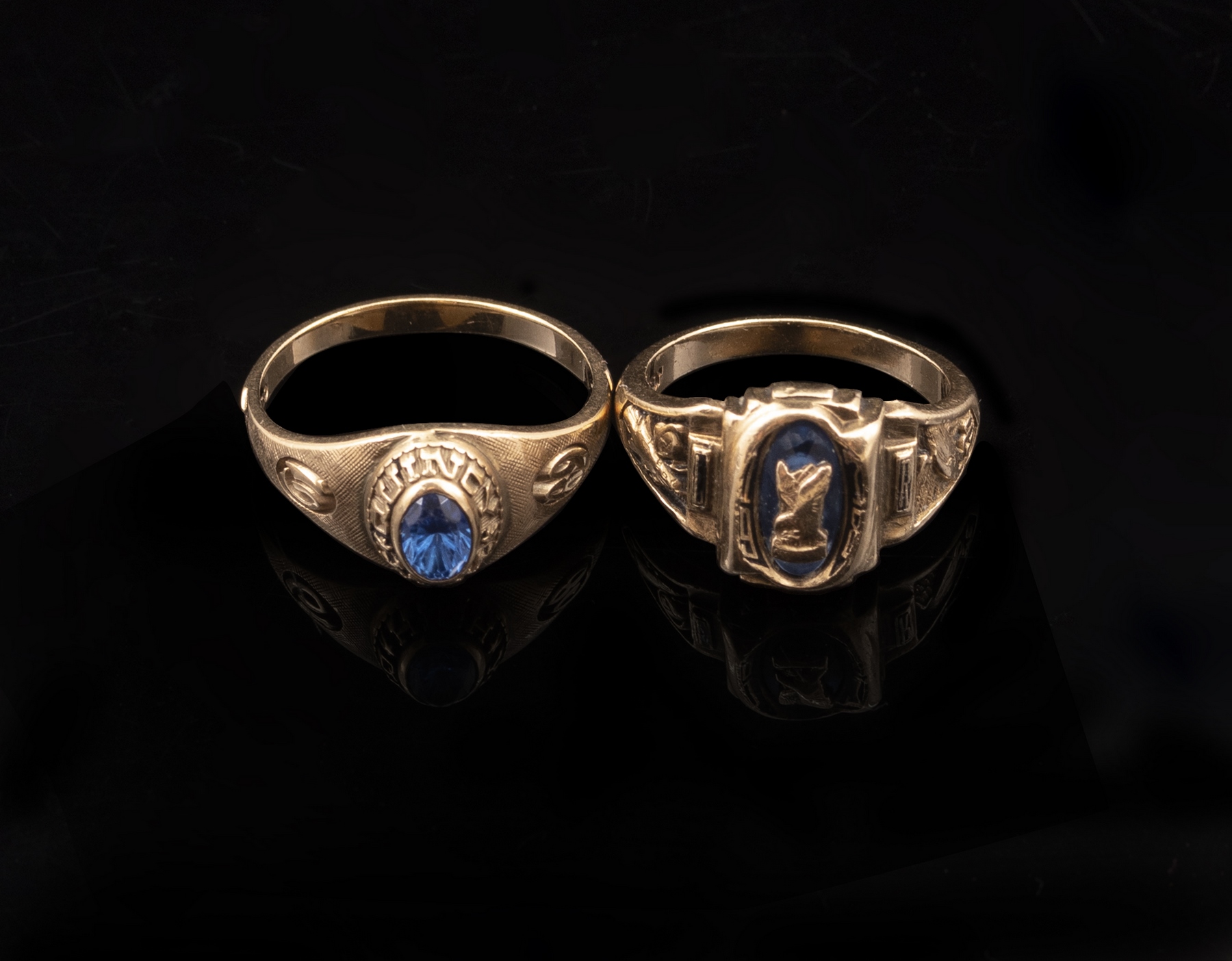 לוט 2 טבעות קולג' מזהב 10K. משובצות אבנים כחולות, אחת משנת 1968 והשנייה 1978. מידה: 5.5, 7.75 US, משקל: 8.4 גרם. חתומות.